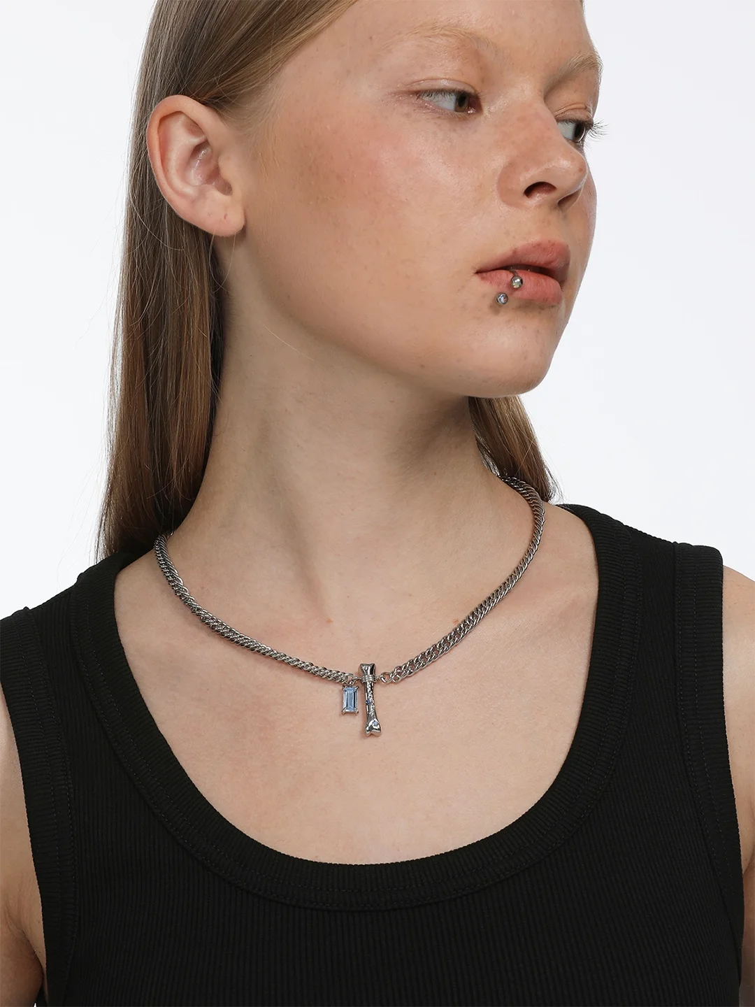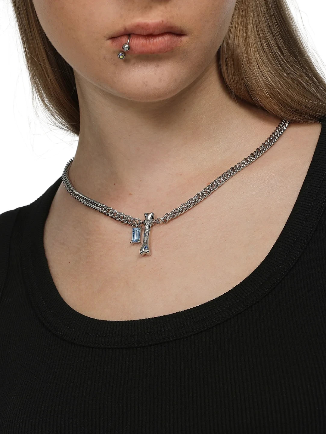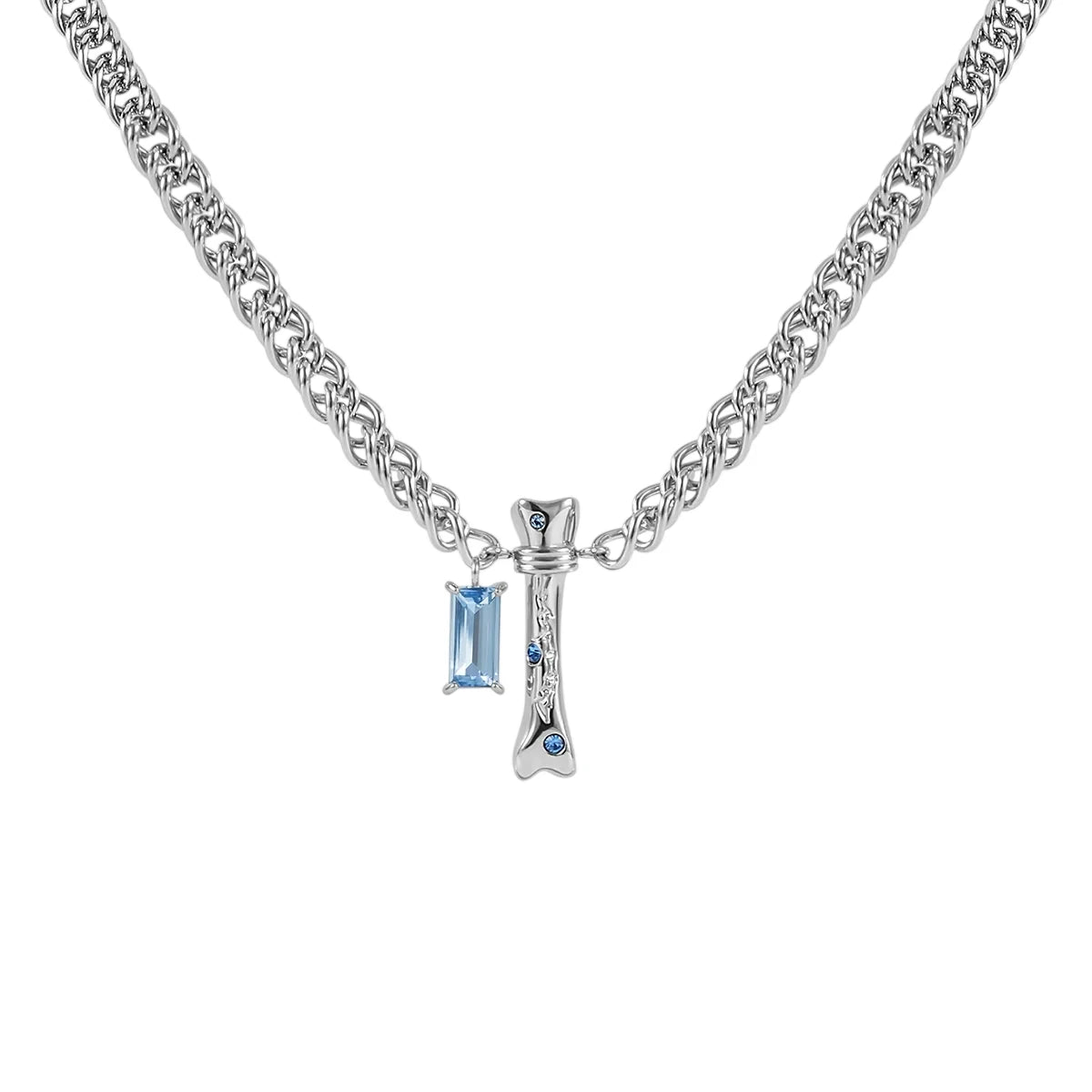 This stylish silver necklace features a unique double pendant design, perfect for men seeking a sweet yet cool fashion statement. One charm is shaped like a bone and embellished with blue rhinestones, while the second is a vertically set rectangular light blue gem. The polished silver chain adds a refined finish, making it an ideal accessory for casual or trendy outfits.