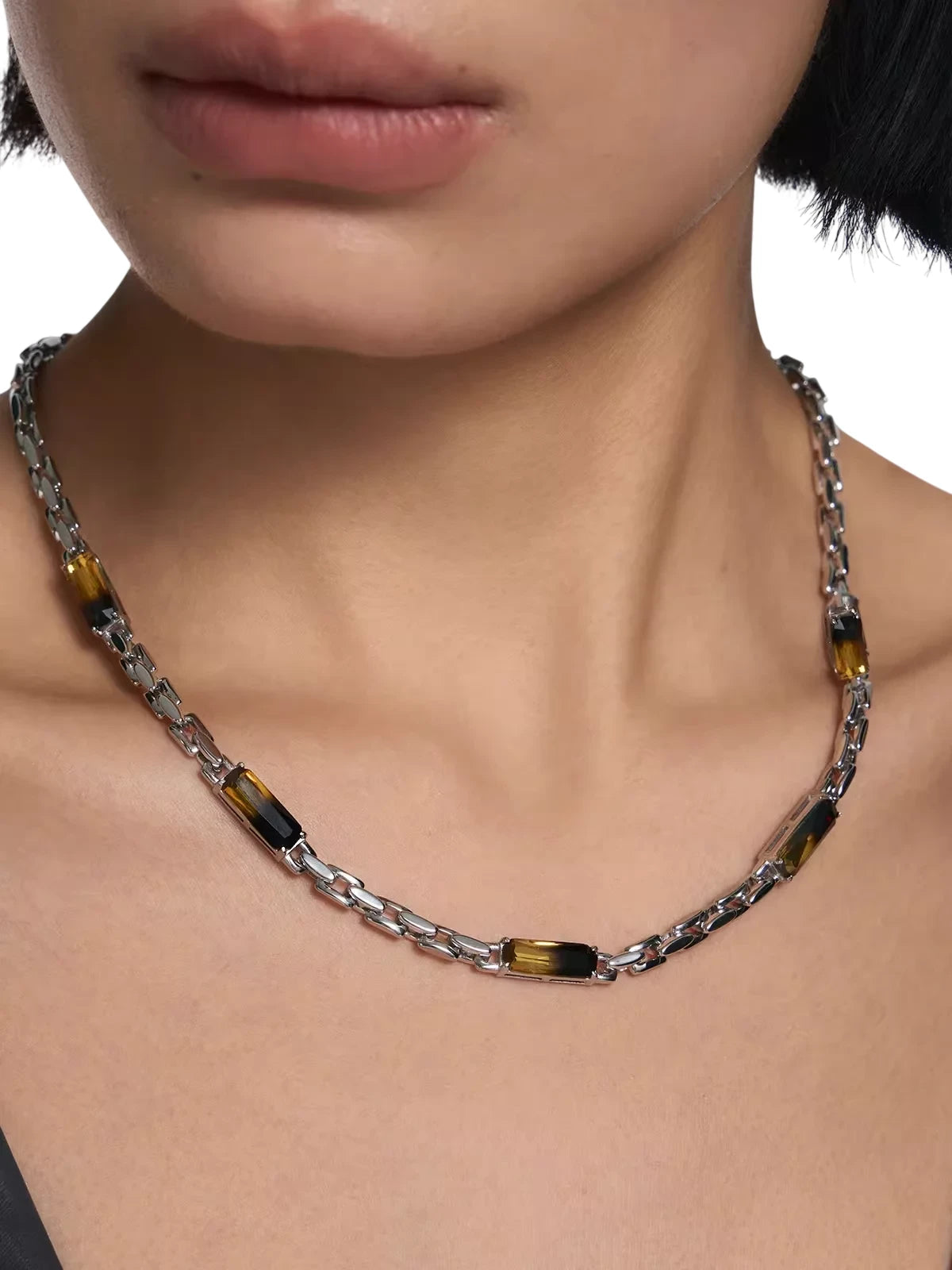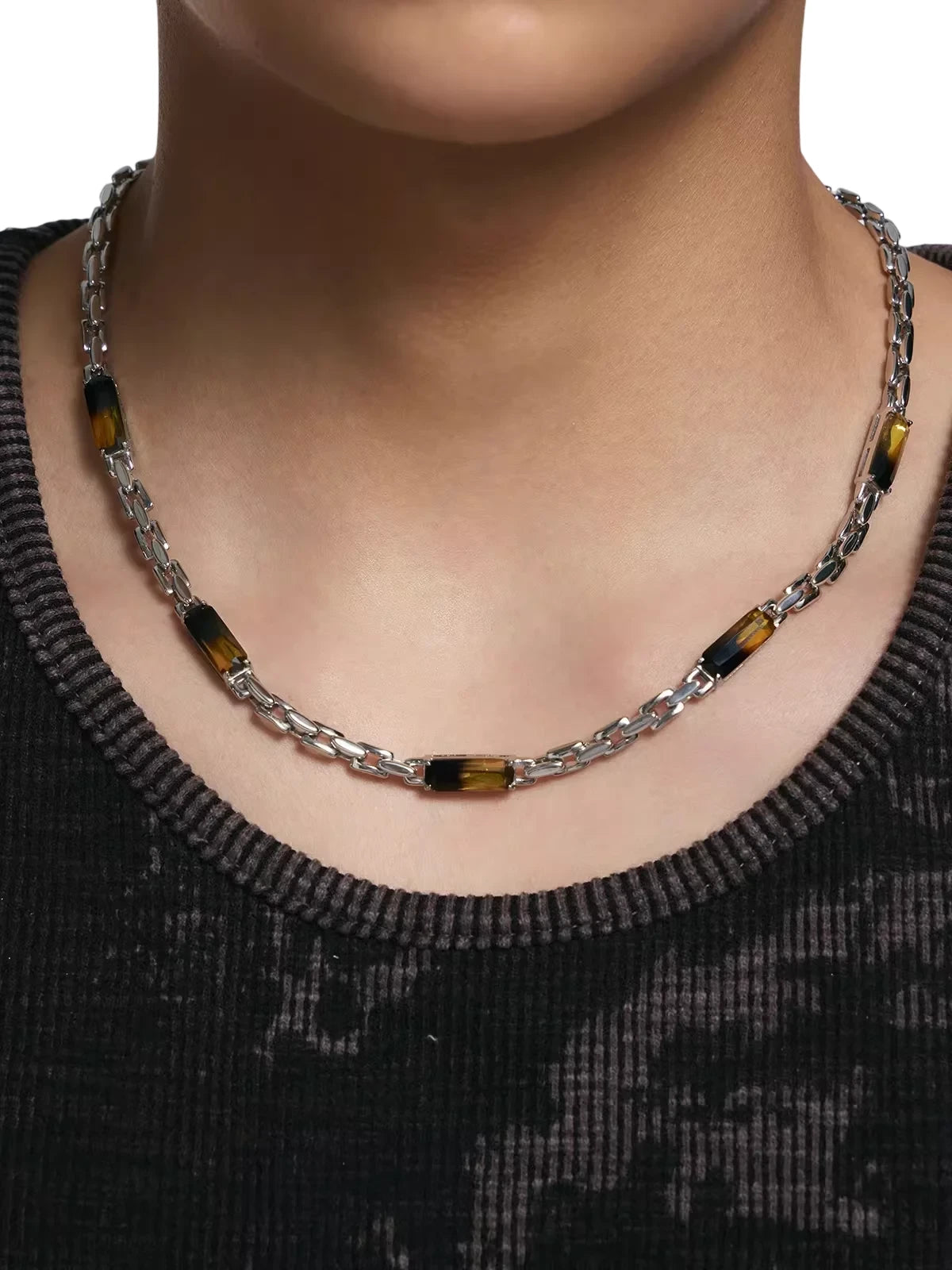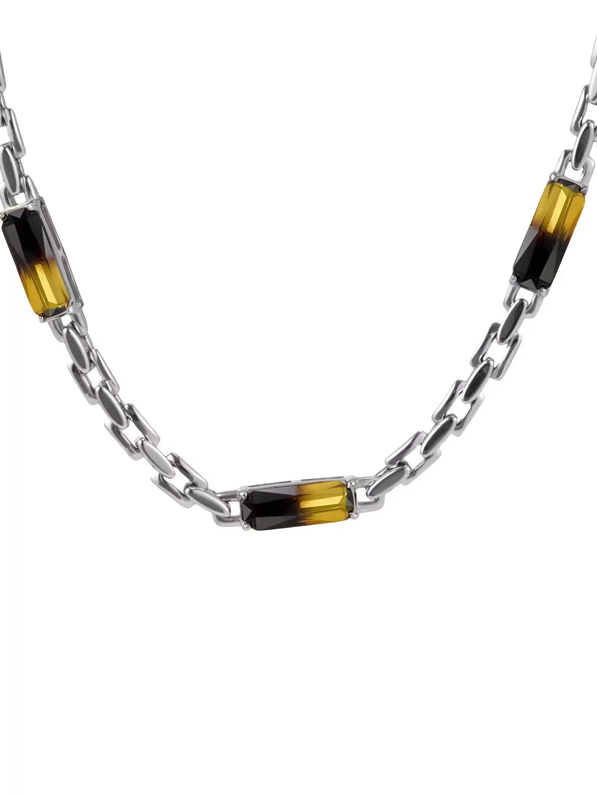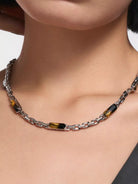 Elevate your look with this unisex handmade necklace featuring a distinctive gradient wave design. Crafted with silver-toned metal links and evenly spaced cylindrical accents in black and gold, this necklace blends modern style with artisanal detail. The adjustable chain ensures a customized fit, making it a versatile accessory for any wardrobe.