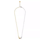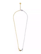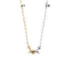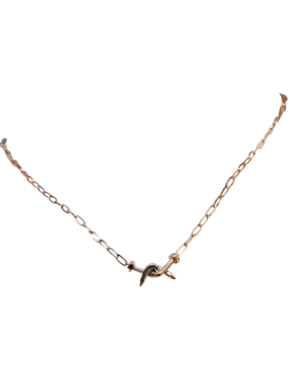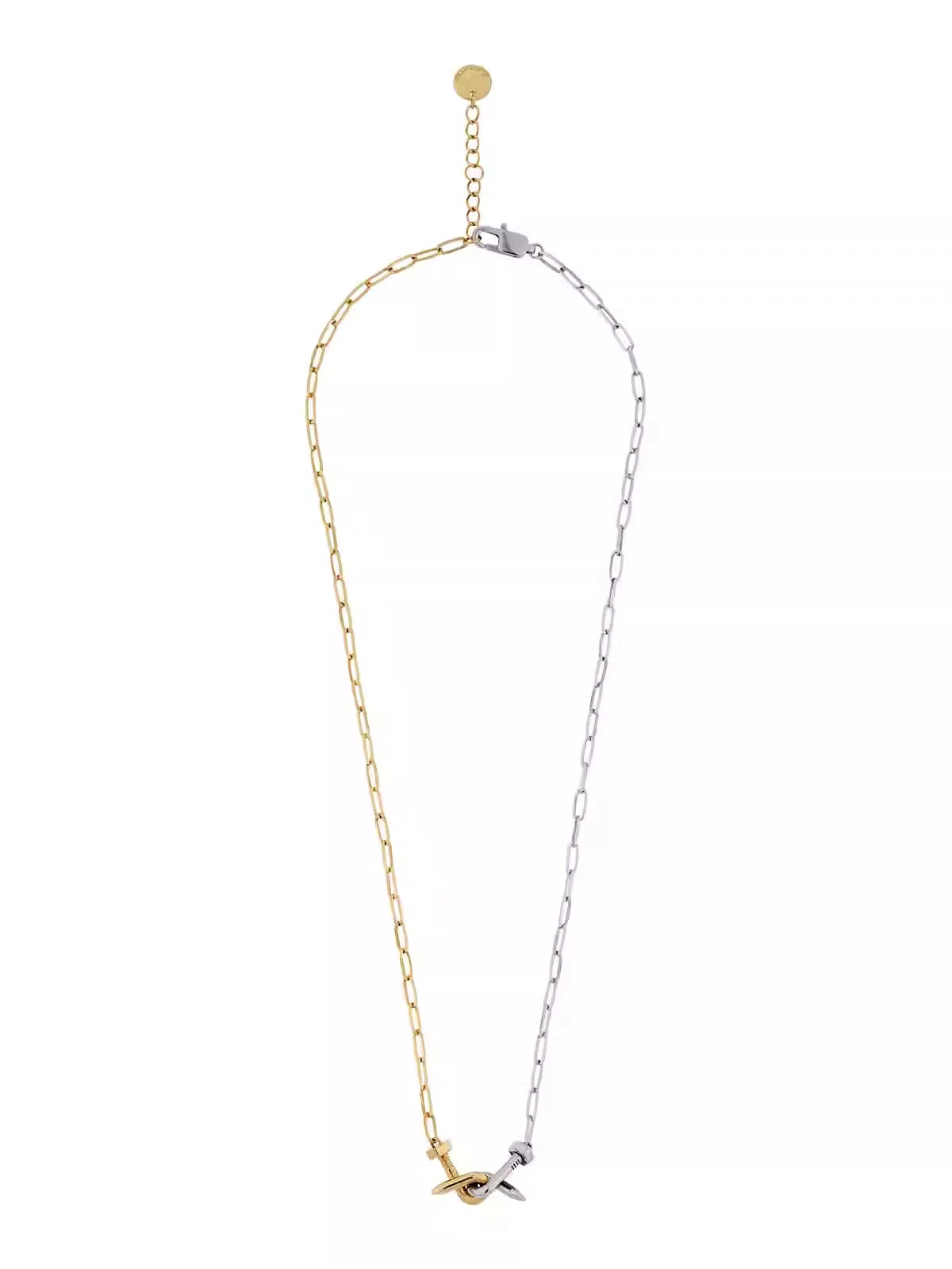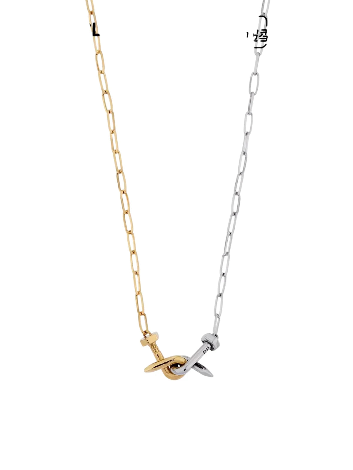 This unisex clavicle necklace features a contemporary two-tone design in gold and silver, crafted from durable titanium steel. The centerpiece showcases a creative twisted nail motif inspired by industrial hardware, blending edgy streetwear flair with modern minimalism. The chain consists of elongated rectangular links, making it a bold accessory suitable for fashion-forward individuals.