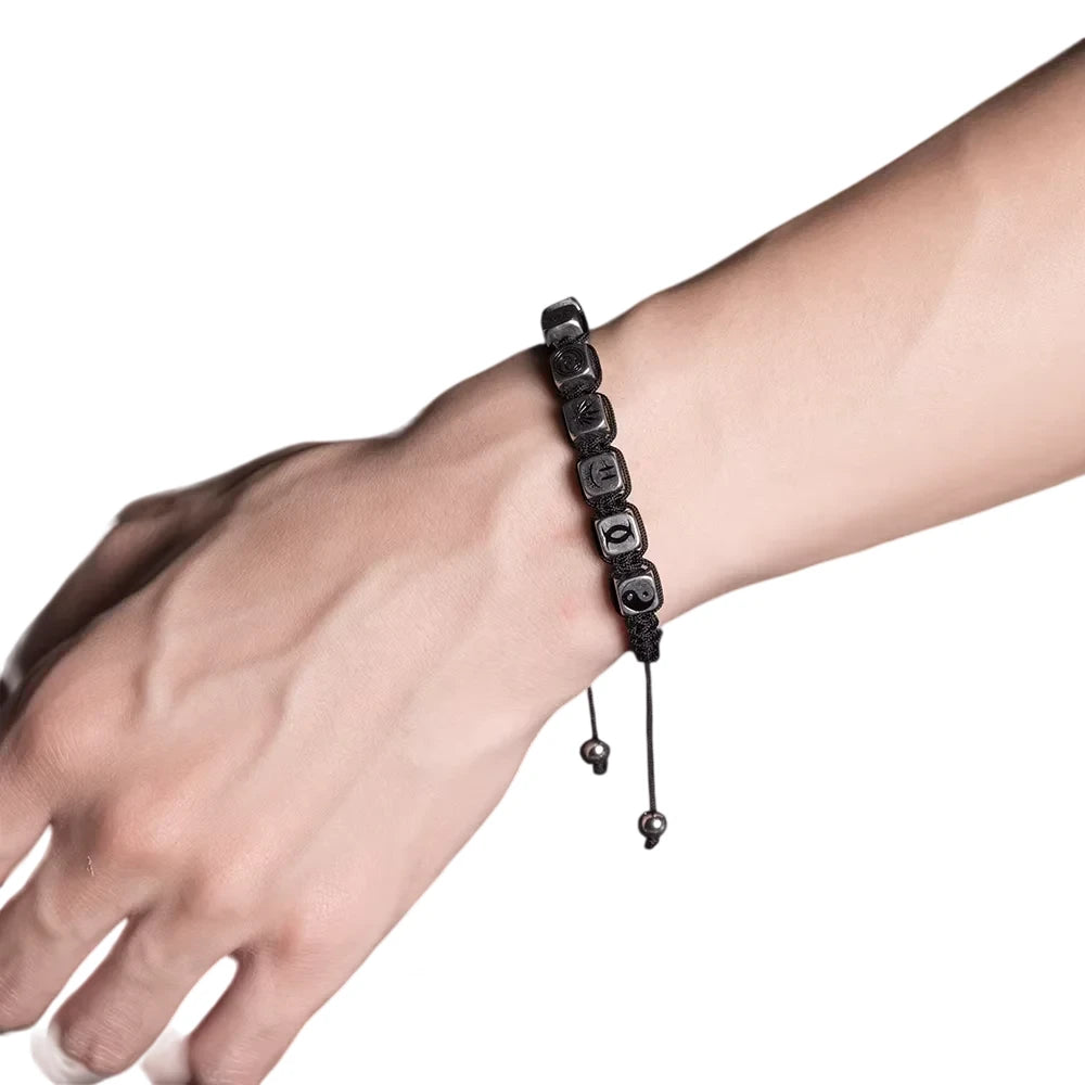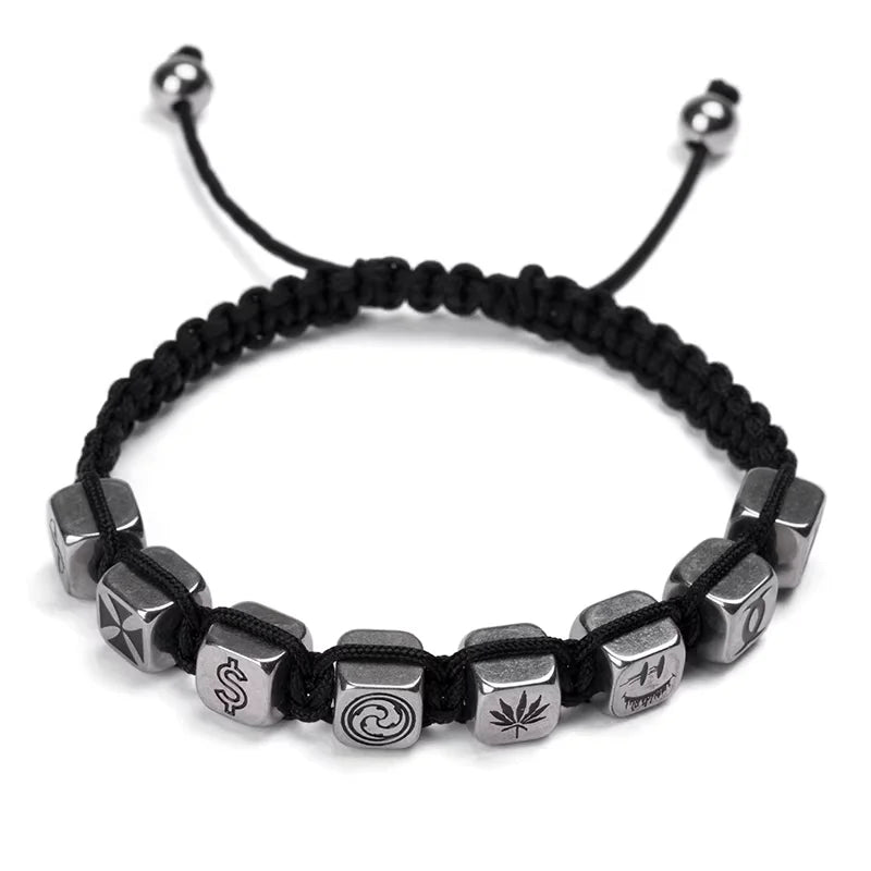 This unisex adjustable bracelet features a sleek black braided cord adorned with cube-shaped metallic beads engraved with unique symbols and patterns. The high-end retro design blends modern street fashion with personalized aesthetic elements, making it a stylish accessory for both men and women. The drawstring closure ensures a comfortable and customizable fit for daily wear or special occasions.