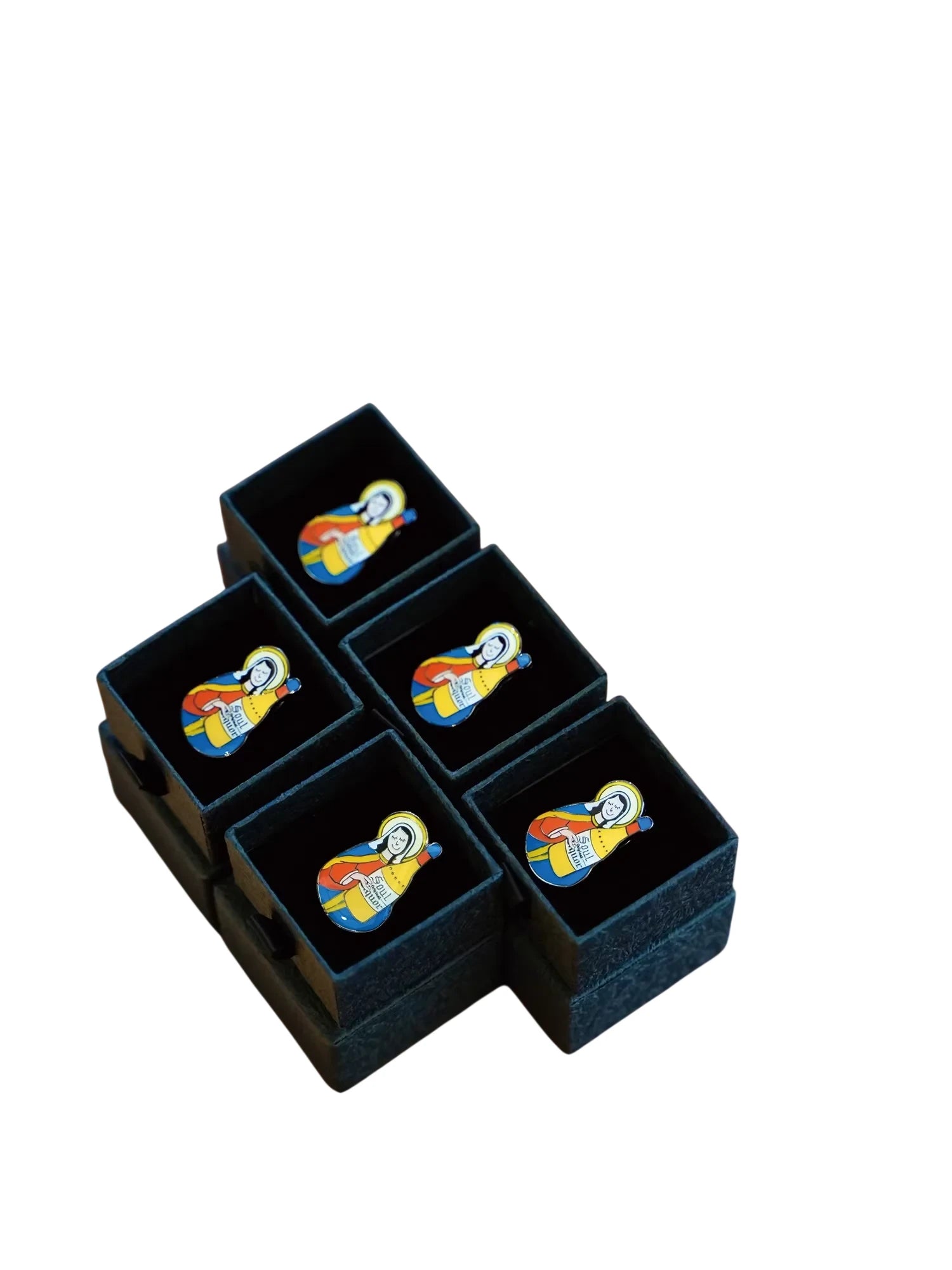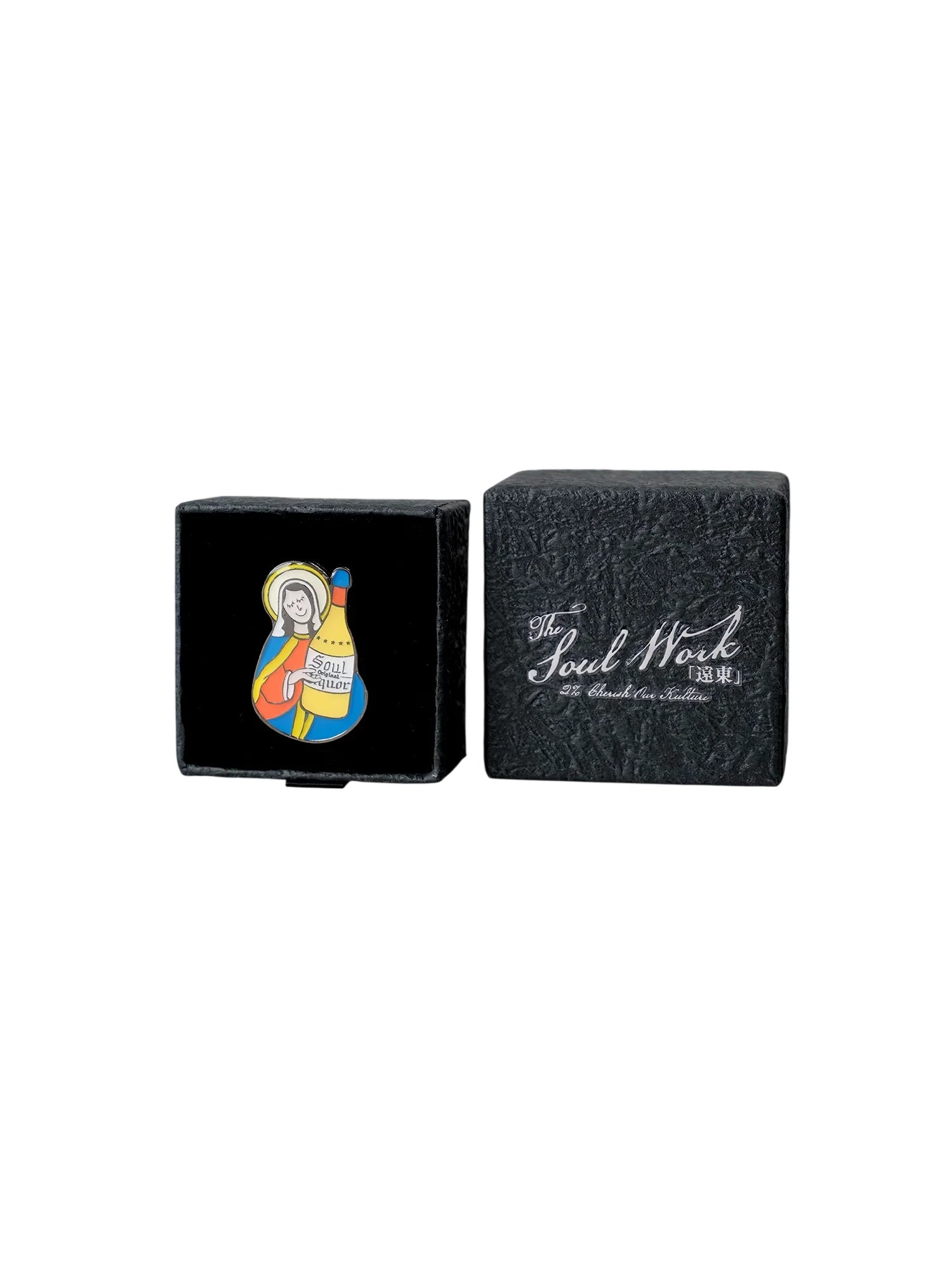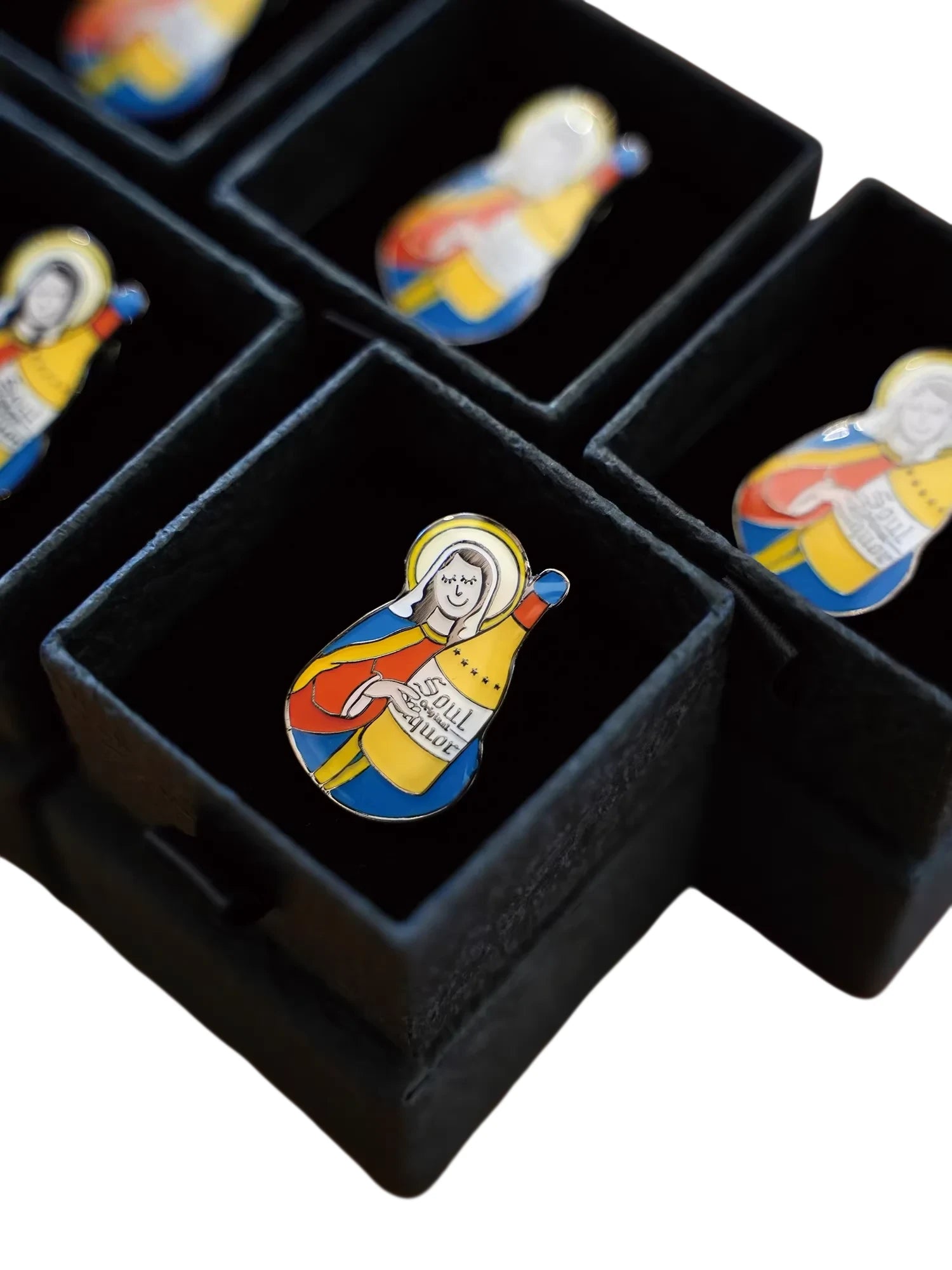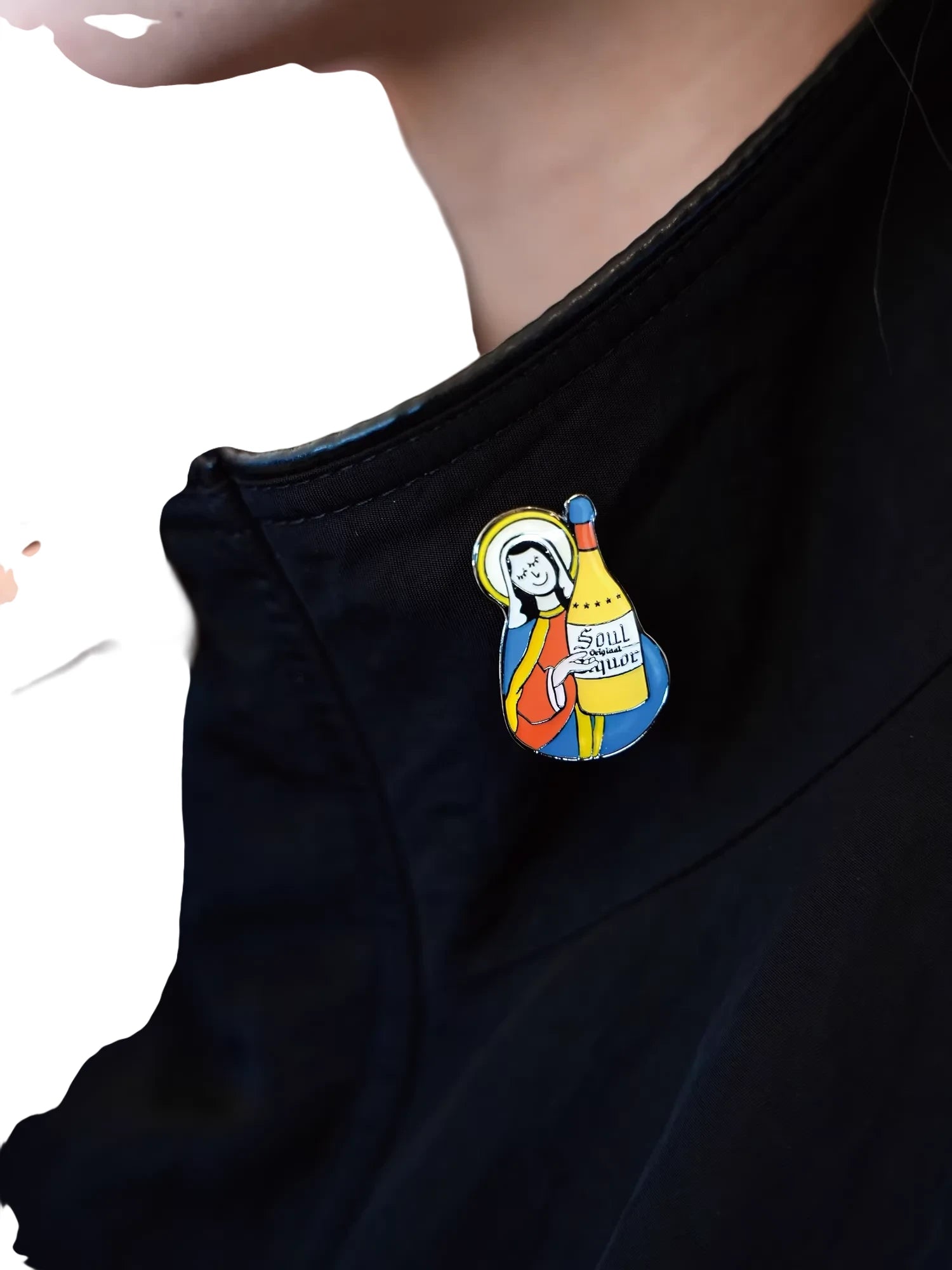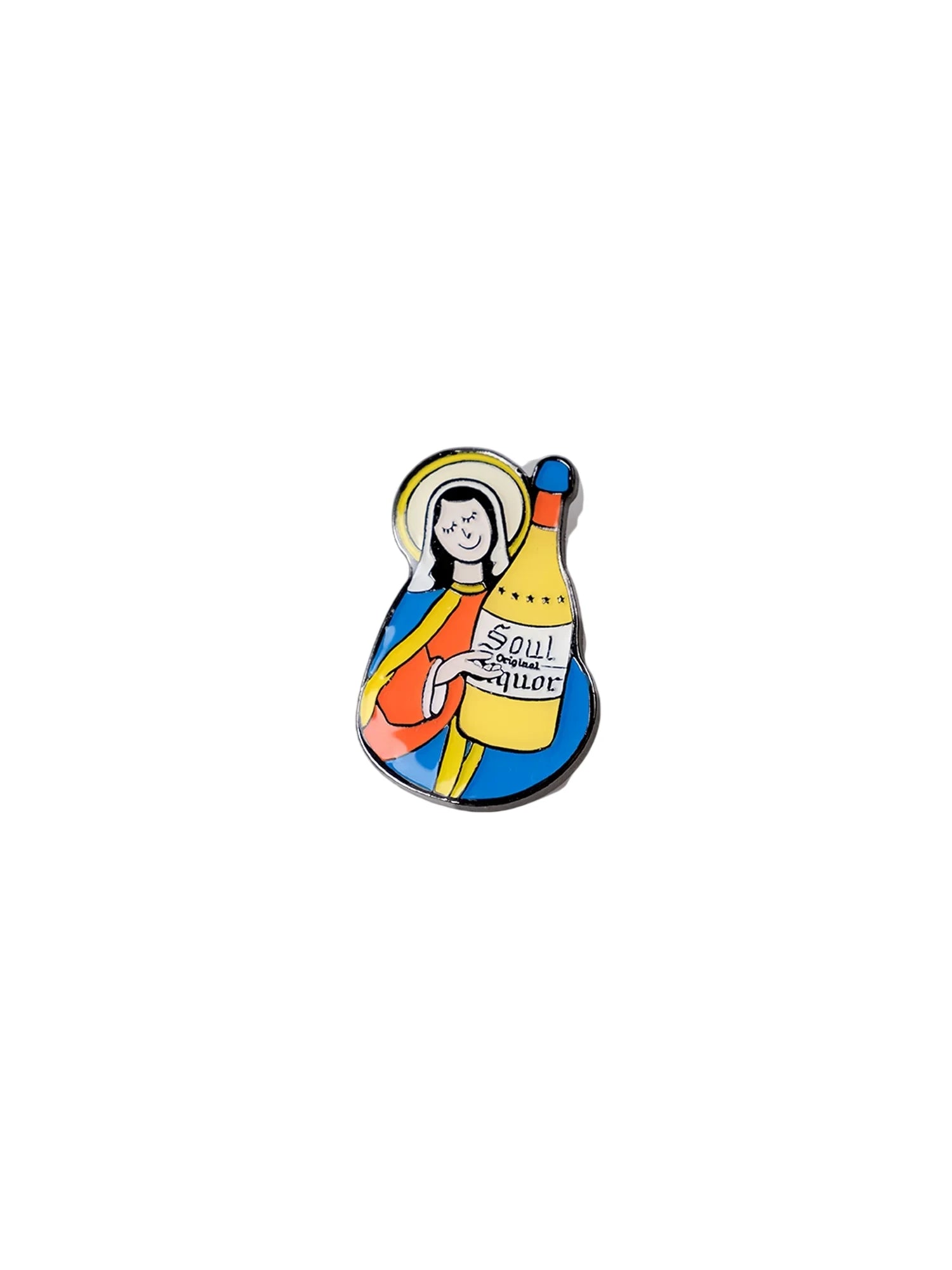 This unique enamel metal brooch features a vibrant, retro-inspired design depicting a stylized female religious figure holding a yellow bottle labeled 'SOUL liquor.' Crafted with colorful red, blue, yellow, and white enamel details, the brooch blends street style with pop art influences.