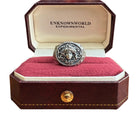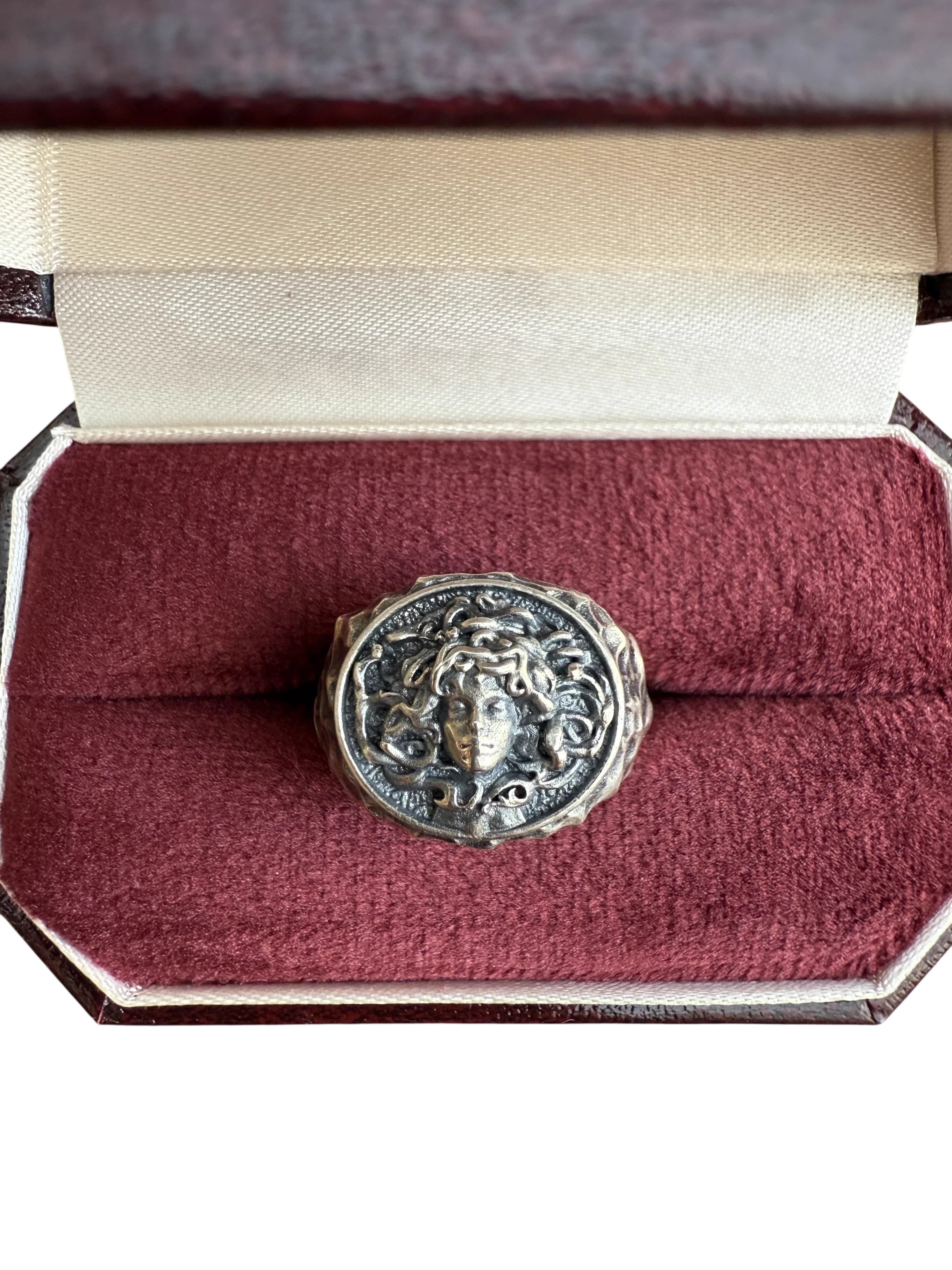 This handcrafted silver ring features an intricately carved Medusa head surrounded by swirling snake motifs, embodying a bold and mythological aesthetic. The hammered finish adds a unique, avant-garde texture to the piece, making it a striking accessory for those who appreciate fine craftsmanship and unconventional design. Part of the 'Demon Season' collection, this artistic ring combines elegance with myth-inspired symbolism. Suitable for all genders, it is presented in a luxurious maroon and cream jewelry box with a red velvet interior.