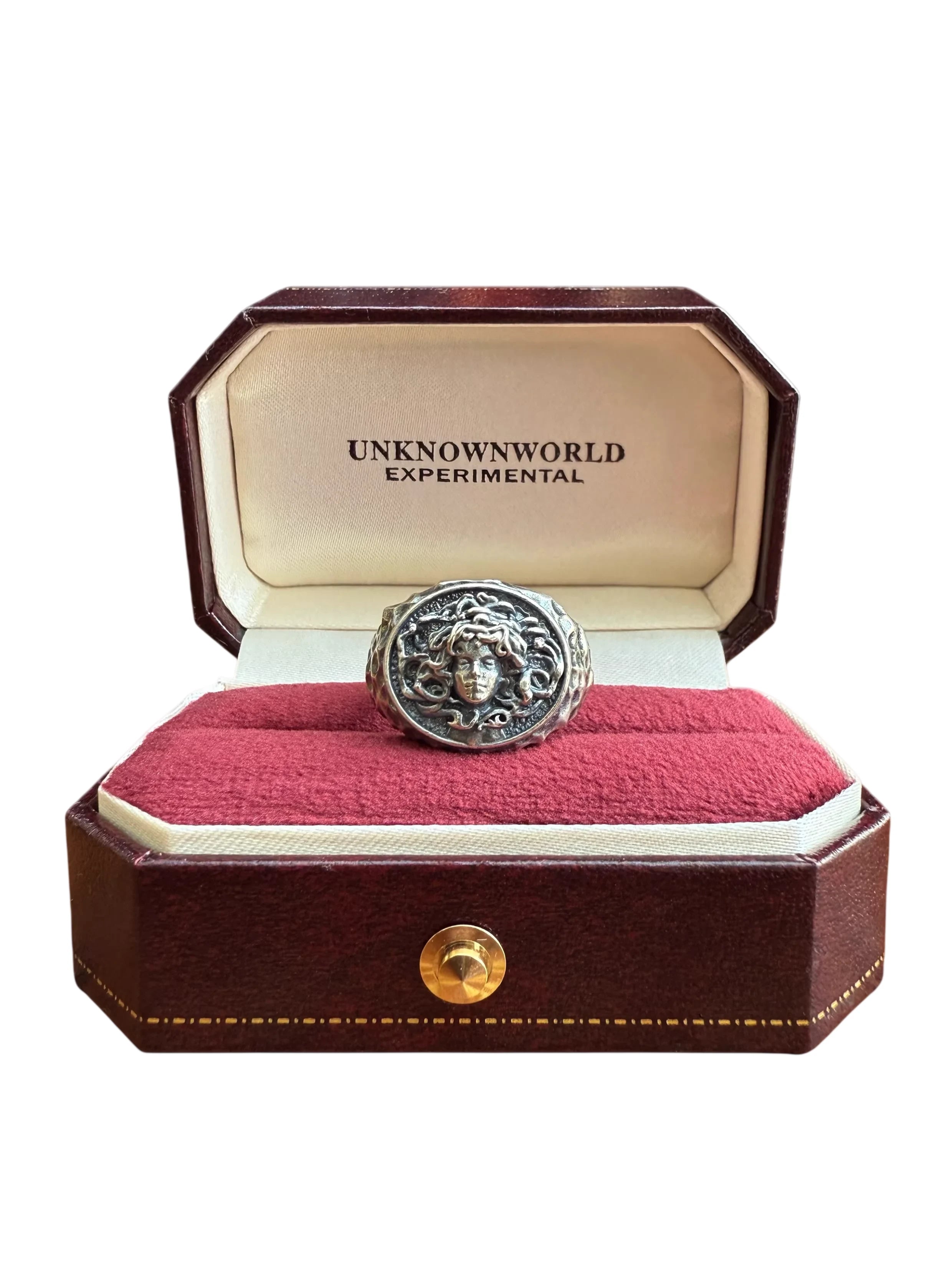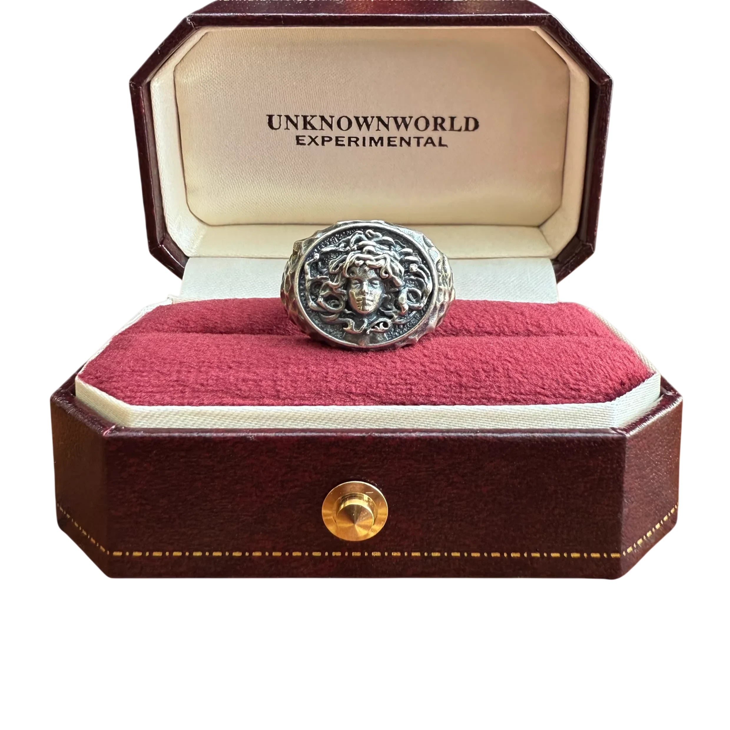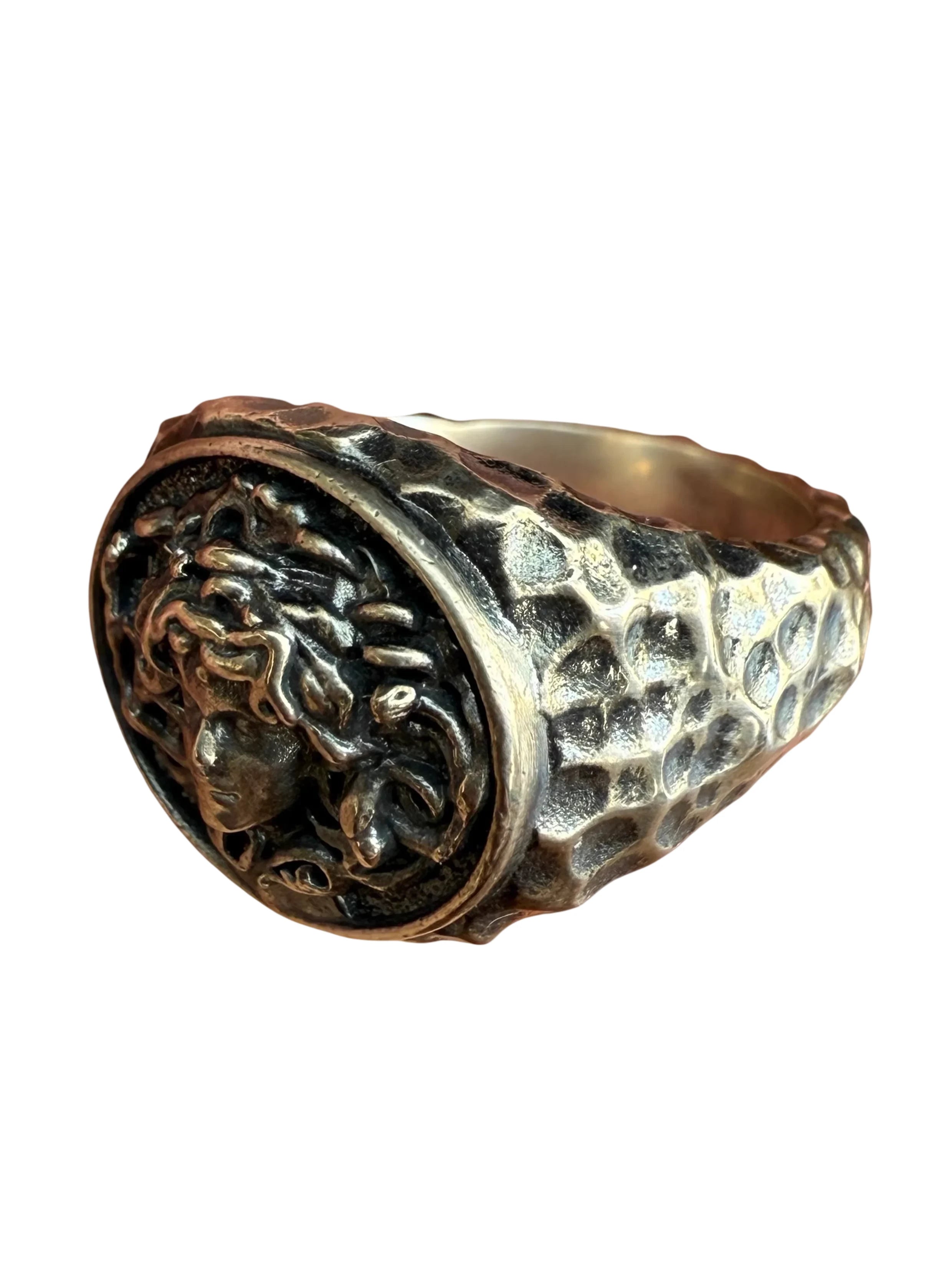 UNKNOWNWORLD Handcrafted Silver Ring with Medusa Head and Hammered Finish
