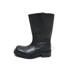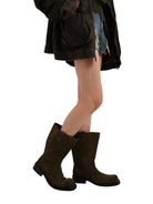 Step into timeless style with these classic military-inspired wide-leg boots, crafted for men. Designed in a rugged mid-calf silhouette, they feature distressed dark brown leather for a vintage, worn-in look. A sturdy black rubber sole with a low block heel provides durability and comfort, while a rounded toe and minimalistic stitching add understated sophistication.