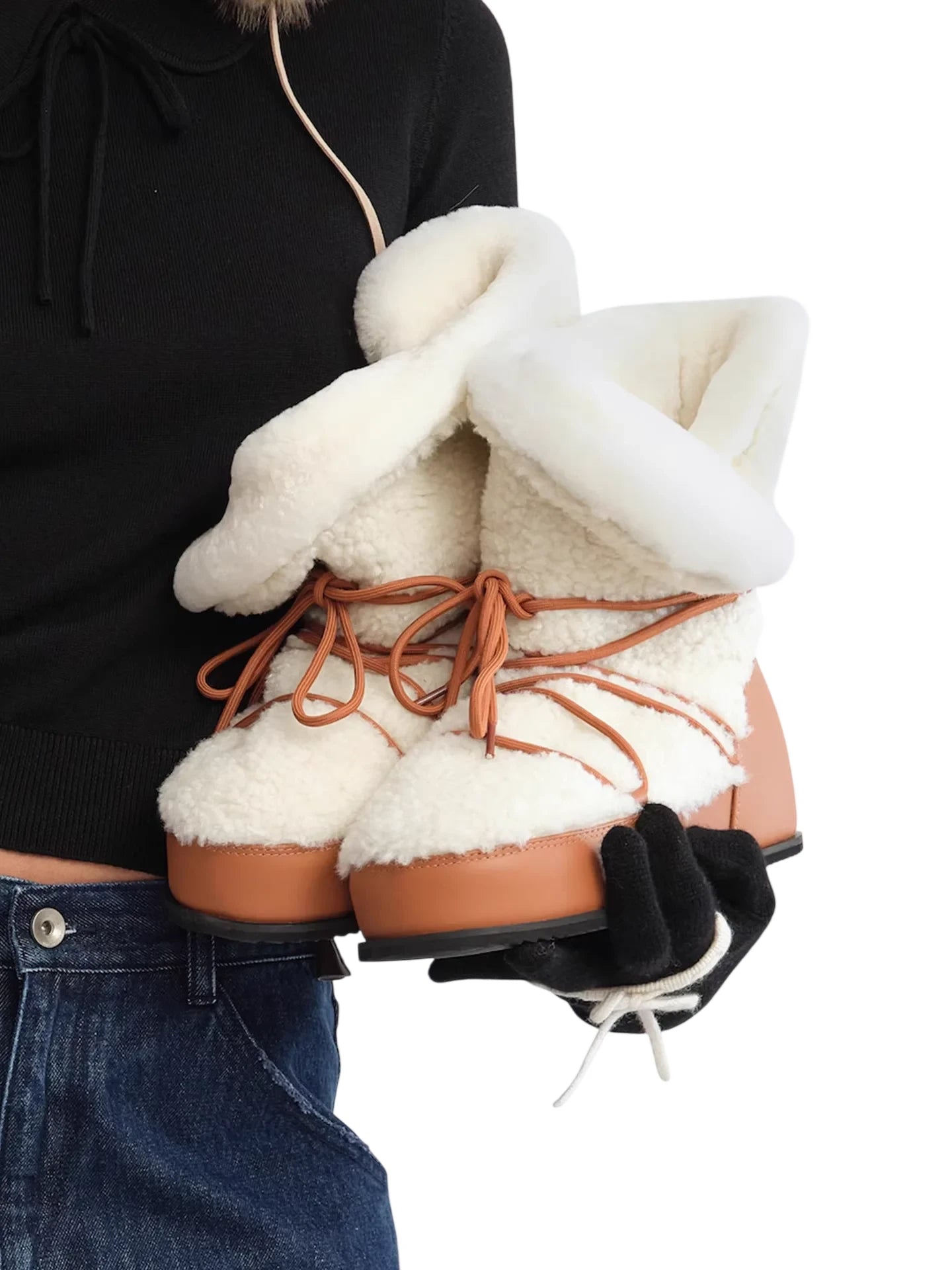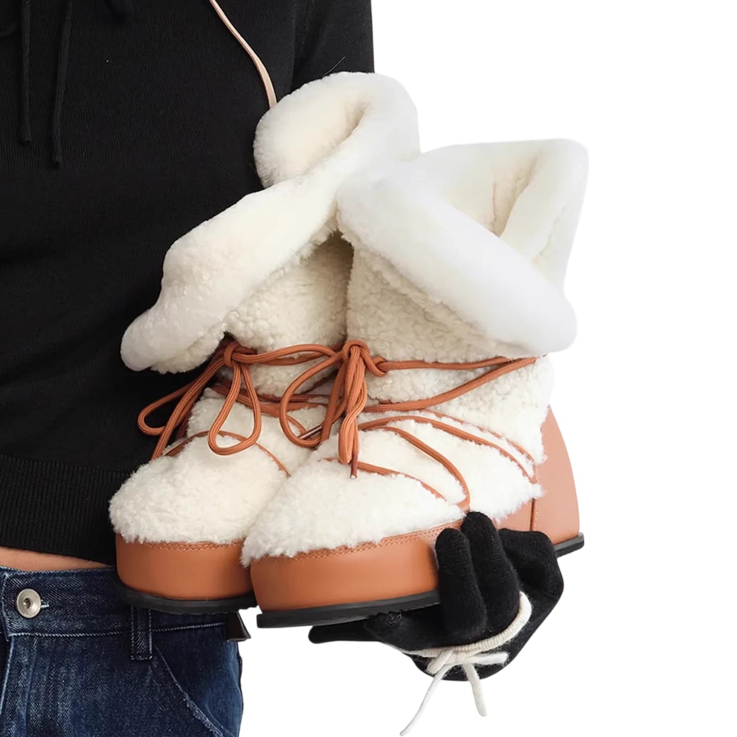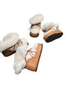 Stay warm and stylish this winter with these women's hidden wedge snow boots. Featuring a thick sole for added height and insulation, these boots are designed with a cozy cream-colored sherpa exterior and fold-over top for maximum comfort. The tan-brown leather accents and crisscross lace-up front add a fashionable touch while ensuring a secure fit. Ideal for cold weather, these furry boots offer both functionality and chic seasonal style.