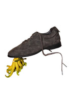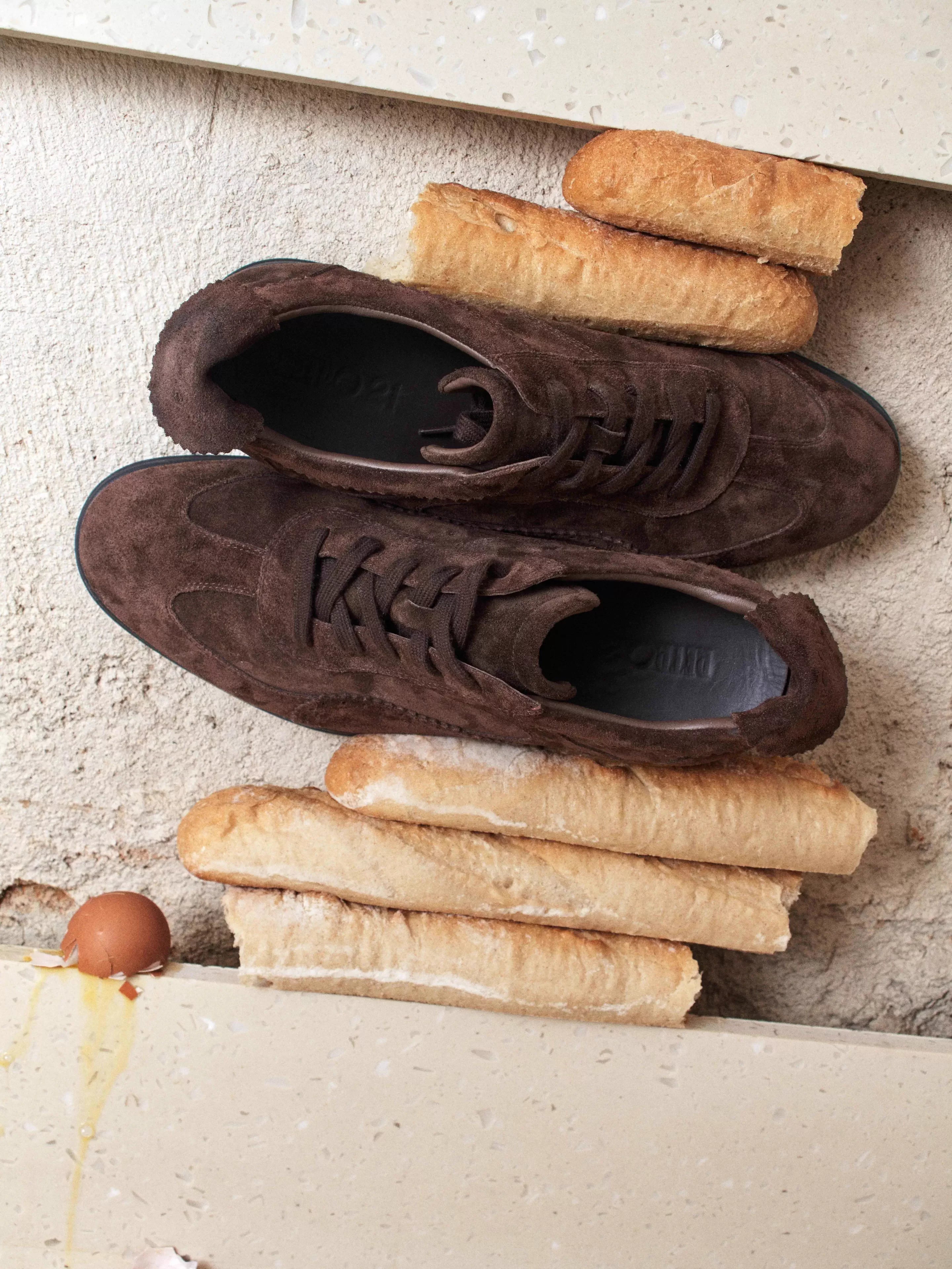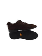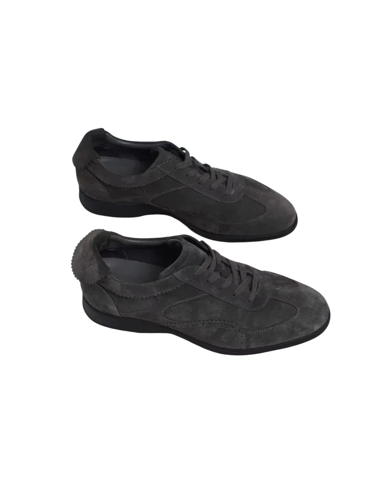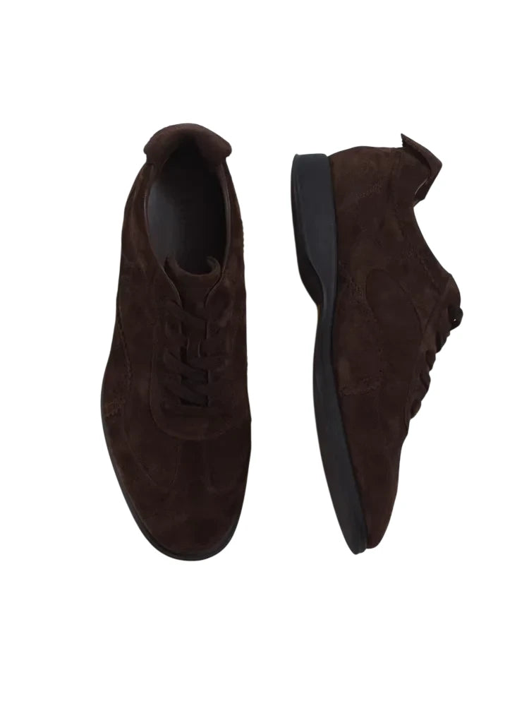 Elevate your casual wardrobe with these men's suede brogue sneakers, crafted from high-quality calf suede leather. Featuring classic brogue detailing and a sporty design, these lace-up shoes offer a modern silhouette with contrast stitching and a durable black rubber sole. The low-top profile provides comfort and versatility, making them perfect for everyday wear with a stylish edge.