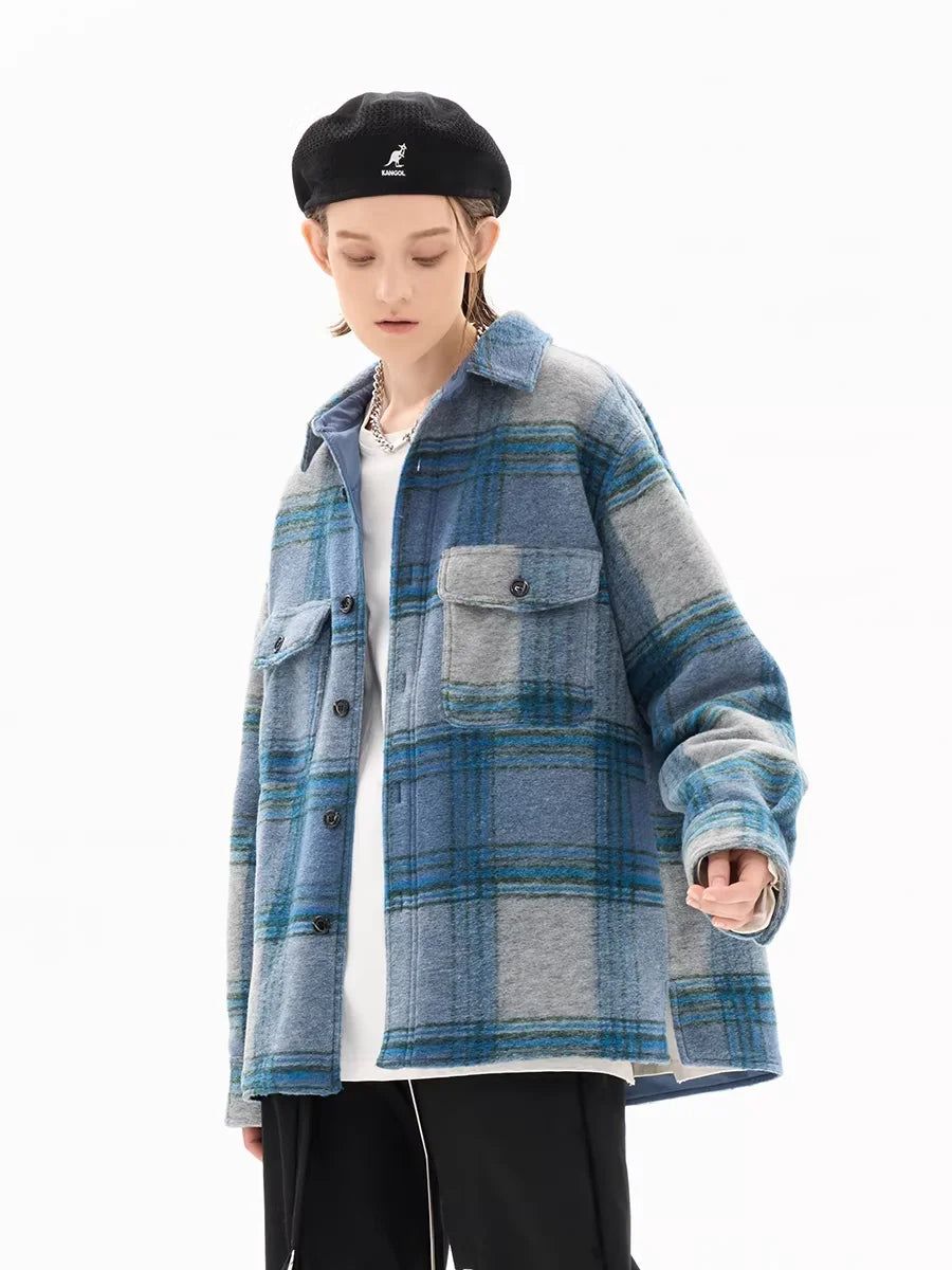 Embrace timeless style with this unisex winter overshirt featuring a classic blue and grey plaid pattern. Crafted with a cozy woolen texture and suede-like finish, it offers both warmth and retro-inspired charm. The oversized, long-sleeve design includes a button-up front and two chest flap pockets, creating a versatile and comfortable look perfect for layering.