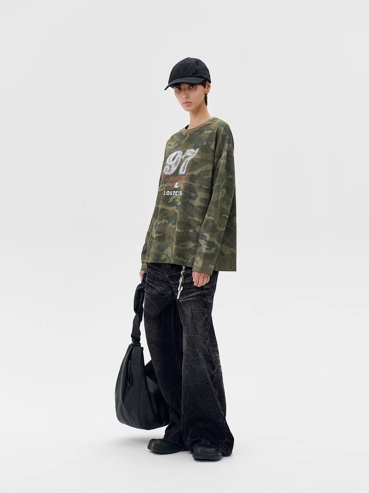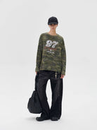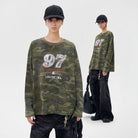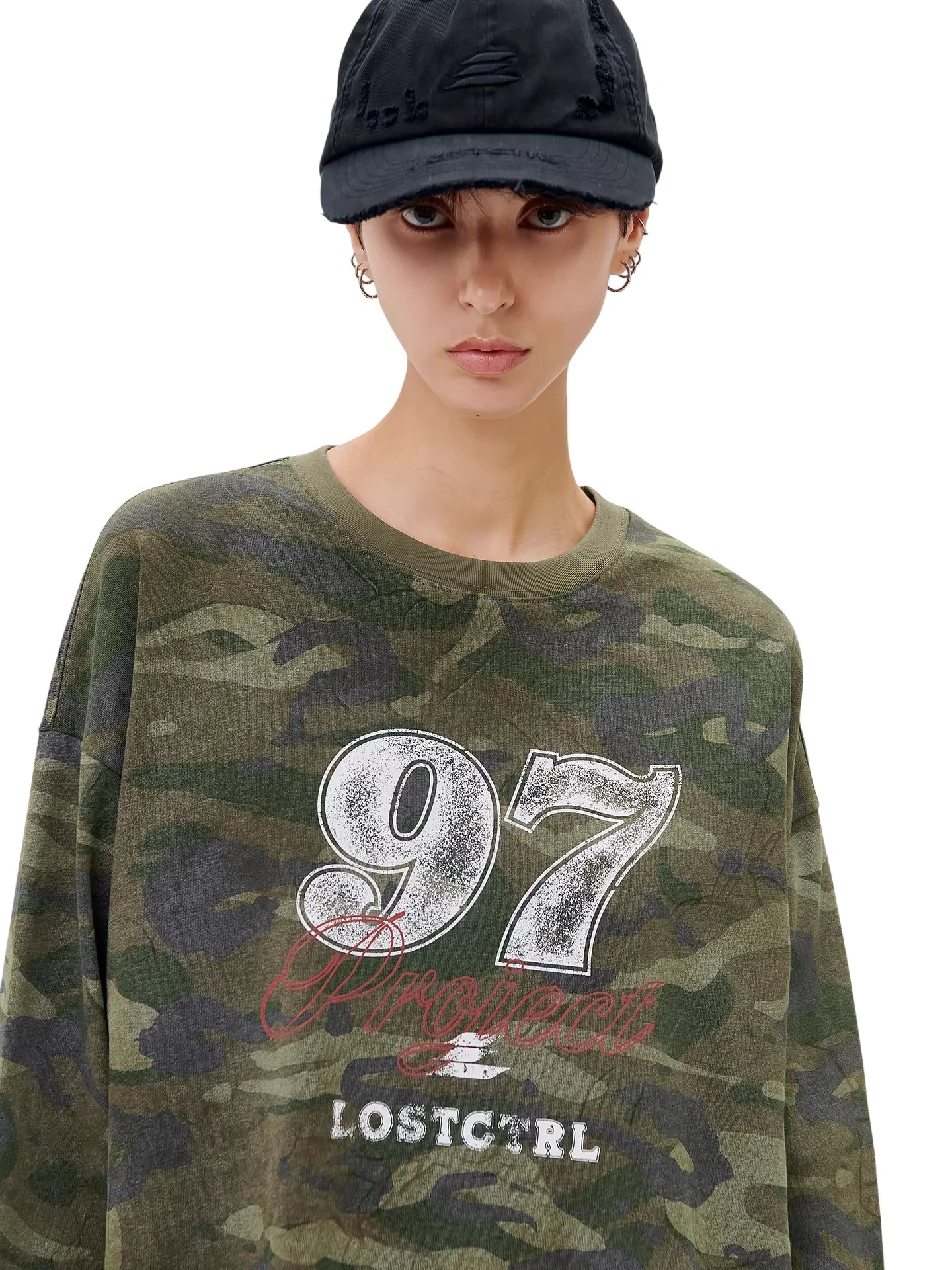 Embrace streetwear style with this unisex long sleeve T-shirt featuring a bold camouflage print in earthy green tones. Designed with a relaxed, oversized fit, it showcases a striking '97' white graphic on the front, accented by red and white stylized text reading 'Project' and 'LOSTCTRL' beneath. Crafted for comfort and edge, this crew neck sweatshirt is ideal for casual wear in early autumn. Modeled by a female, it pairs effortlessly with textured black pants and minimal accessories for a modern urban look.