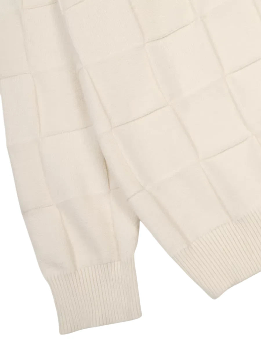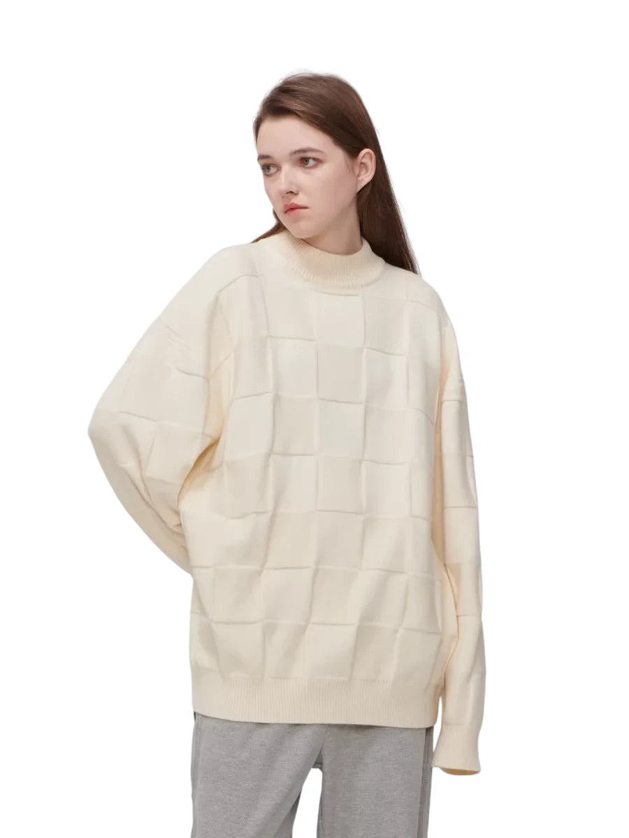 Stay warm and stylish with this unisex checkered knit sweater, perfect for autumn and winter seasons. Designed with a cozy crew neck and an oversized fit, this pullover features a textured cream-colored knit with a subtle grid pattern. The long sleeves add extra comfort, while the relaxed silhouette gives it a casual and timeless appeal.