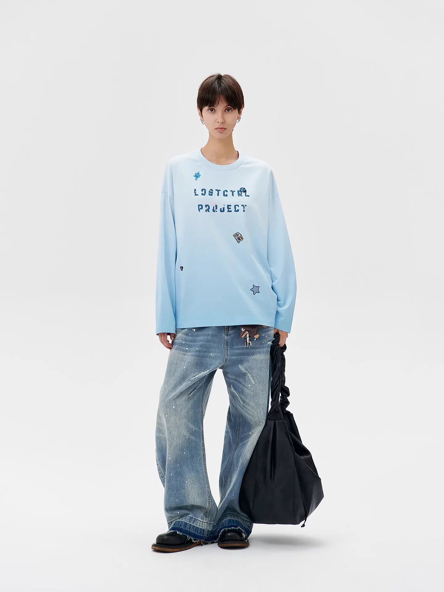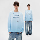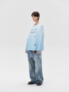 Elevate your casual wardrobe with this unisex oversized long sleeve top, designed in a soft gradient light blue hue for a relaxed, retro-inspired look. Made from a comfortable knitted fabric, this t-shirt features playful cartoon-style patch graphics including a flower, mobile phone, and stars, along with bold text reading 'LOSTCTRL PROJECT' across the front. The loose fit, dropped shoulders, and full-length sleeves provide effortless style and comfort, perfect for early autumn wear. Shown styled on a female model with distressed denim jeans, this top adds a youthful and fun element to any outfit.