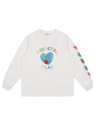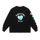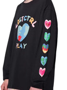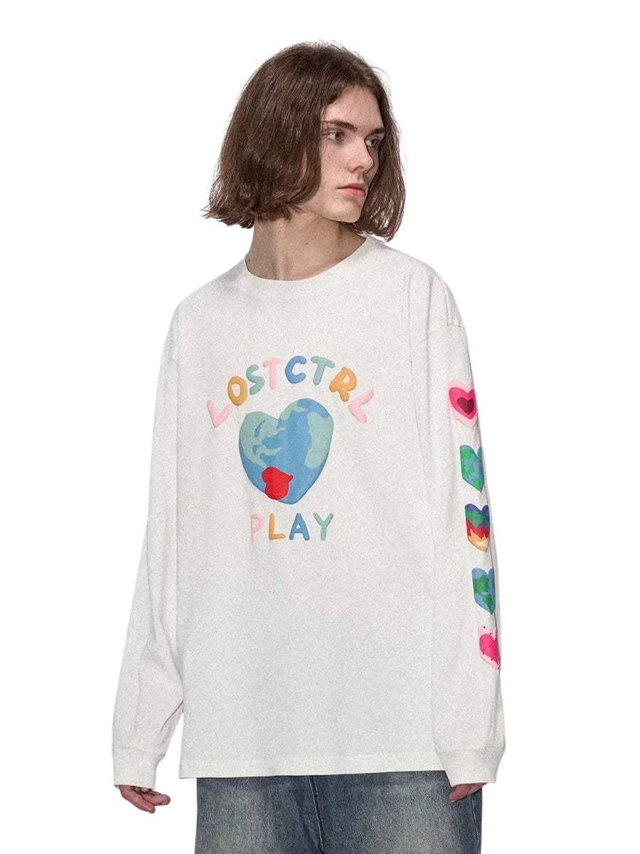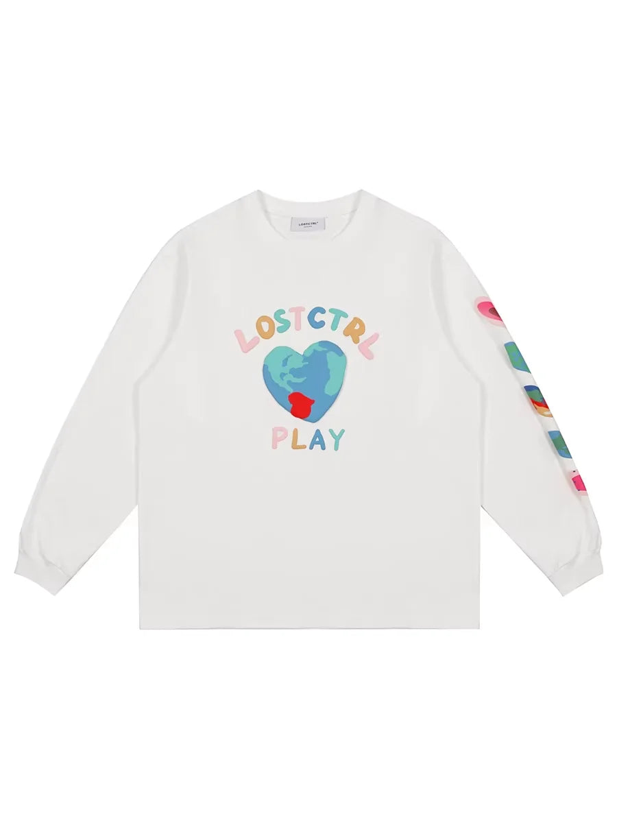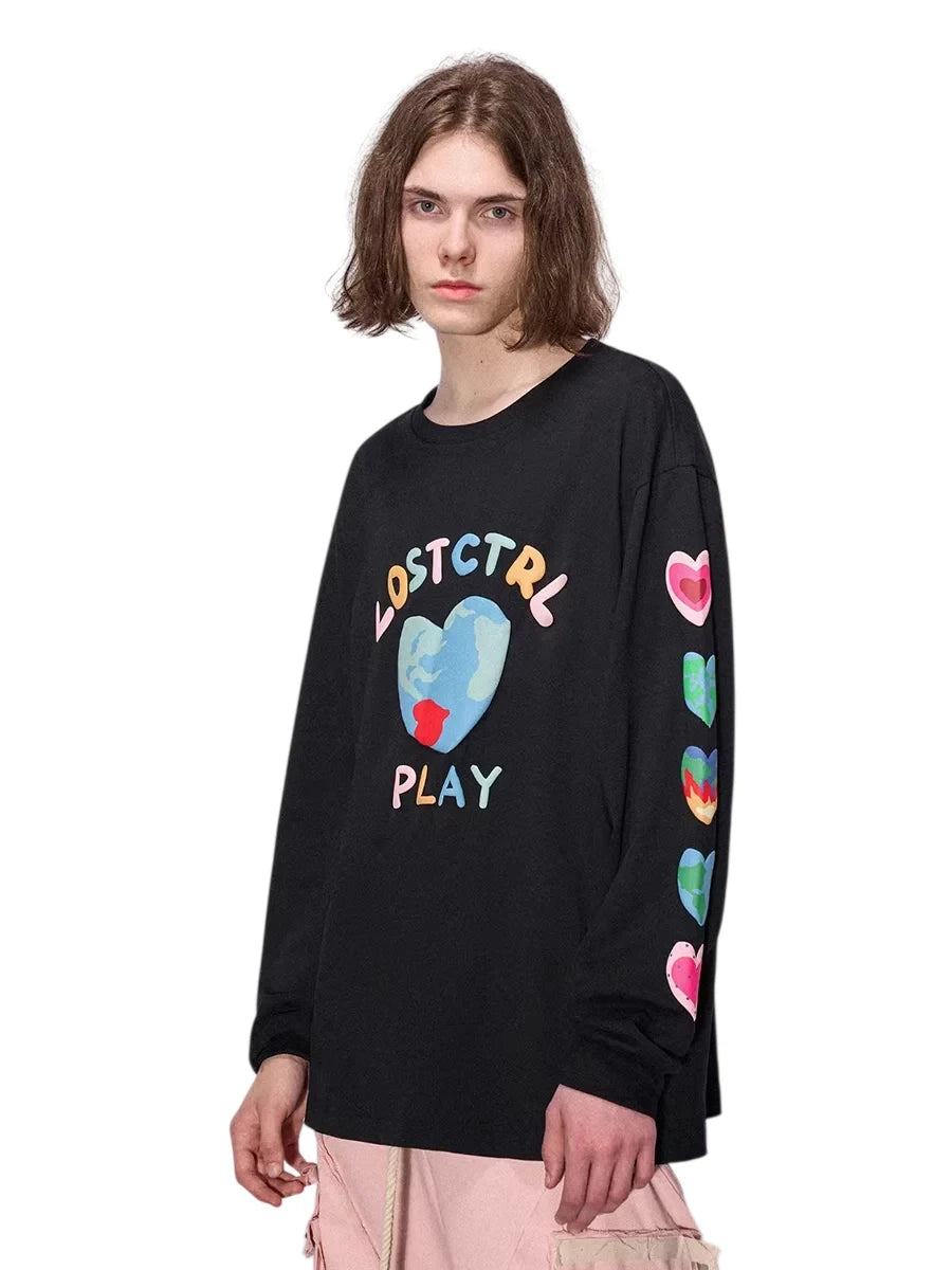 Make a bold statement with this unisex long sleeve T-shirt, perfect for autumn layering. Featuring a colorful 'LOSTCTRL PLAY' print encircling a heart-shaped world map graphic, this top adds playful energy to your wardrobe. The sleeves are decorated with vibrant heart motifs for an eye-catching finish. Designed with a loose fit and classic crew neck, it offers both comfort and style. Available in black and white color options, this shirt pairs effortlessly with jeans or casual trousers for a relaxed, streetwear-inspired look.