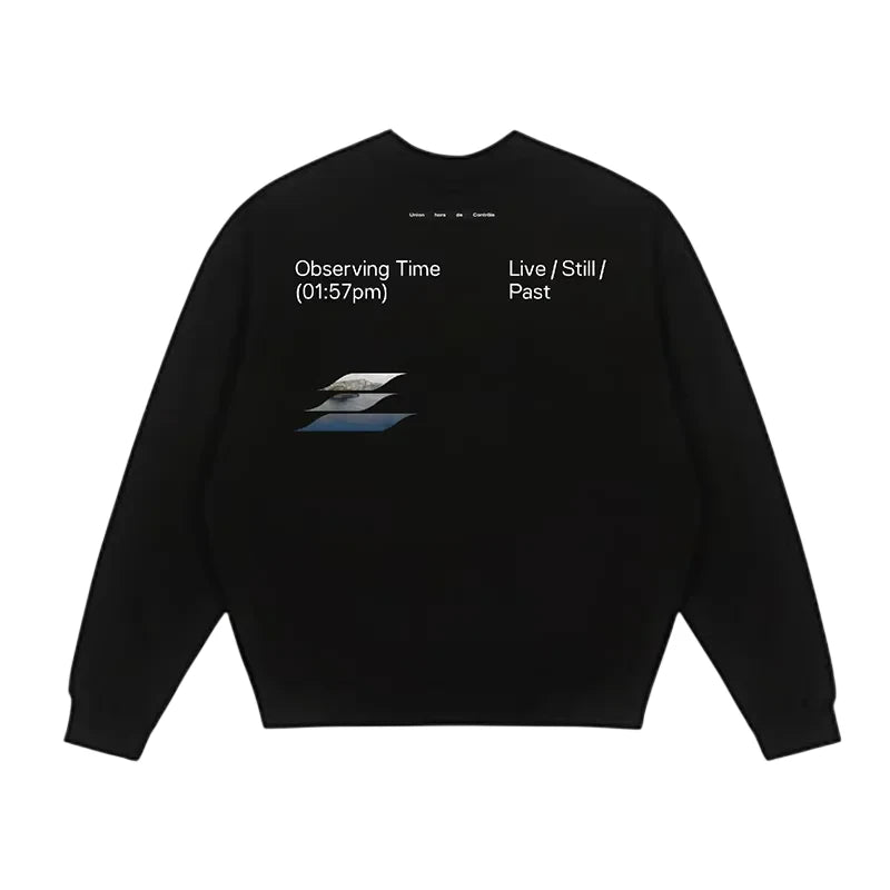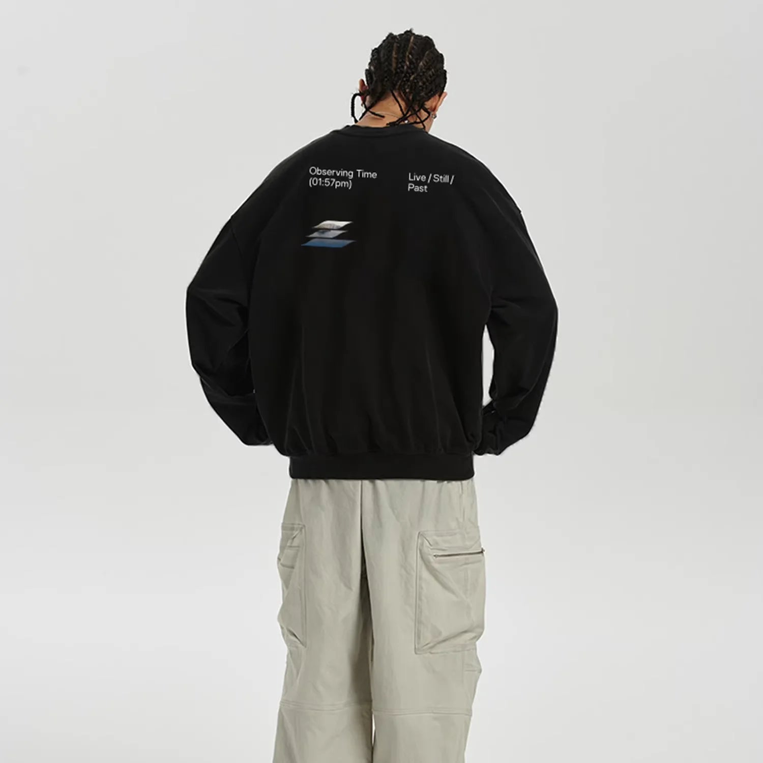 The design showcases a minimalistic graphic and conceptual text on the upper back, including phrases like 'Observing Time (01:57pm)' and 'Live / Still / Past'. This modern piece offers a subtle yet artistic streetwear statement, making it a versatile addition to your everyday wardrobe.
