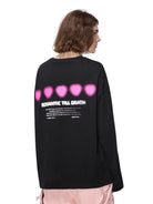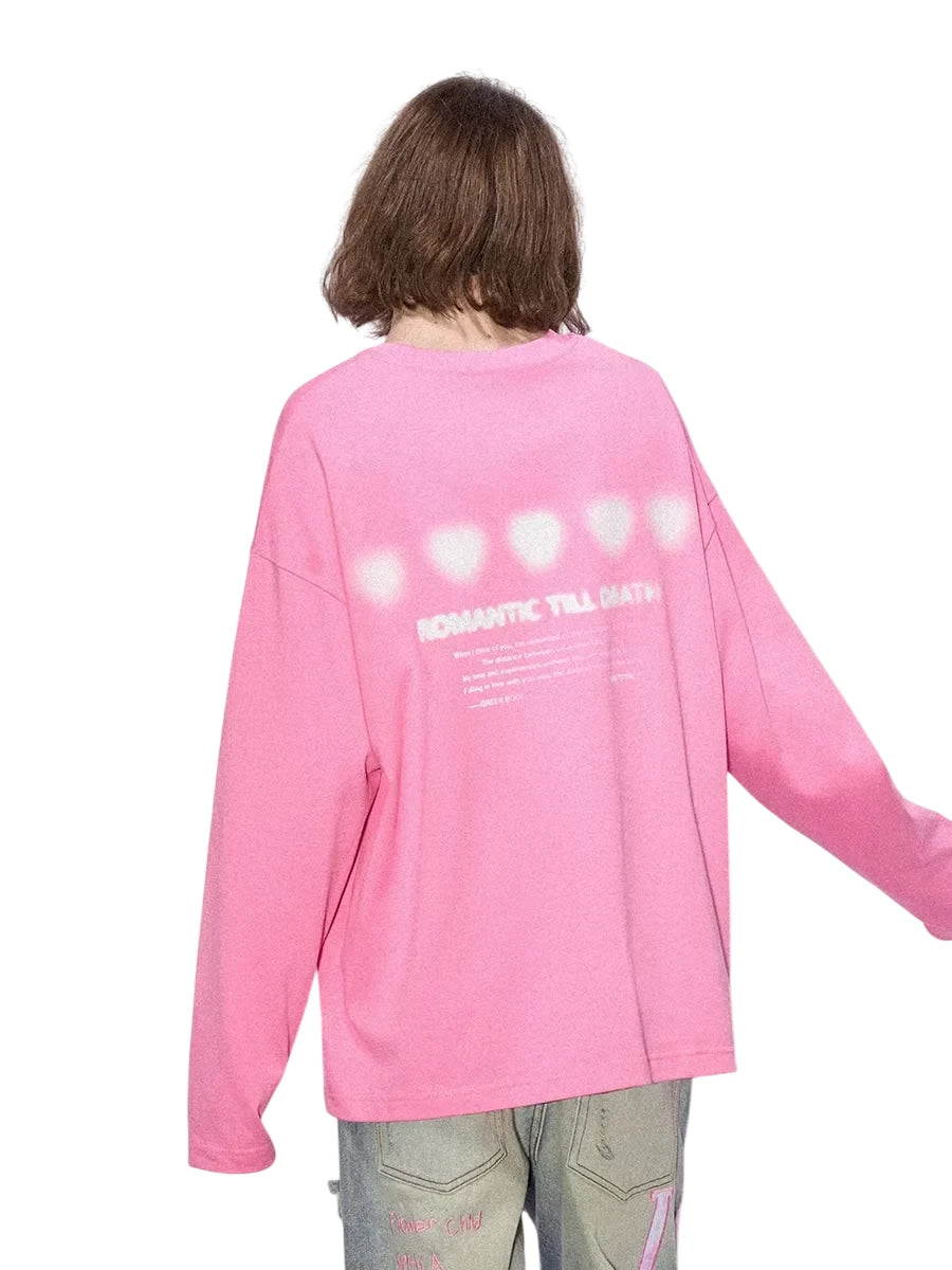 Elevate your streetwear style with this unisex long sleeve t-shirt, featuring a relaxed loose fit ideal for early autumn layering. Designed with a romantic edge, it showcases a gradient pink heart graphic and the bold statement 'ROMANTIC TILL DEATH' on the back, complemented by subtle branding accents. The soft, oversized silhouette ensures comfort and versatility for everyday wear.