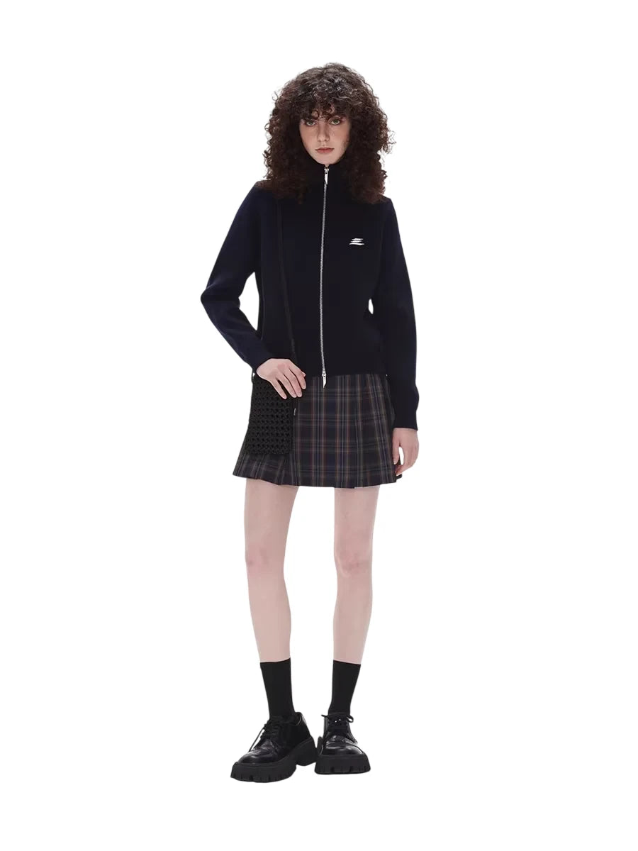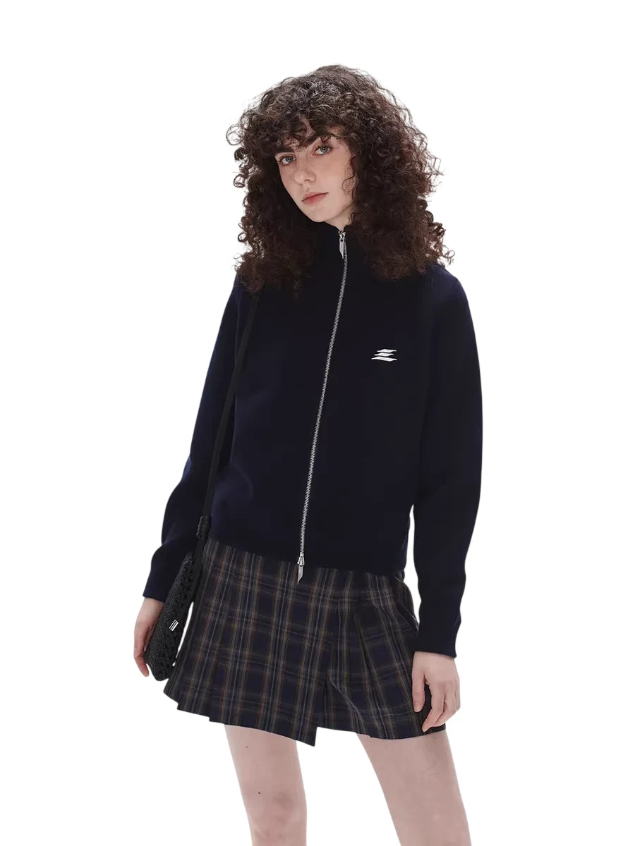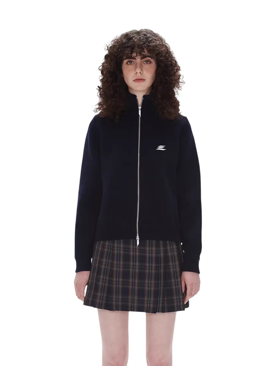 LOSTCTRL Unisex High Collar Double Zipper Knit Cardigan with Embroidered Logo