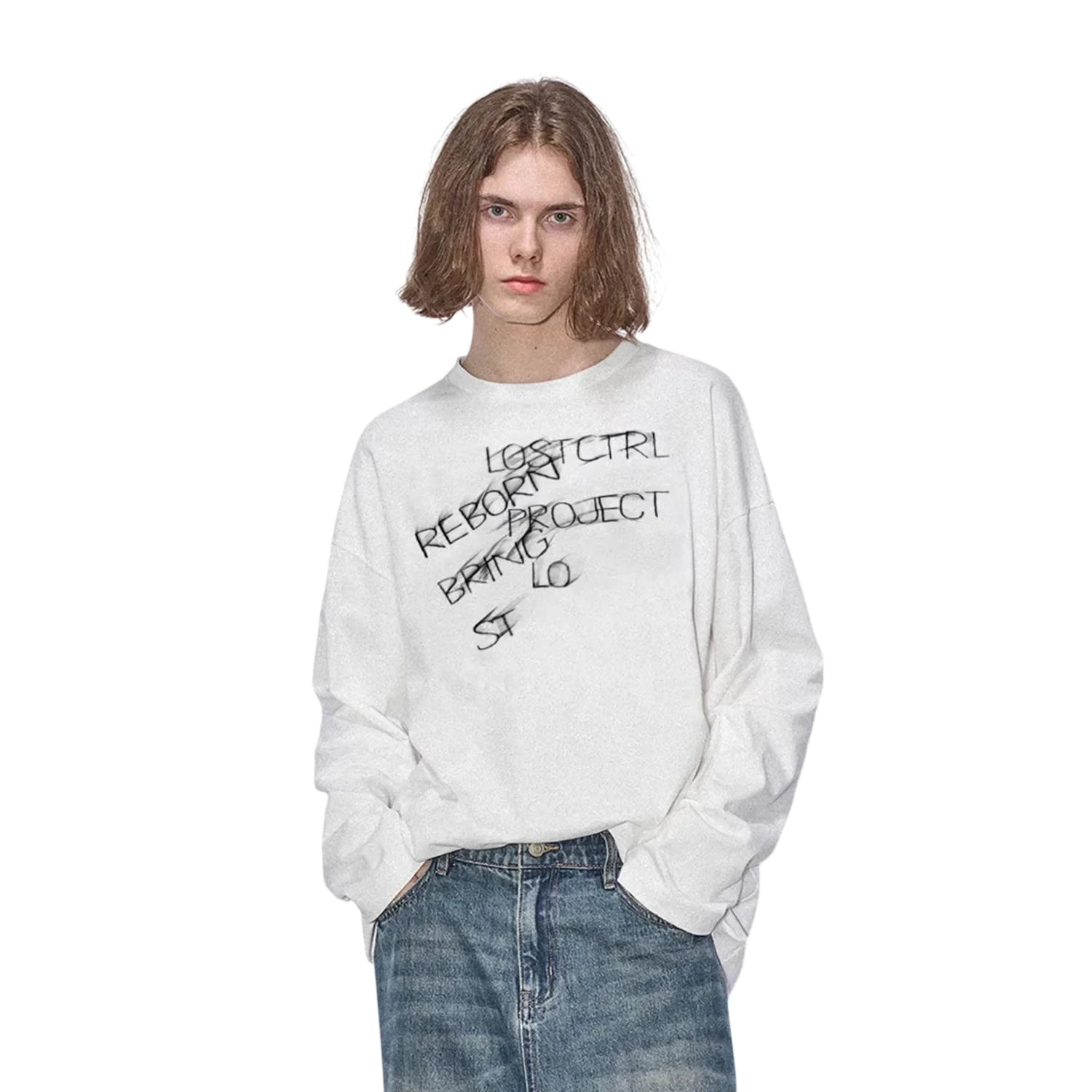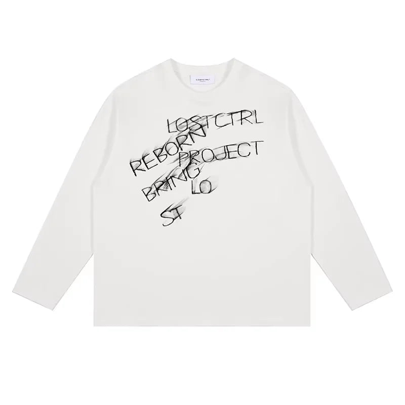 Elevate your streetwear style with this unisex long sleeve T-shirt, perfect for spring and autumn. Designed with a loose fit, this crew neck pullover features bold, scattered black letter prints like 'REBORN,' 'PROJECT,' and 'LOST CTRL' for an edgy, urban look. The soft white fabric drapes comfortably, making it ideal for casual wear. Pair it effortlessly with jeans or joggers for a relaxed, modern outfit.