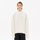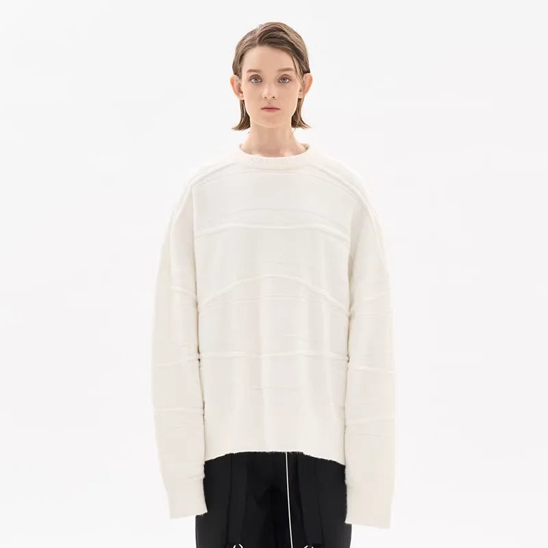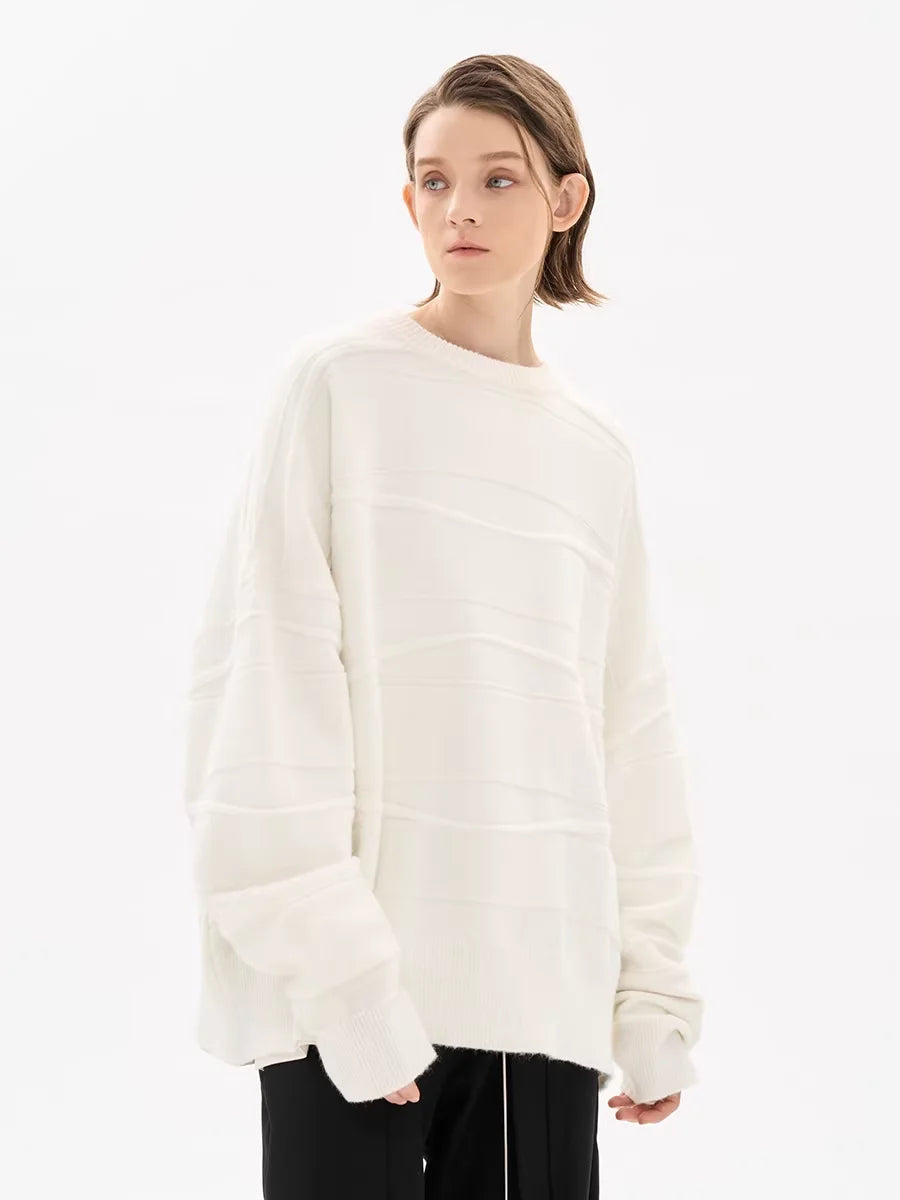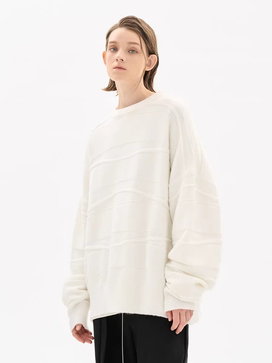 Stay cozy and stylish with this unisex oversized sweater, designed in a soft off-white tone perfect for winter wear. Featuring a relaxed fit and subtle wave-shaped horizontal stripes, this knit sweater blends comfort with minimalist fashion. The crew neckline and long sleeves provide warmth, making it an ideal choice for colder seasons. Suitable for a relaxed or casual layered look.