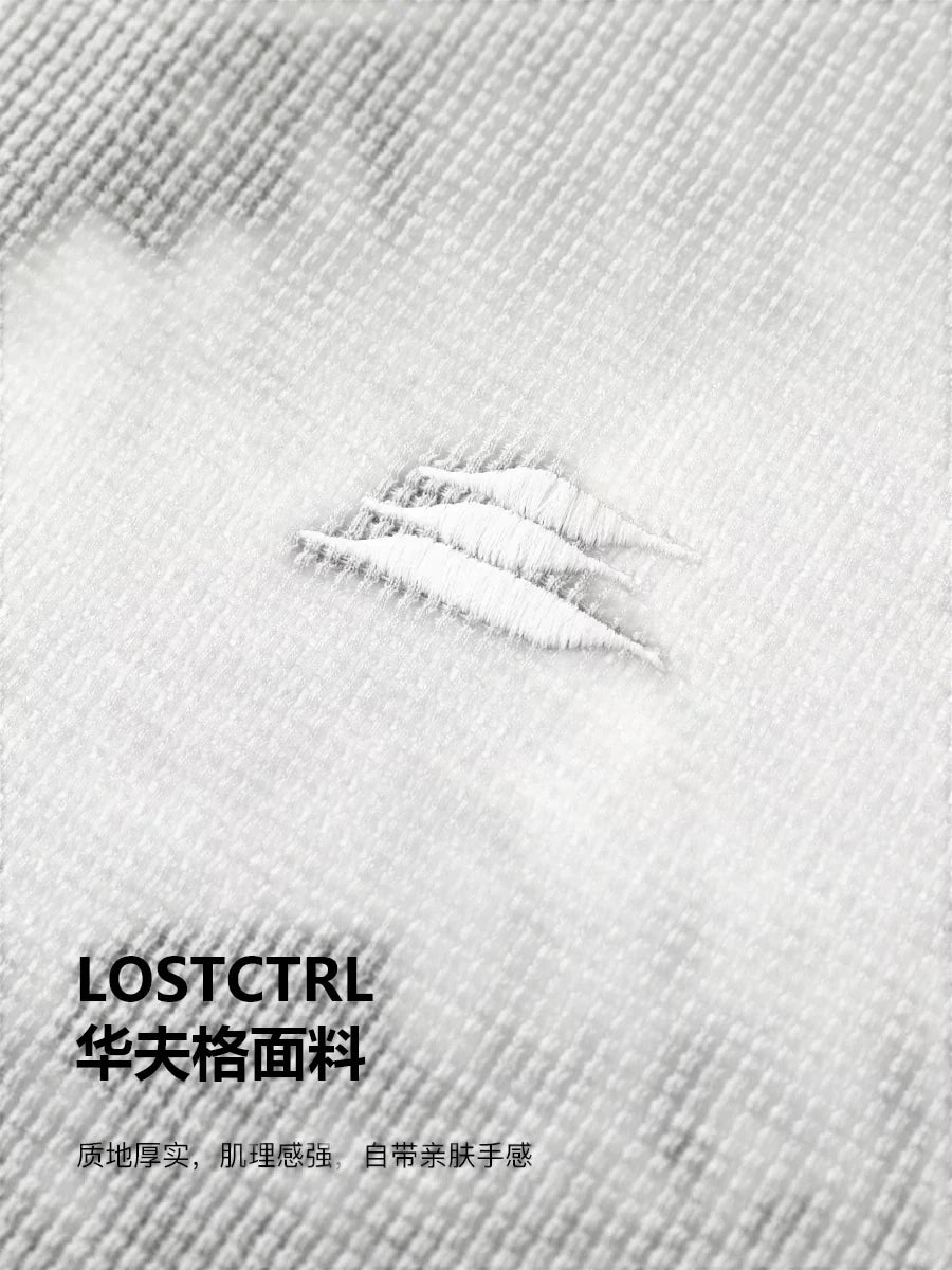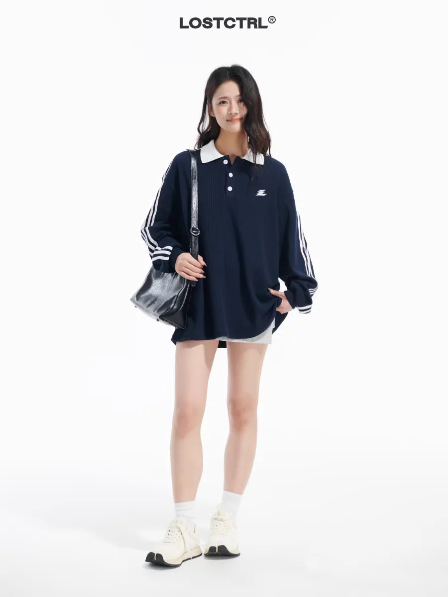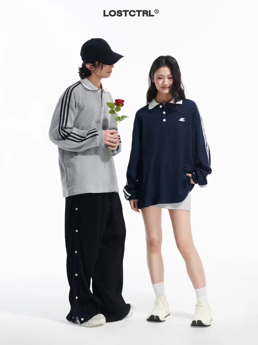 LOSTCTRL Unisex Waffle Knit Polo Sweatshirt with Striped Sleeves