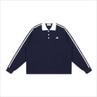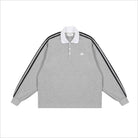 Elevate your casual wardrobe with this unisex waffle knit polo sweatshirt, designed for comfort and style. Featuring a textured gray fabric, this top includes a classic white button-up collar and sporty double black stripes running from shoulder to cuff. A small embroidered white logo on the left chest adds a subtle touch of distinction. Ideal for layering or wearing on its own, this sweatshirt blends casual flair with athletic inspiration.