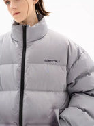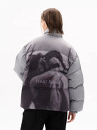 Stay warm and stylish with this thickened down jacket, designed for both men and women. This winter-ready coat features high-quality white duck down filling for superior insulation. The light grey gradient tone adds a modern touch, while the front includes a minimal logo print. A standout artistic print on the back elevates the streetwear appeal. Complete with a full front zipper and functional side pockets, this jacket is perfect for cold-weather styling.