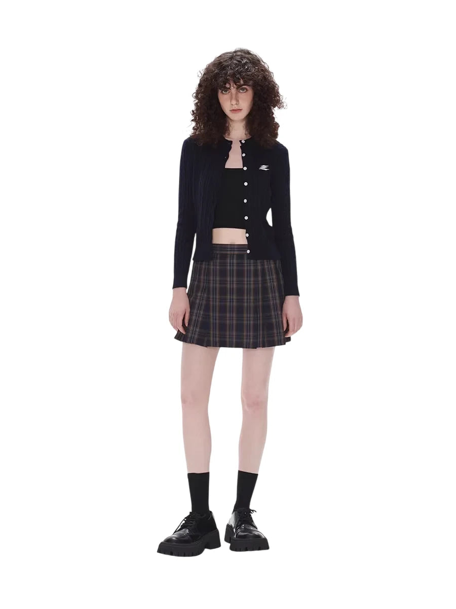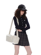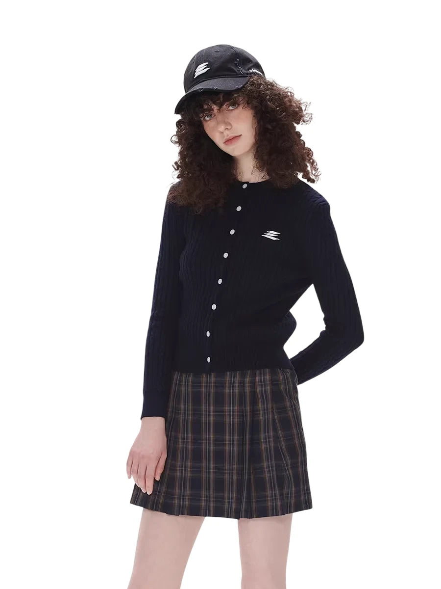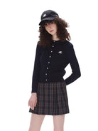 Stay cozy and stylish with this women's slim fit cotton cardigan, perfect for autumn layering. Featuring a classic button-down front, long sleeves, and ribbed knit texture, this short cardigan is both comfortable and flattering. The subtle white embroidered logo on the chest adds a refined detail, while the dark navy tone offers versatile wear. Ideal for pairing with skirts or pants for a chic, seasonal look.