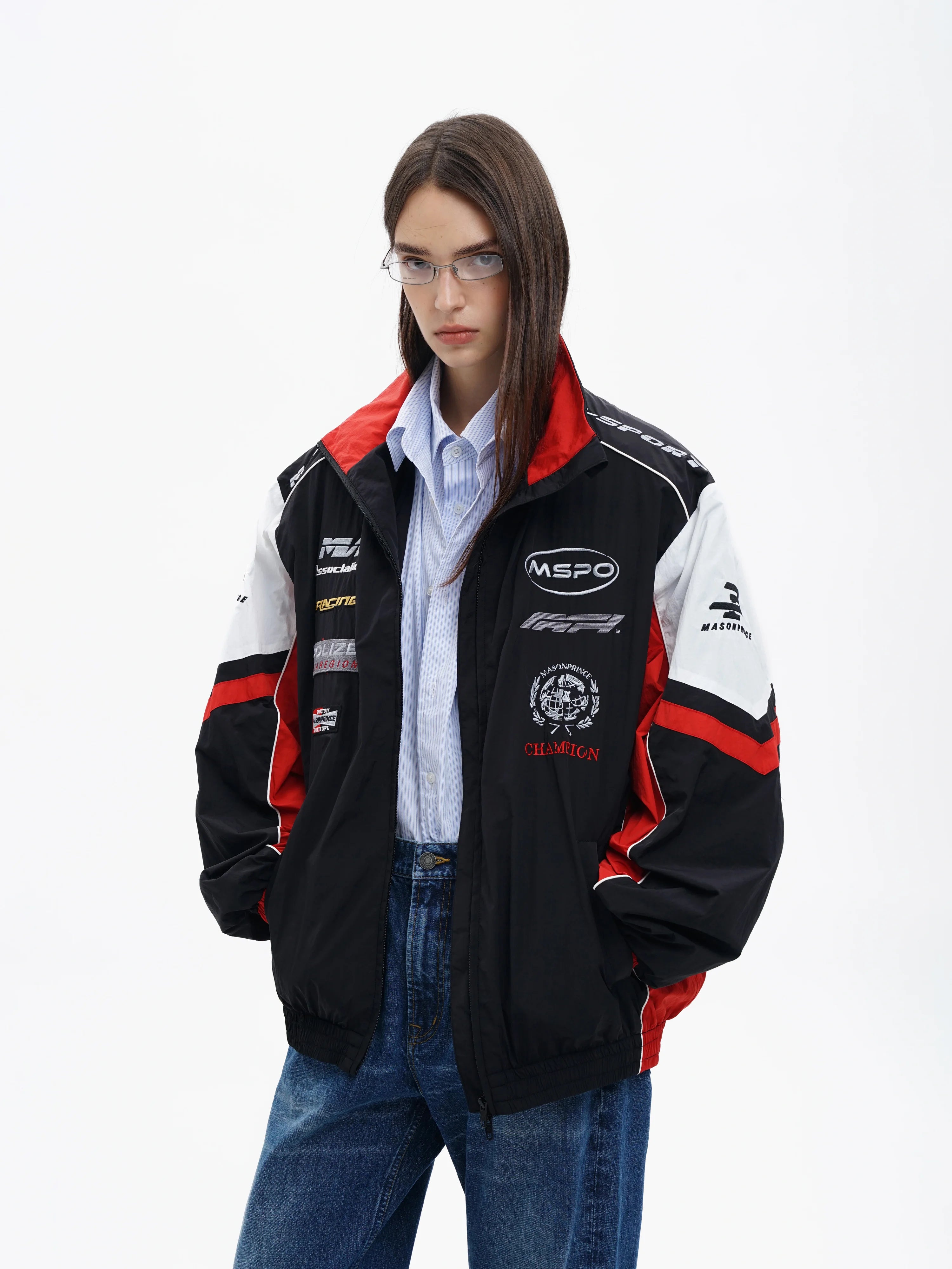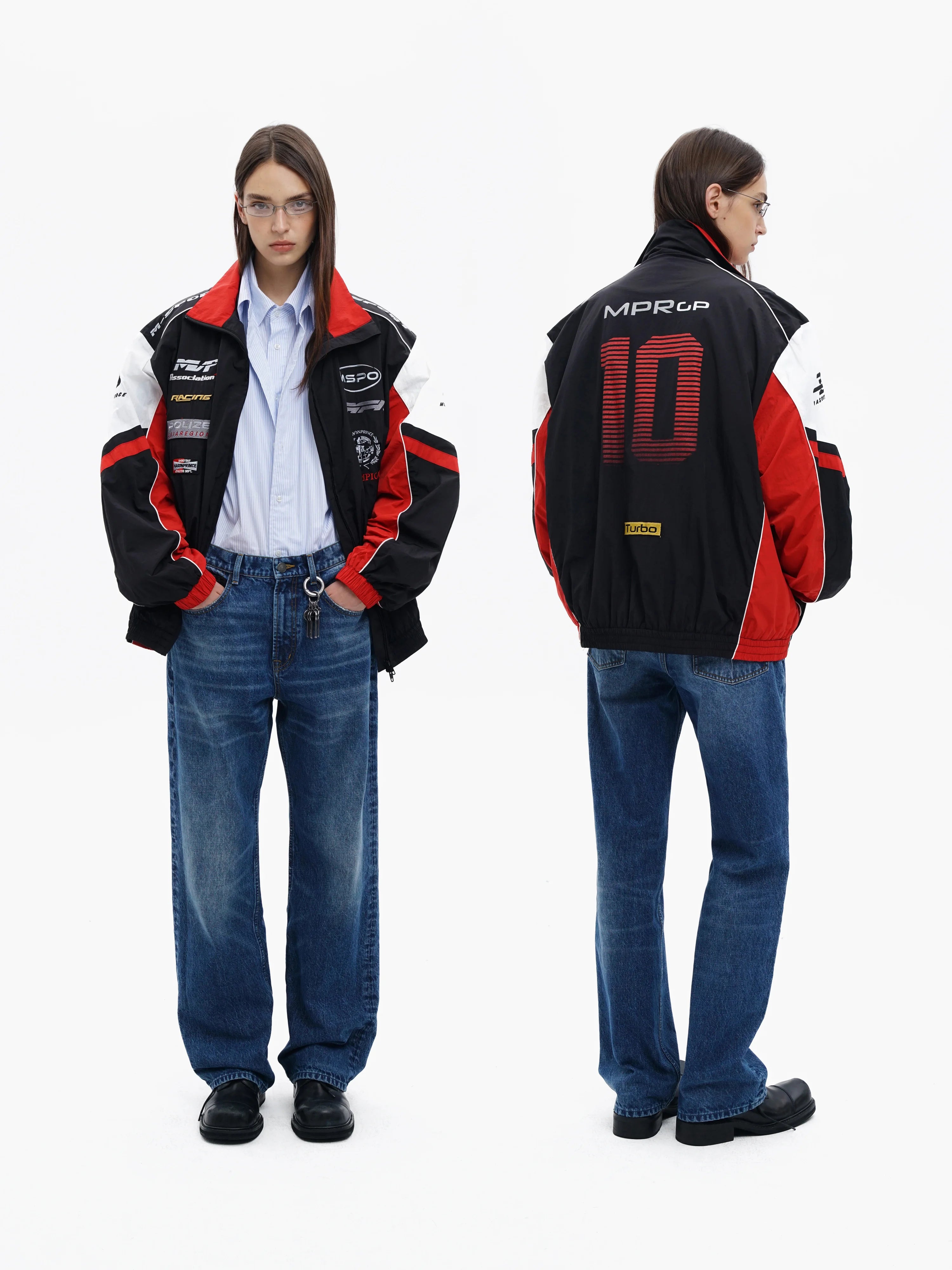 Styled by female models, the jacket is paired with casual bottoms including wide-leg track pants and denim jeans, making it perfect for contemporary street fashion. A go-to choice for those who appreciate a blend of motorsport aesthetics and modern casualwear.