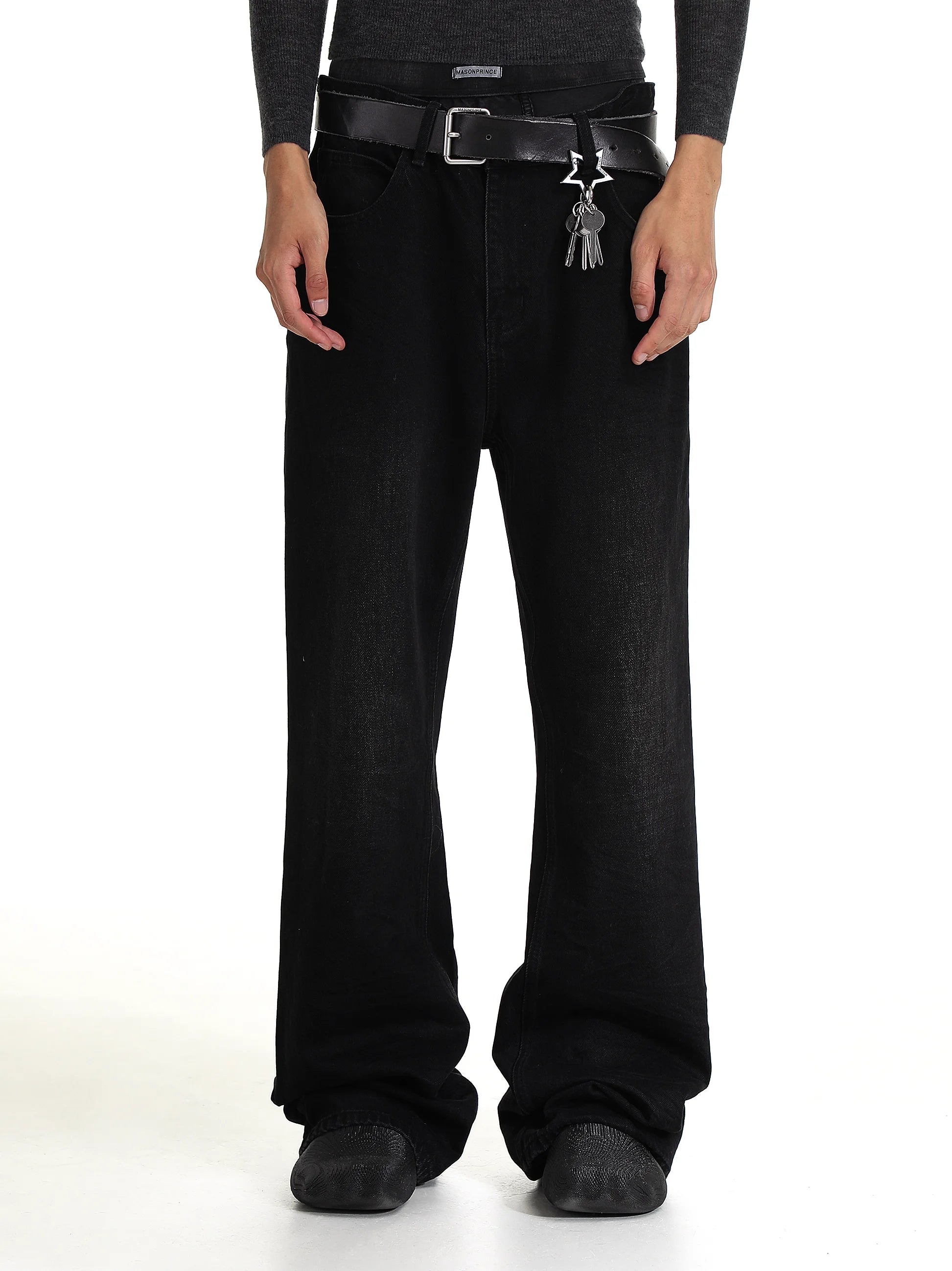 Crafted for women, these statement denim pants are styled with a flattering high-rise fit and extended wide-leg silhouette that elongates the figure. The addition of a double black belt with silver buckle and playful keychain charms offers an edgy finishing touch.