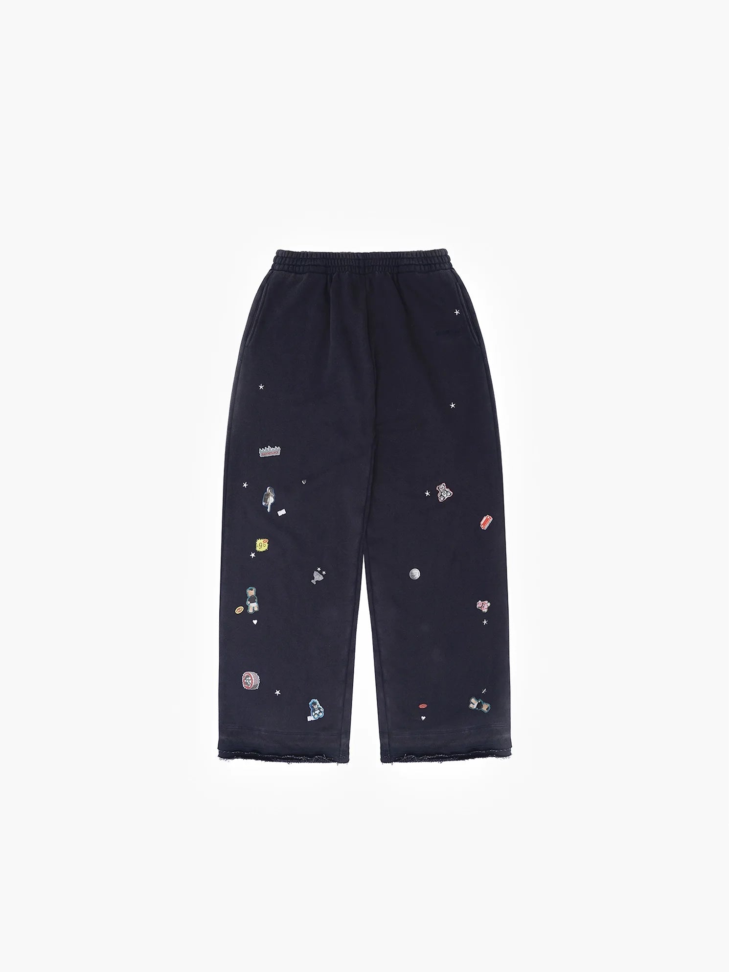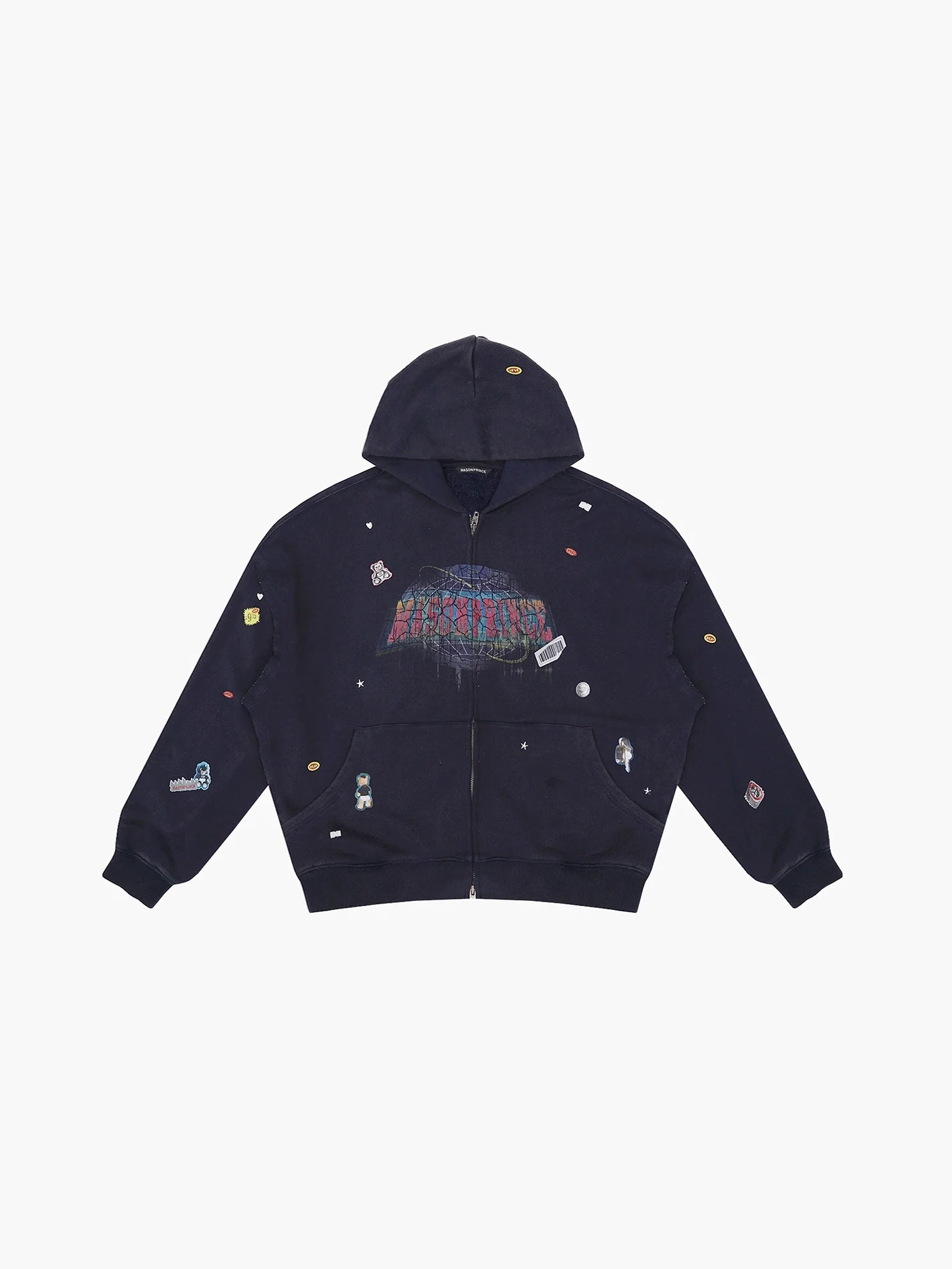 This coordinated 4-piece men's casualwear set is perfect for early autumn layering. It includes a short-sleeve T-shirt, a sleeveless hooded zip-up vest, a long-sleeve hooded zip-up sweatshirt, and a pair of relaxed-fit pants. Each piece features a cohesive design in dark navy with multicolored graphic patches and space-themed motifs, including a distinctive embroidered globe design. Made from soft, comfortable knit fabric, this set offers a relaxed streetwear aesthetic ideal for cool-weather transitions.