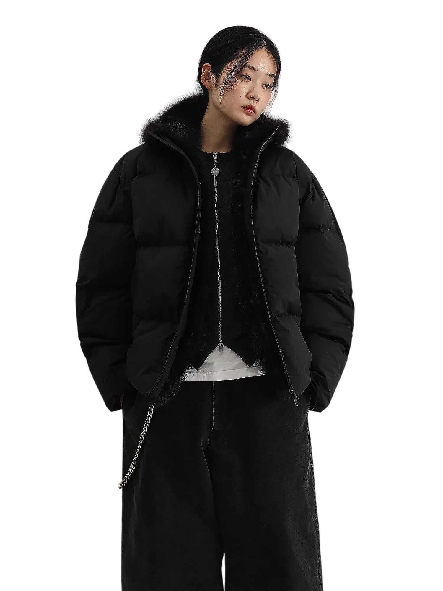 Its voluminous quilted construction offers a cozy and modern silhouette. The jacket includes a durable front zipper and practical side pockets. The design blends fashion and function, making it suitable for both casual and urban wear during colder months.