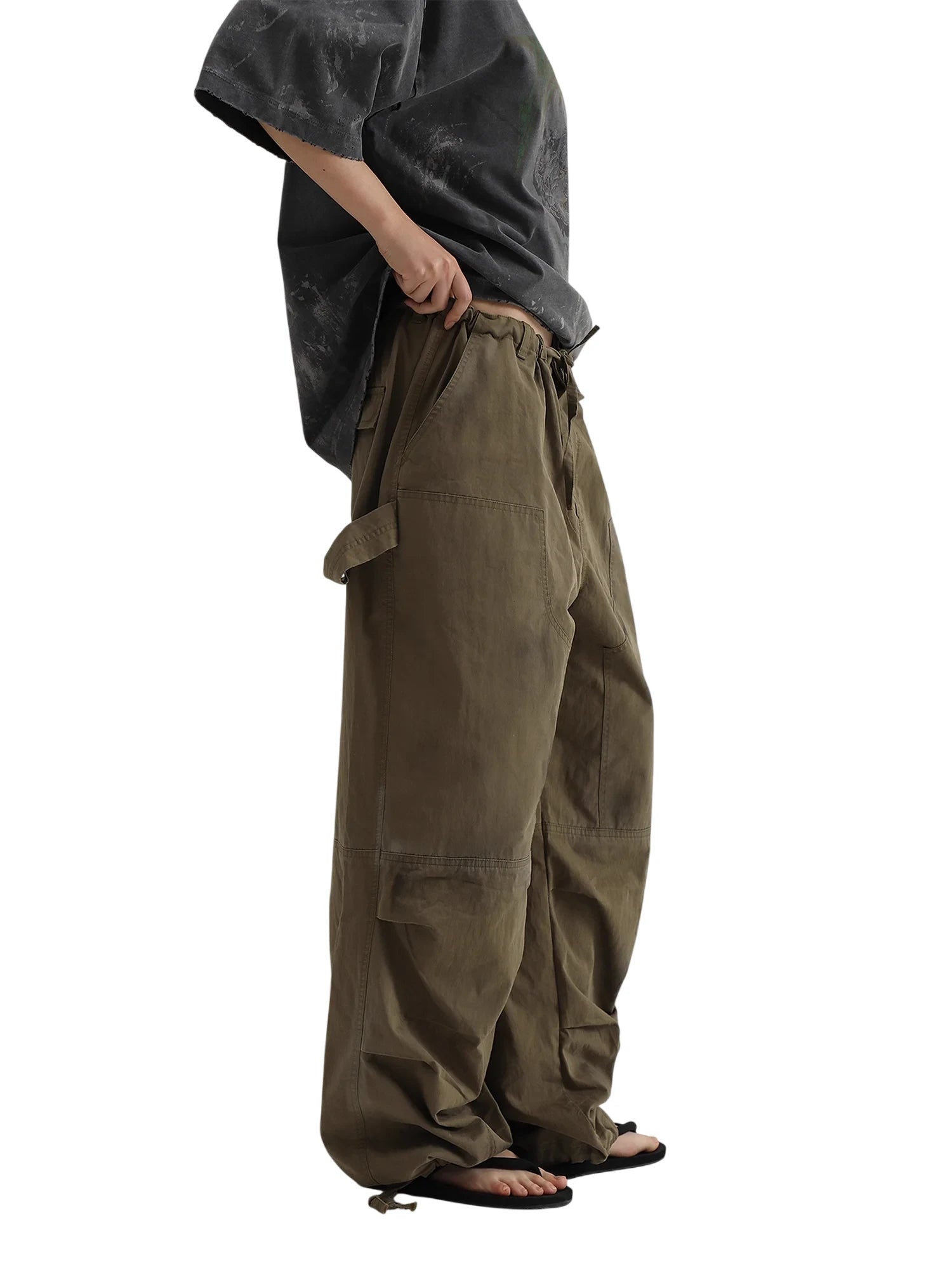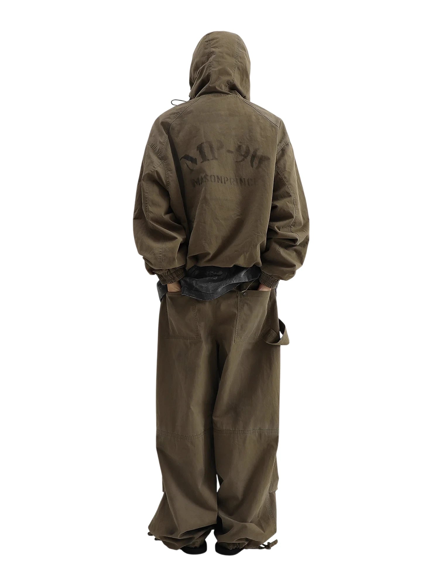Embrace retro utility with this 90s-inspired windproof tracksuit. Designed for men, the ensemble features an oversized, military-style silhouette with a spray-dyed, washed finish for a vintage look. The hooded jacket includes elastic cuffs, a drawstring hood, and a distinctive stenciled graphic on the back. The wide-leg trousers add practicality with a relaxed fit and a functional side cargo strap, making this tracksuit perfect for streetwear styling or casual urban wear.