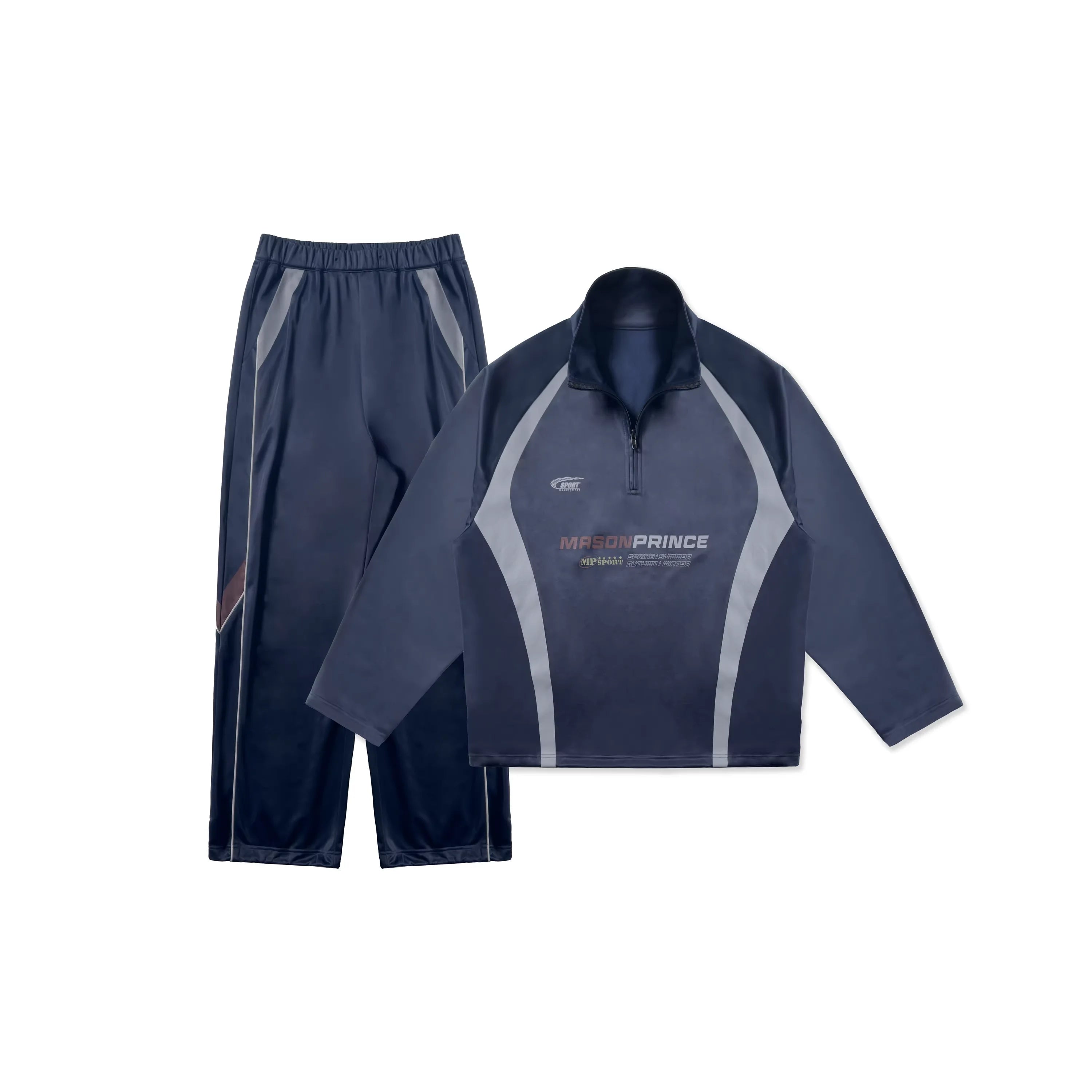This men's tracksuit set channels a retro 90s vibe with its dynamic colorblock design and sporty silhouette. The ensemble includes a long-sleeve half-zip top with a mock neck and matching tapered pants, both in a sharp navy blue accented with light grey curved side panels. The top features front chest detailing and a clean zip closure, while the pants offer comfort with an elastic waistband and stylish piping along the legs, including a subtle maroon accent at the knees. Ideal for streetwear or casual athletic looks, this set combines nostalgia with modern appeal.