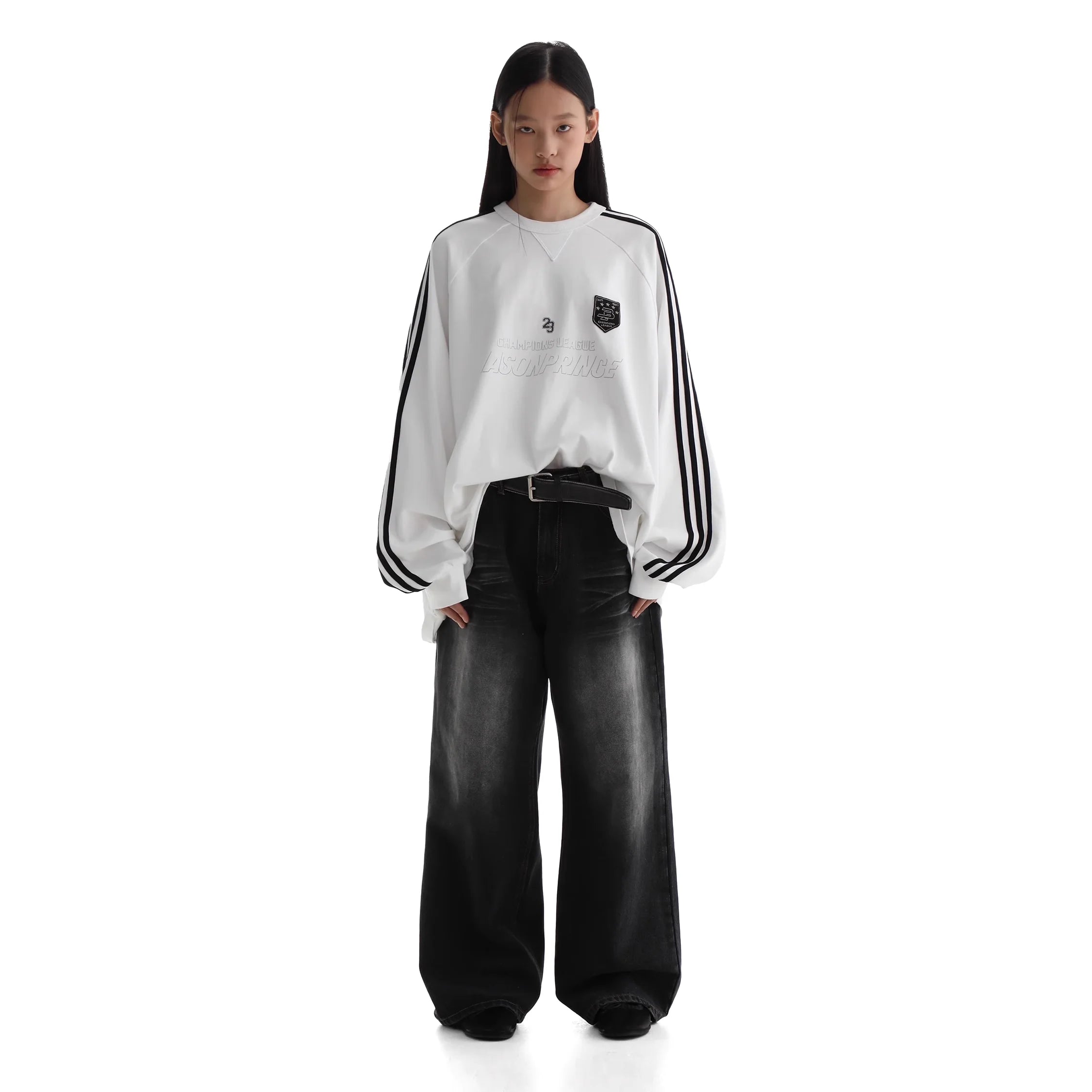 Elevate your casual wardrobe with this 90s-inspired raglan sleeve long sleeve T-shirt, designed for men. Featuring a relaxed, oversized fit and sporty crew neck, this top combines comfort with street-style appeal. The white base is complemented by contrasting black stripes down the sleeves, while embroidery and patch details on the chest add a unique flair. With dropped shoulders and gathered cuffs, this piece offers a bold yet effortless look ideal for everyday wear.