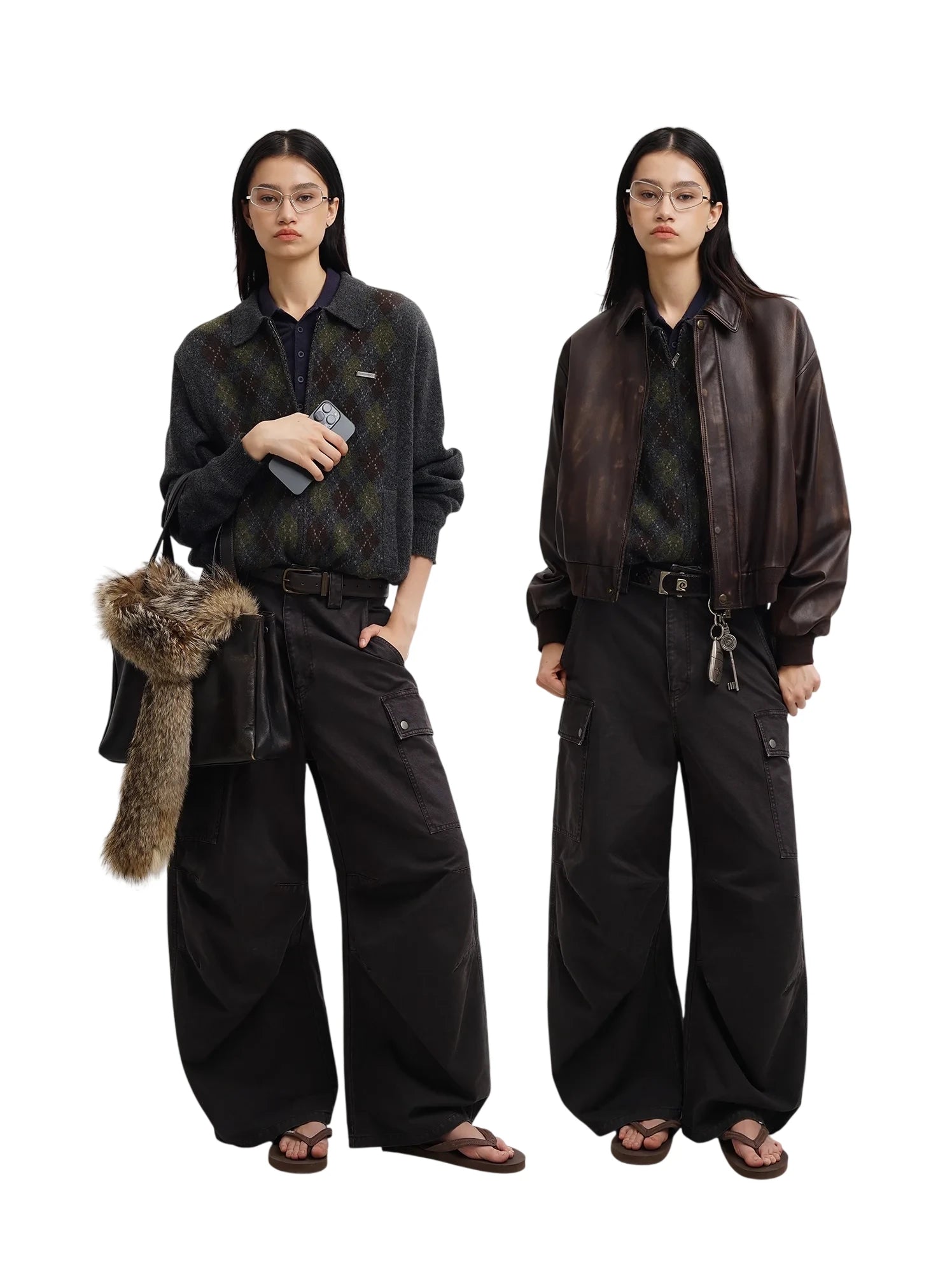 This women's argyle knit zip-up cardigan features a dark grey base accented with shades of olive, brown, and muted green in a classic diamond pattern. Designed for a relaxed, androgynous look, the cardigan is styled with a dark shirt collar underneath and pairs well with both cargo and drawstring pants. The versatile layering piece offers a modern twist on a vintage aesthetic, ideal for casual, creative outfits.