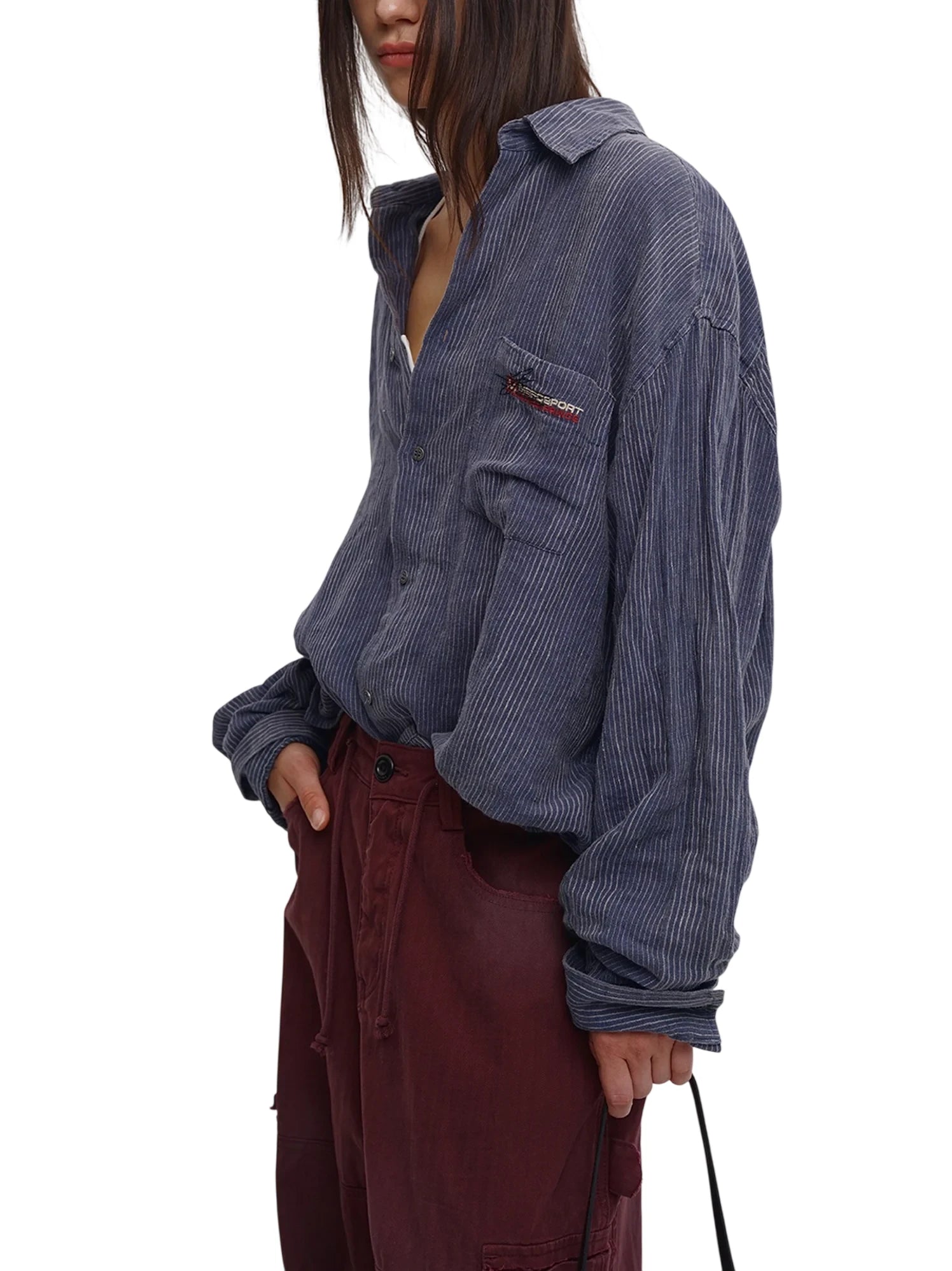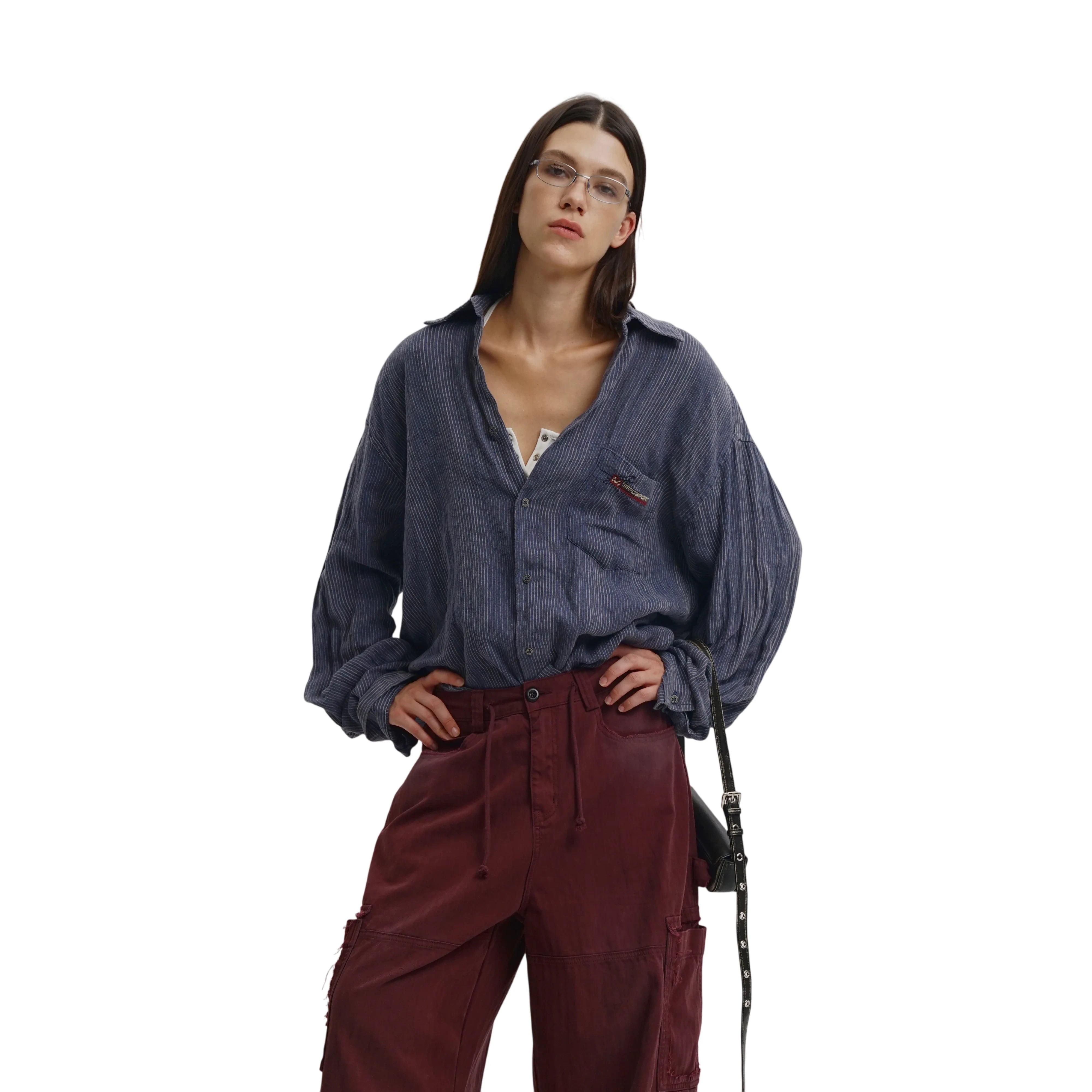 This women's navy blue linen shirt features a loose, breathable fit with subtle vertical pinstripes. Designed with a classic button-up front and a touch of embroidery near the chest pocket, it offers a refined yet relaxed look. Perfectly styled over a lace-trimmed camisole and paired with cargo-style trousers, this shirt is ideal for a versatile, casual outfit.