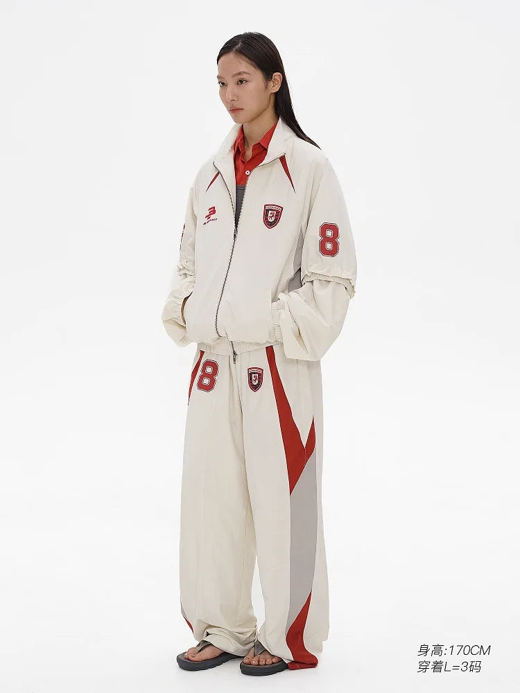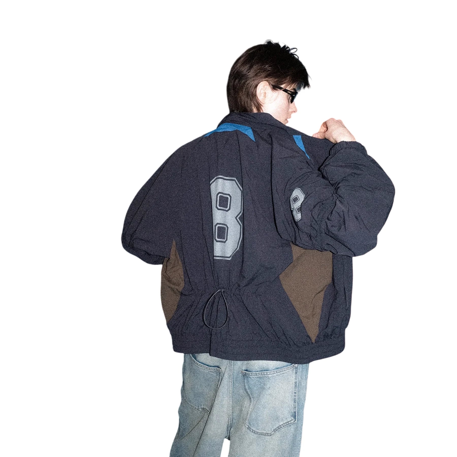 This men's bomber-style coach jacket features a modern athletic silhouette with a vintage twist. Designed in a deep navy blue with warm brown side accents, it showcases a bold number "8" printed on the back and sleeve. The jacket includes detachable sleeves for versatile wear and an adjustable drawstring at the waist for a customized fit. Ideal for transitional seasons, it blends retro sportswear aesthetics with functional design.