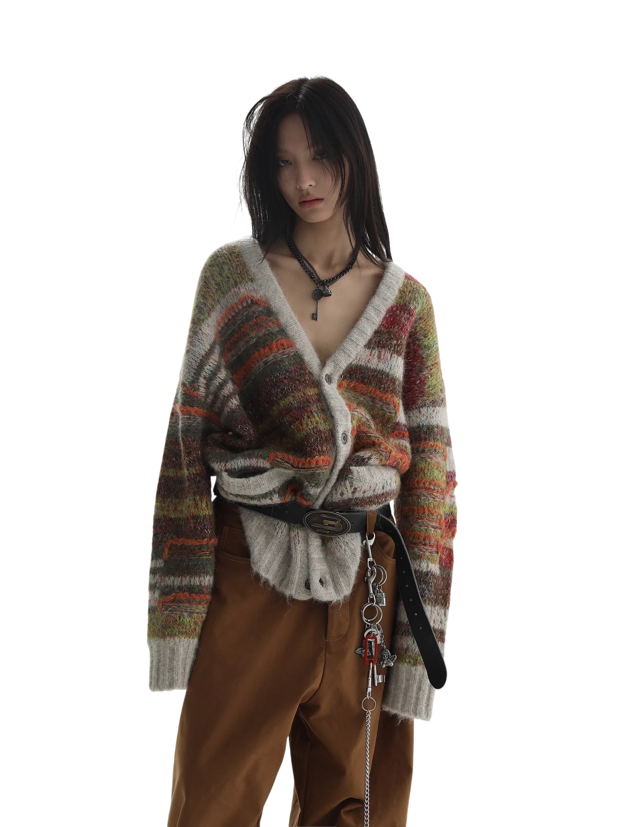 Stay warm and stylish this fall and winter with this cozy colorblock knit cardigan. Designed with a mix of red, green, grey, and cream yarns, this oversized piece offers a textured, fashion-forward look. Featuring a button-down front and a loose silhouette, it can be cinched at the waist with a bold black belt for added shape. Styled here on a female model, it pairs effortlessly with wide-leg trousers and layered accessories for an edgy yet comfortable ensemble.