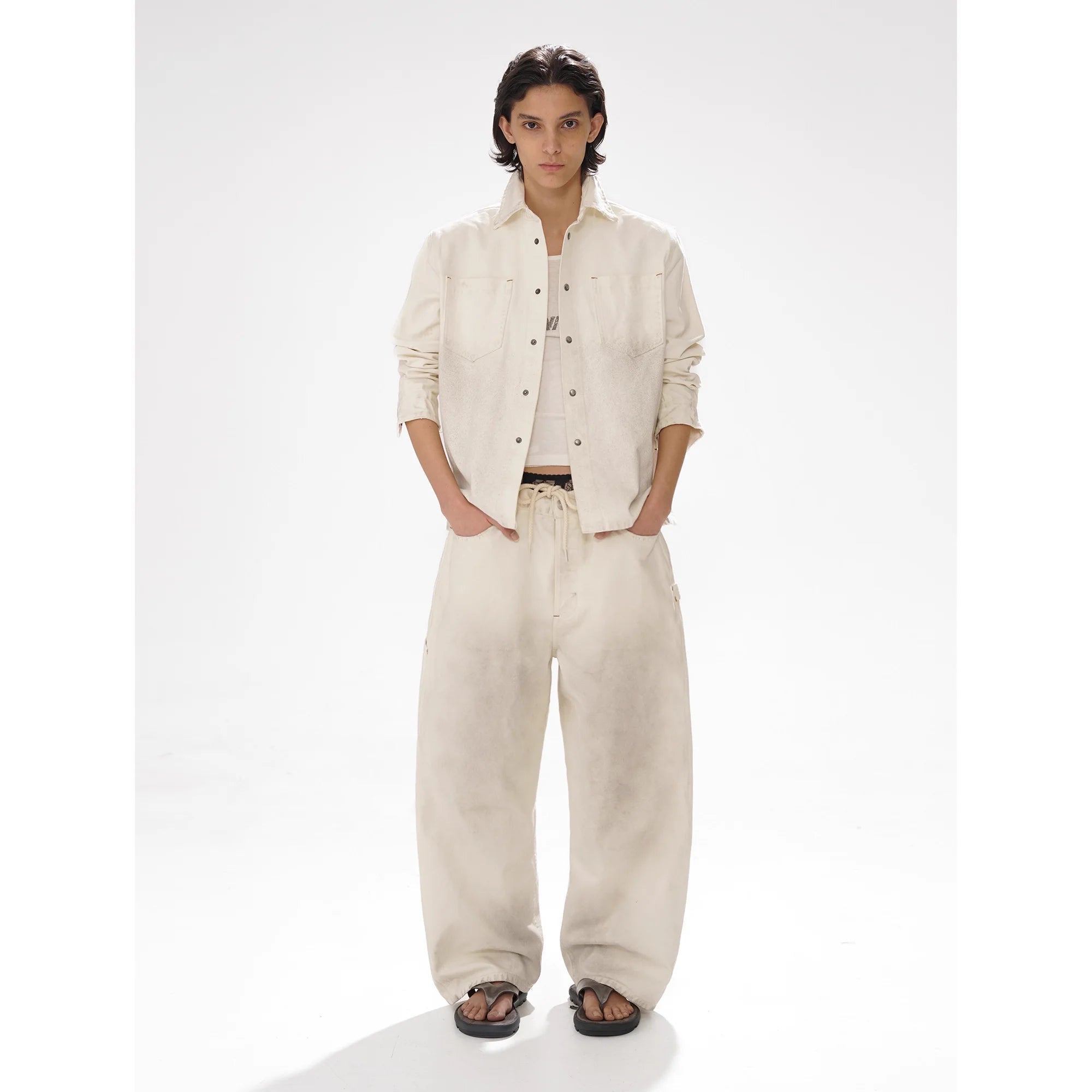 The wide-legged drawstring trousers offer a soft, faded dye effect and are designed with side pockets and visible seam detailing for an urban, laid-back aesthetic. The entire look is clean, casual, and perfect for effortless styling.