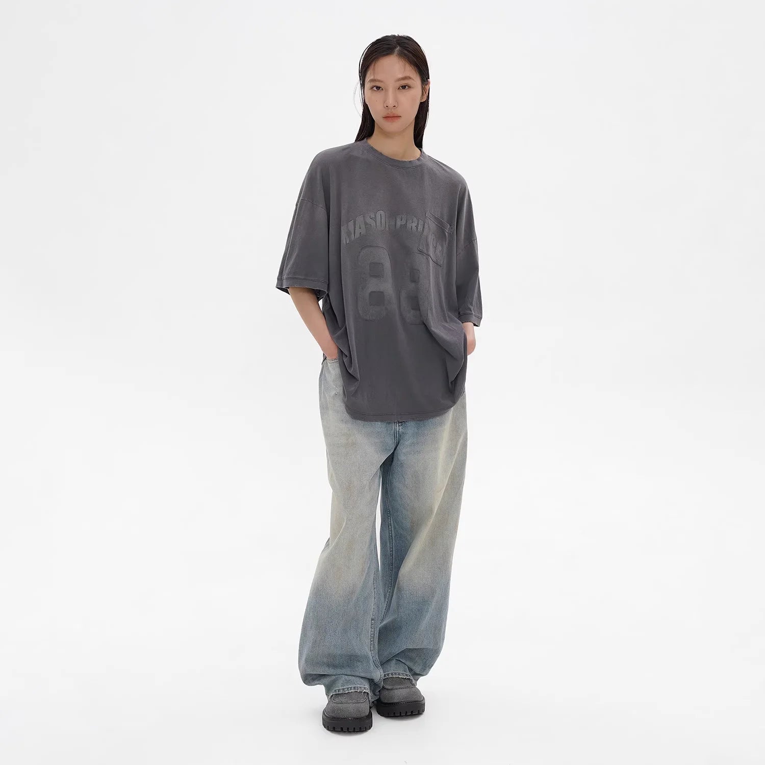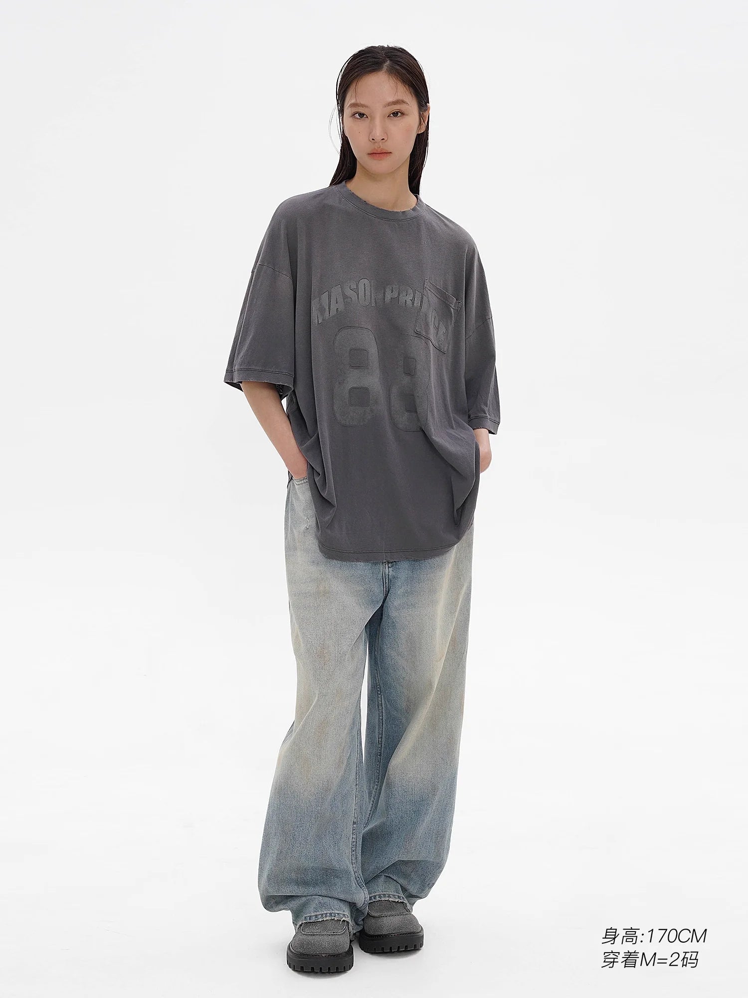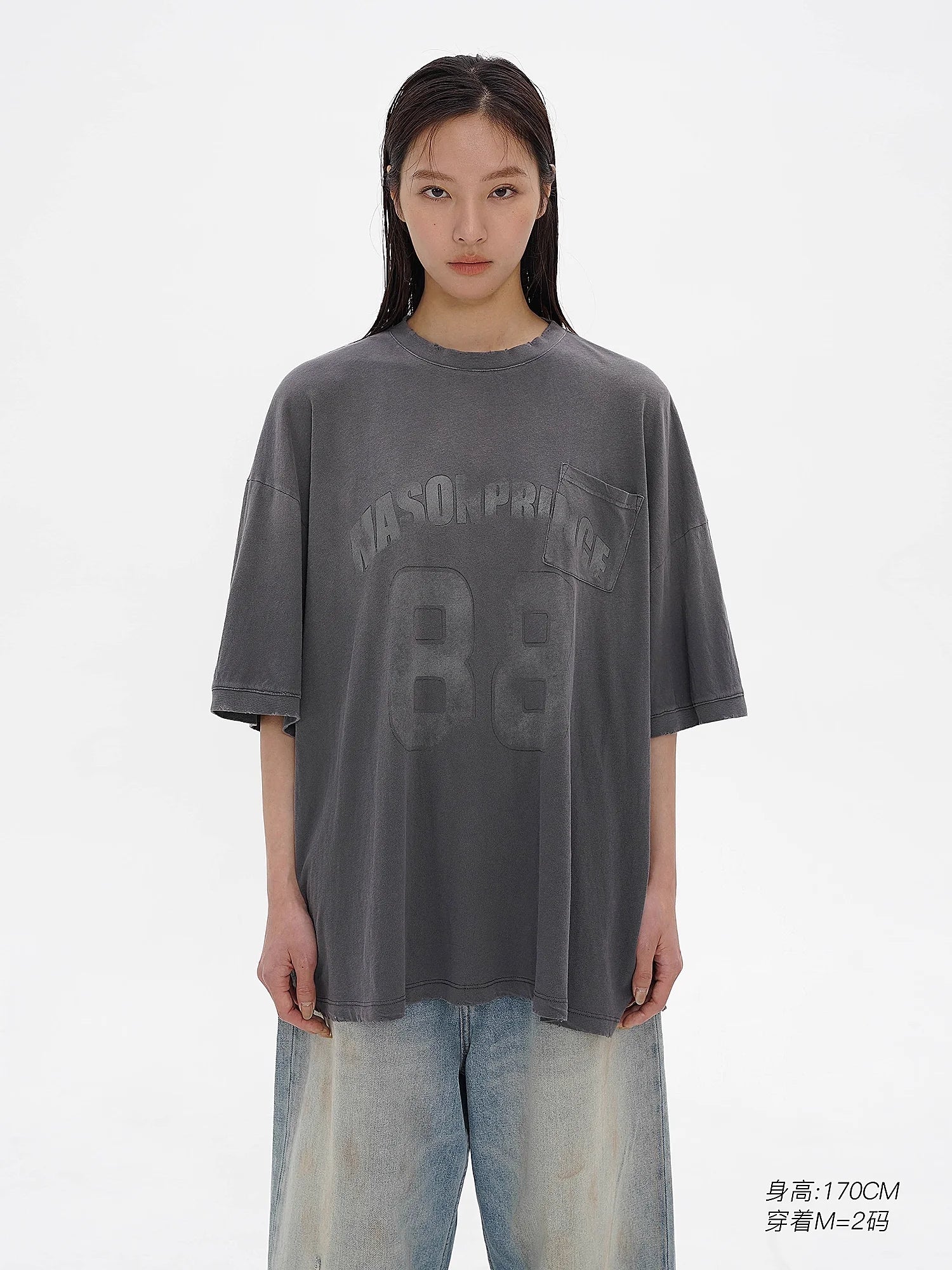 This casual women's T-shirt features a relaxed, oversized silhouette with dropped shoulders and wide short sleeves. The charcoal gray fabric is accented with a vintage-inspired distressed graphic that includes the text "MASON PRIN" and the number "88" on the front. Its soft, worn-in look is perfect for everyday wear. Pairs seamlessly with light-wash denim or your go-to casual bottoms for an effortlessly cool and comfortable style.