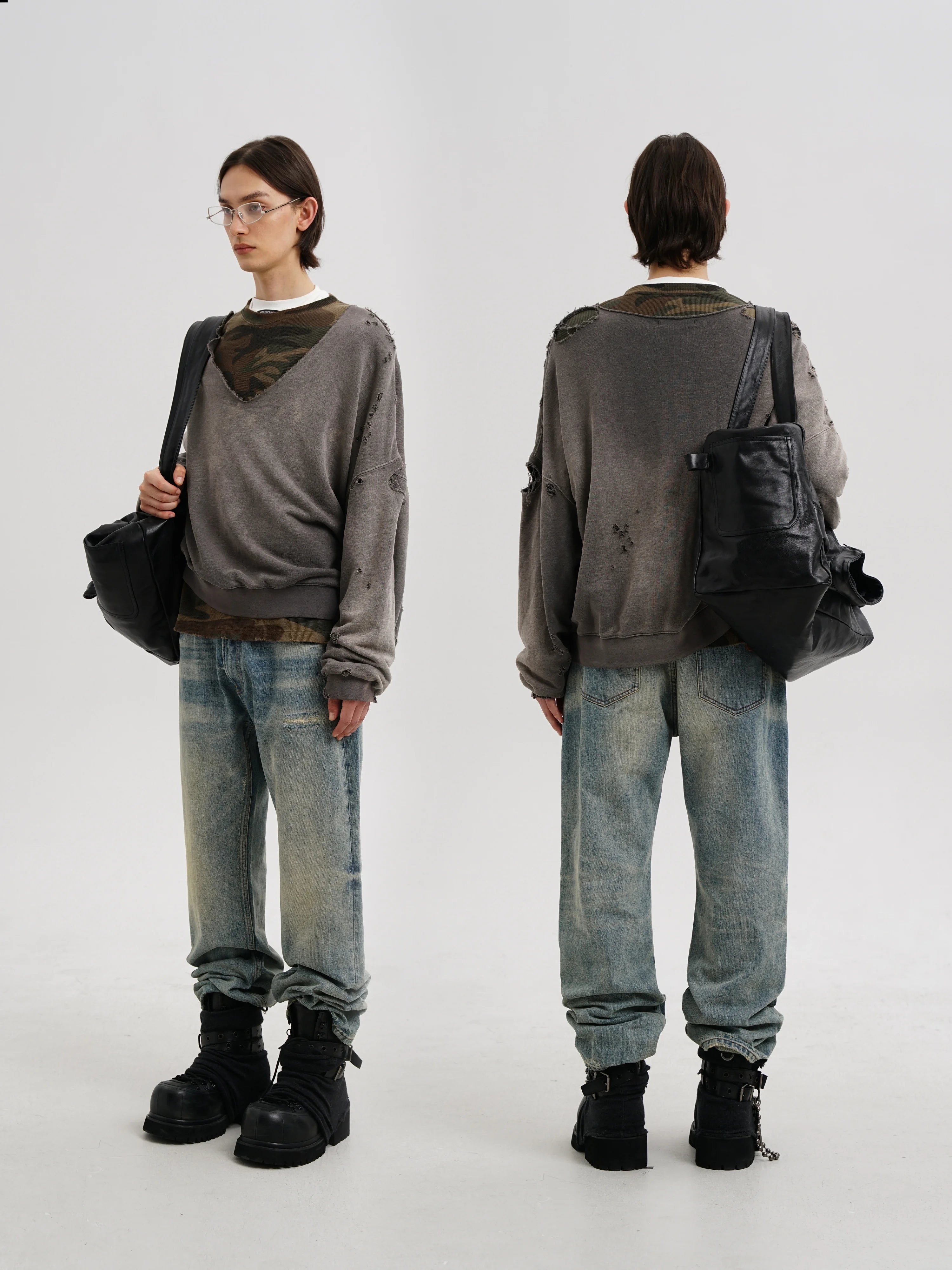 The standout feature is its two-piece layered look, highlighted by a V-cut neckline that reveals a camouflage-patterned inner layer for a utilitarian, military-inspired edge. Ribbed yet distressed cuffs and hem complete the deconstructed aesthetic, blending urban fashion with a vintage, grunge-inspired vibe.