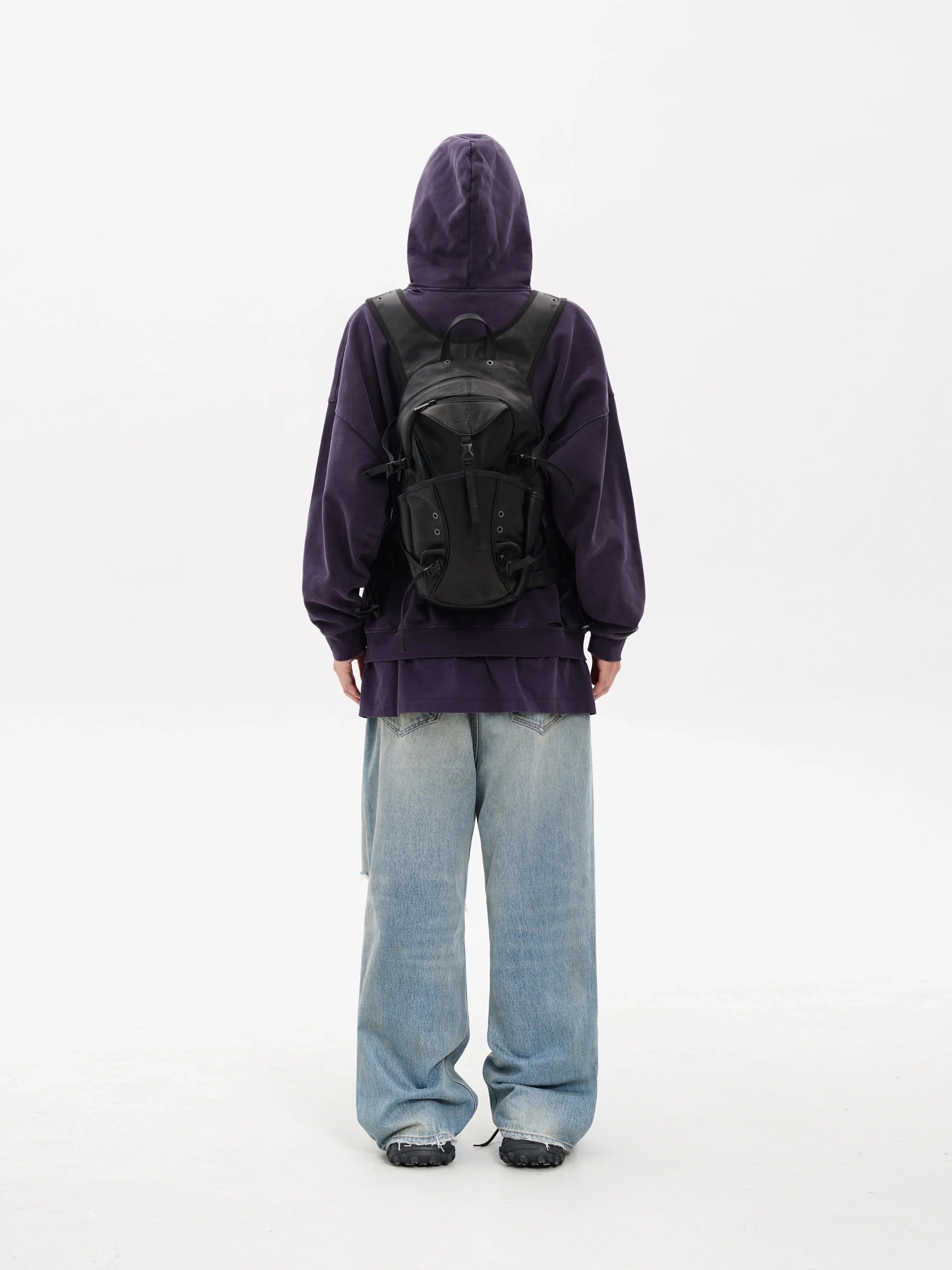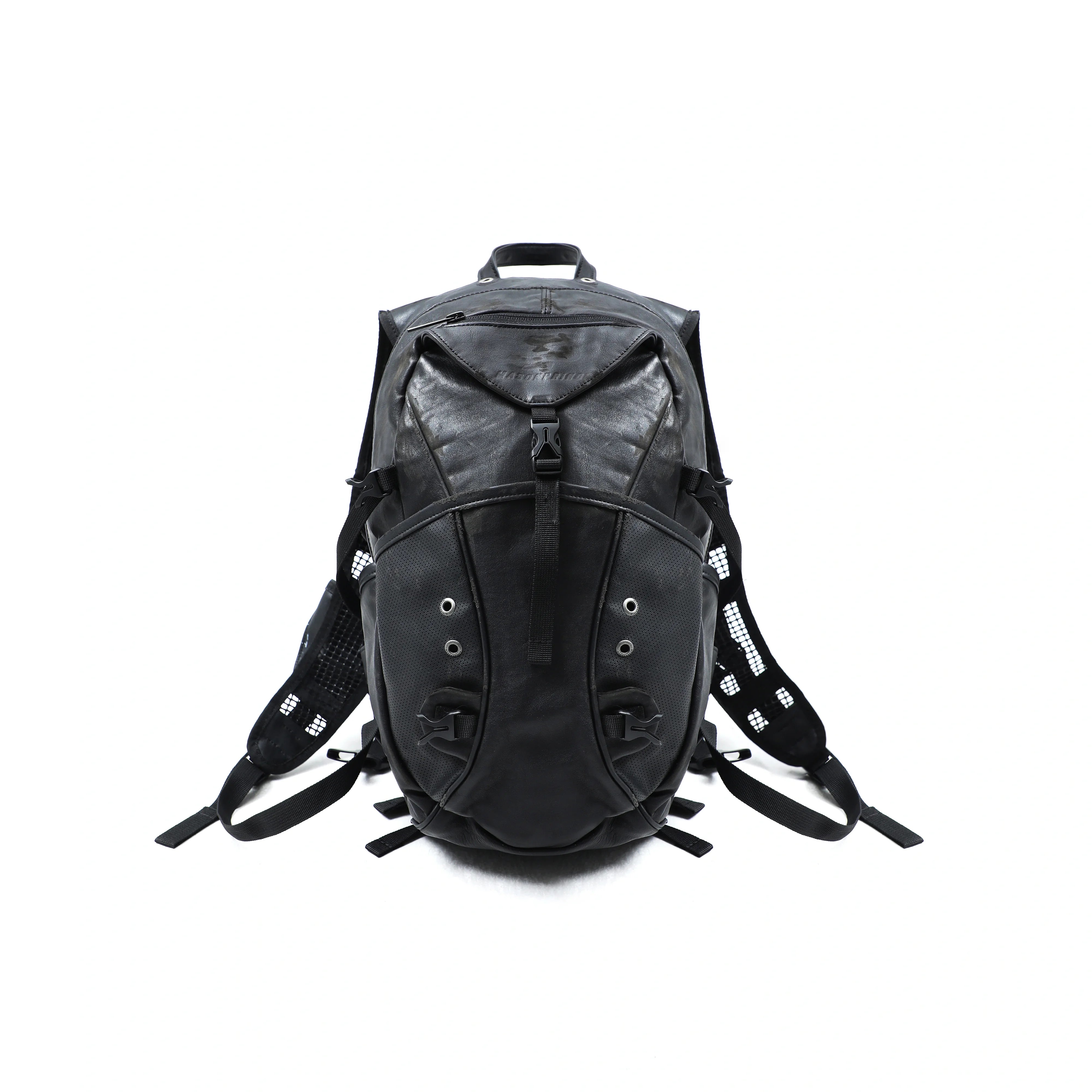Elevate your everyday carry with this 12-liter classic backpack, crafted from distressed genuine leather and durable mesh fabric. Featuring a structured silhouette with an industrial flair, it includes metal eyelets, functional front straps, and a central buckle closure on the top flap for enhanced security.
