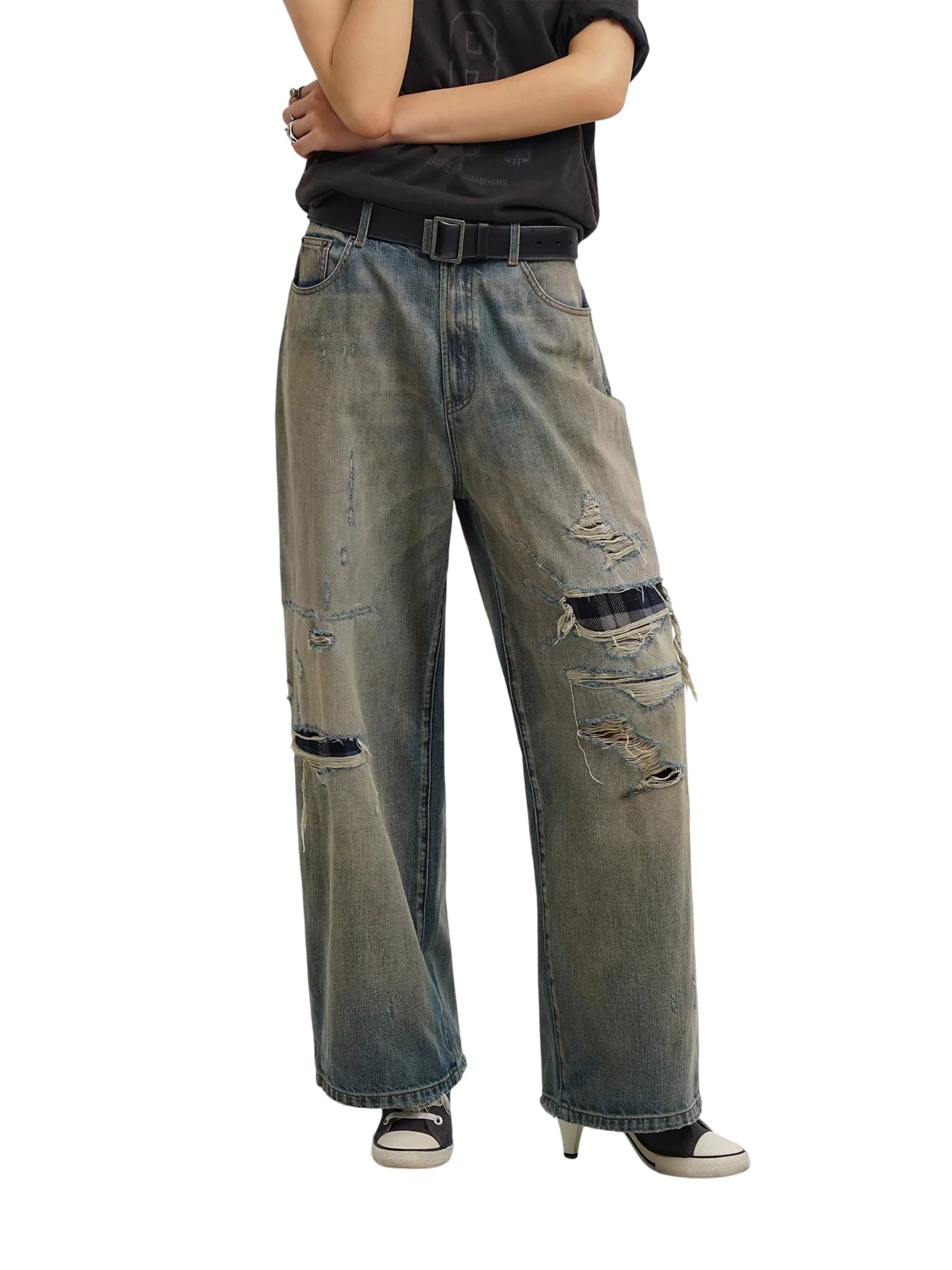 Make a bold style statement with these distressed wide-leg jeans. Designed for women, these high-waisted jeans feature a vintage washed blue finish and heavy distressing with frayed openings for an edgy, worn-in look. Unique black patchwork beneath select rips adds eye-catching contrast. Finished with a relaxed baggy silhouette, these jeans are perfect for streetwear-inspired outfits.