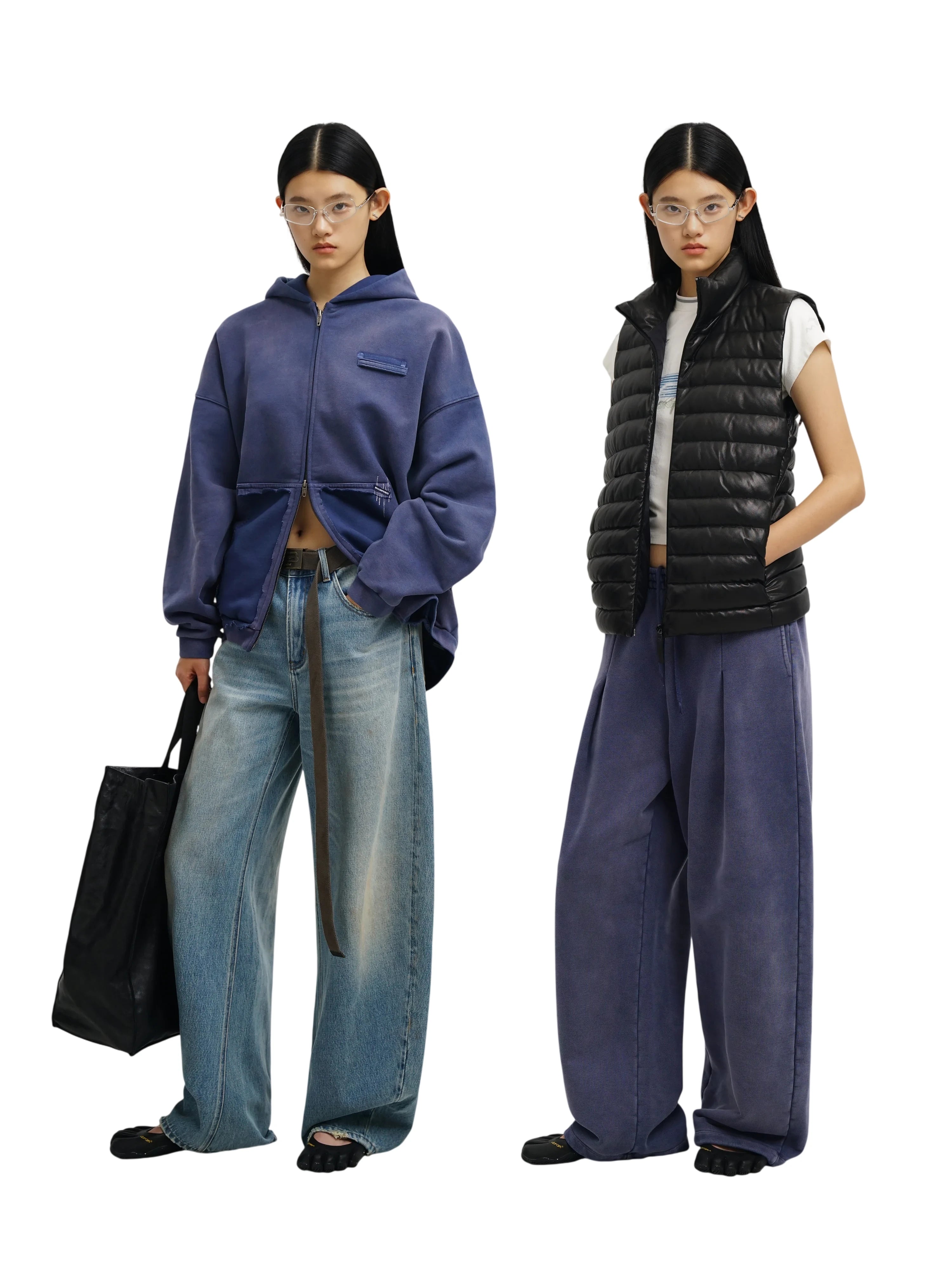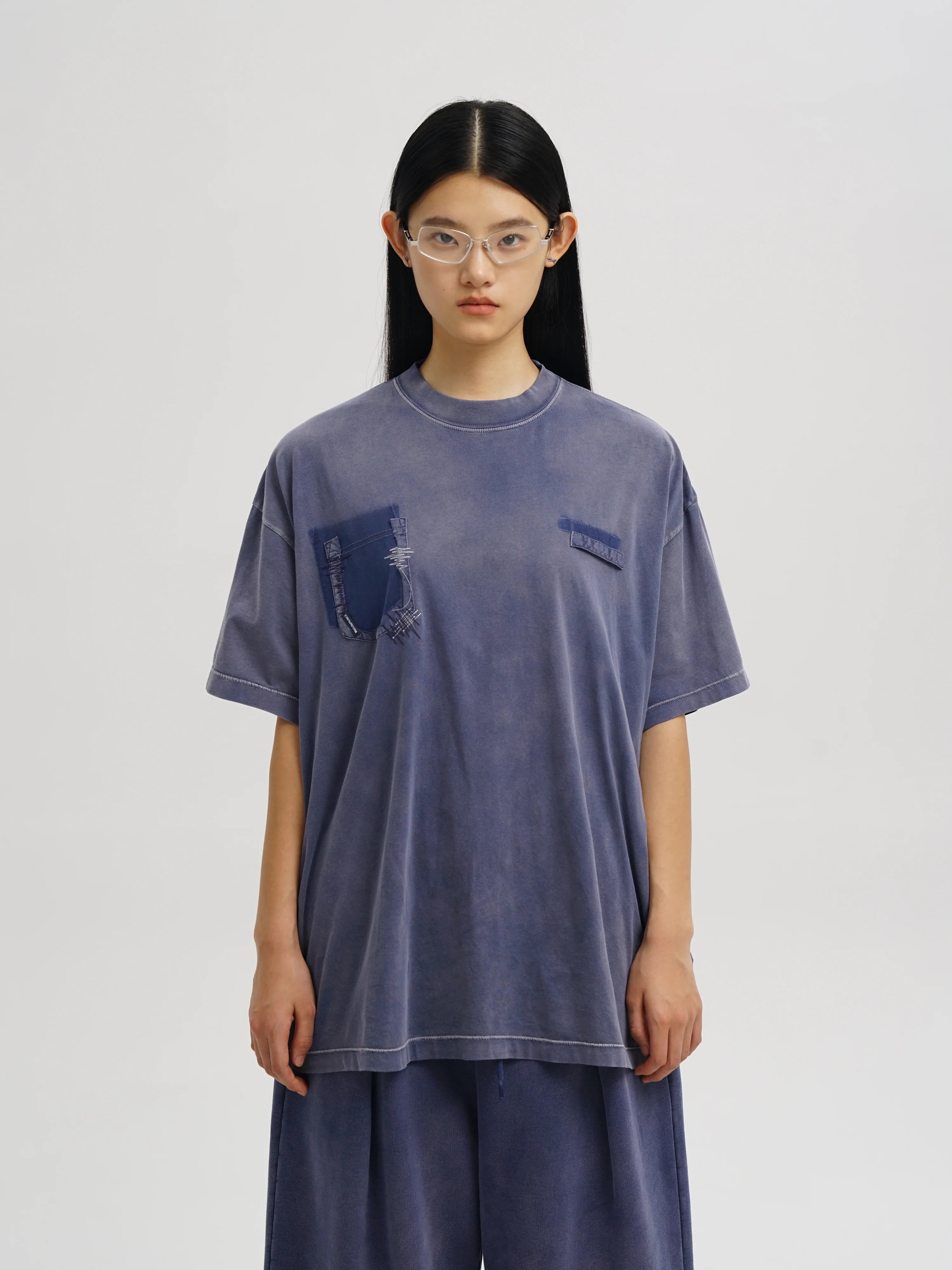 This edgy streetwear set features a washed and distressed design across a short-sleeve t-shirt, sweatshirt, and sweatpants. Designed with damaged stitching details, each piece showcases a worn-in aesthetic perfect for a contemporary, fashion-forward look. The ensemble is styled on male models, combining oversized silhouettes with urban-inspired accessories for a bold presence.