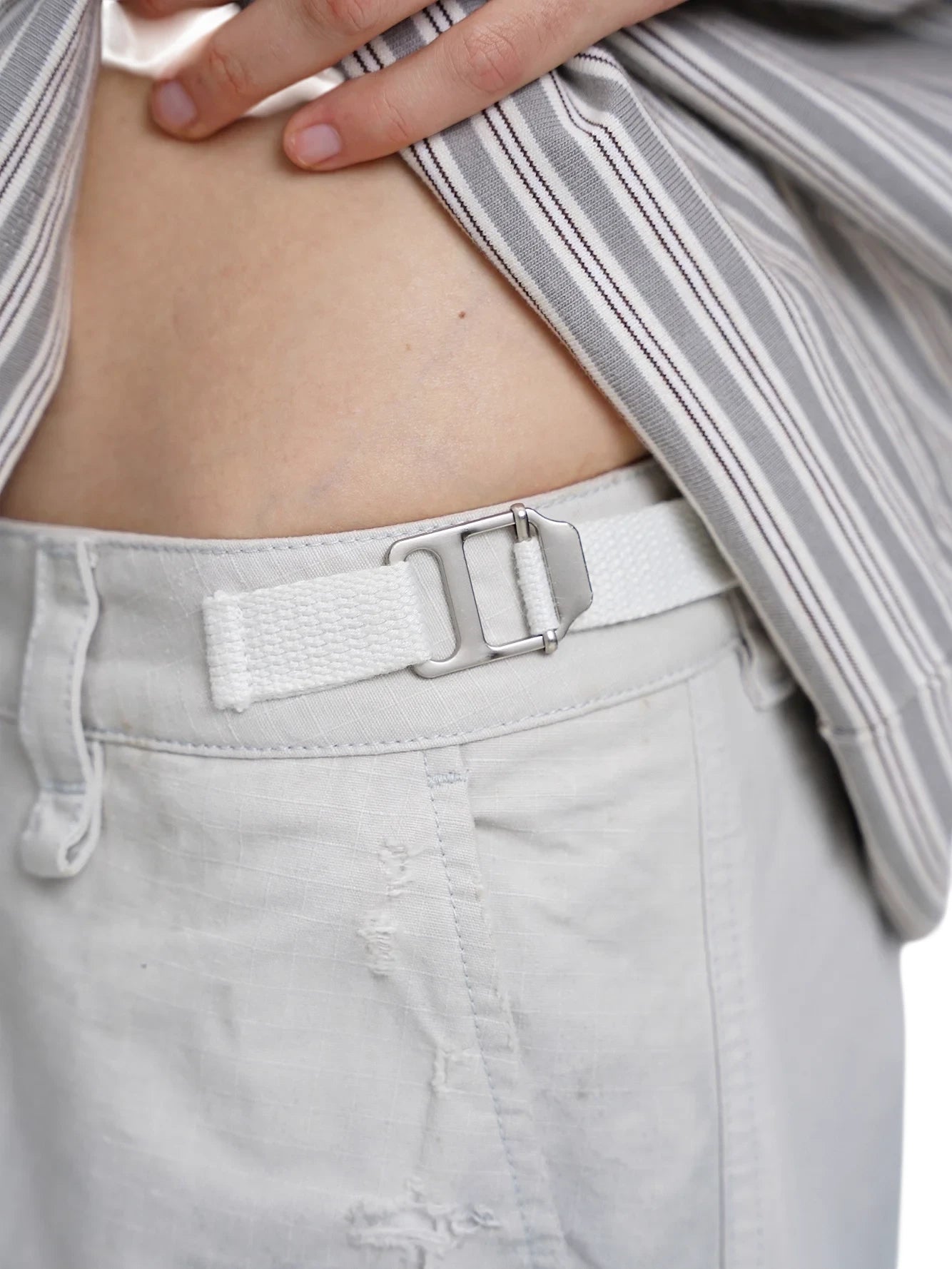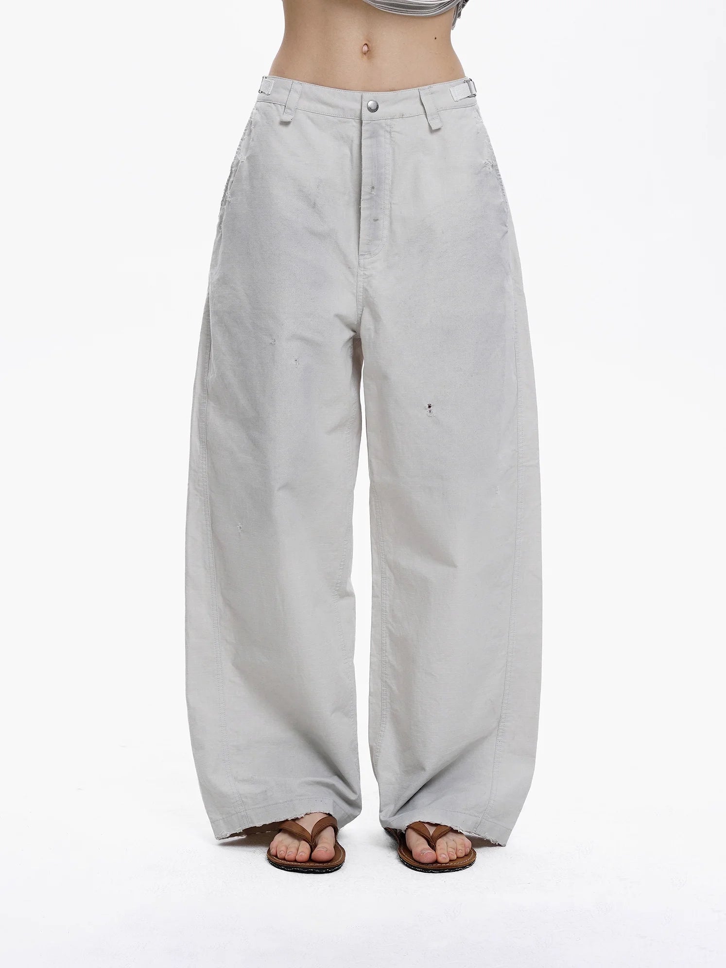 Elevate your casual wardrobe with these relaxed-fit, wide-leg pants designed for effortless style. Crafted from soft, washed cotton, these light grey pants feature a high-waisted silhouette with subtle distressing and a raw, frayed hem. The classic button and zipper closure, along with belt loops, offer functionality while maintaining a laid-back aesthetic. Ideal for casual outings, these women's pants deliver comfort with a worn-in charm.