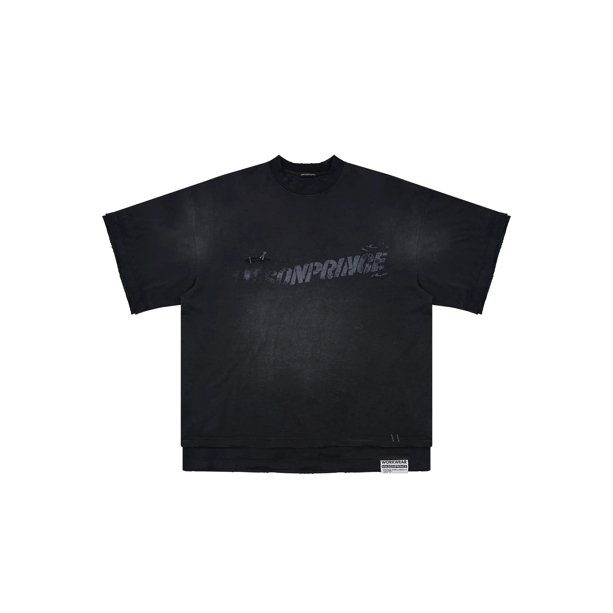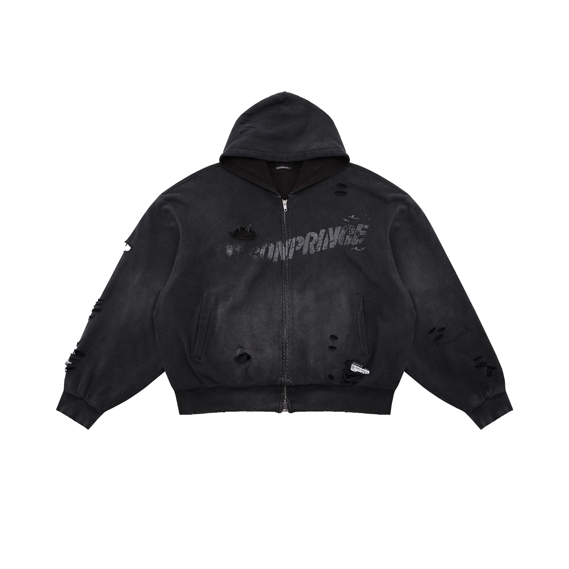 Elevate your streetwear style with this two-piece set featuring a double-layer design and relaxed fit. The set includes a black zip-up hoodie with a distressed, vintage-inspired finish and a bold chest graphic partially spelling "UNPRINC...". The hoodie is completed with standard front pockets and ribbed cuffs for comfort and style.