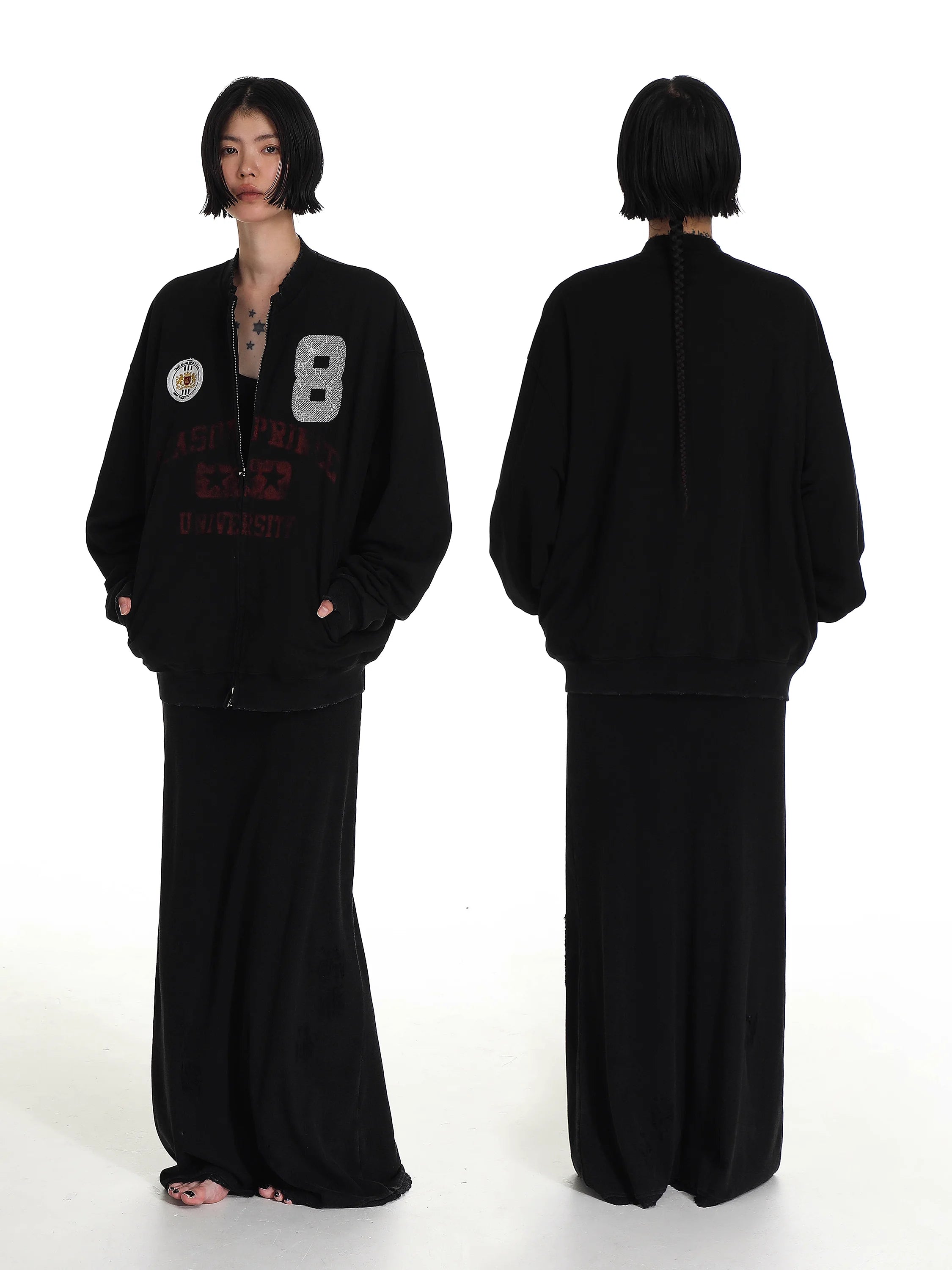 This men's varsity-style jacket features a sleek black exterior with distinctive embroidered and printed details. Standout elements include a sparkling silver number "8" on the right chest, a colorful round patch on the left chest, and faded red collegiate lettering across the front reading "MASONPRINCE UNIVERSITY" with accompanying stars and varsity-inspired graphics. Designed with a premium double-layer construction, it offers warmth and structure. Ribbed cuffs and hem add comfort and style, while side pockets provide practical storage. Perfect for a sporty yet street-ready look.