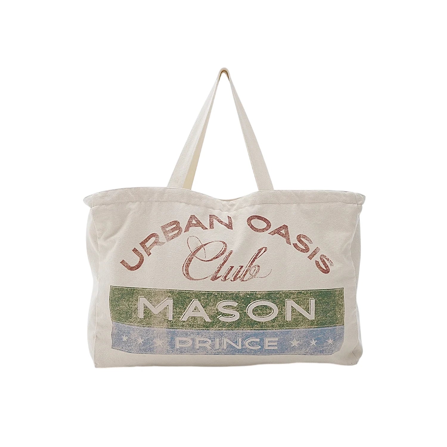 This spacious unisex canvas tote bag features a boxy silhouette in a neutral off-white tone, ideal for versatile everyday use. With bold graphic text on the front in green, brown, and blue that reads "URBAN OASIS Club MASON PRINCE," it offers a contemporary style perfect for day trips, shopping, or beach outings.