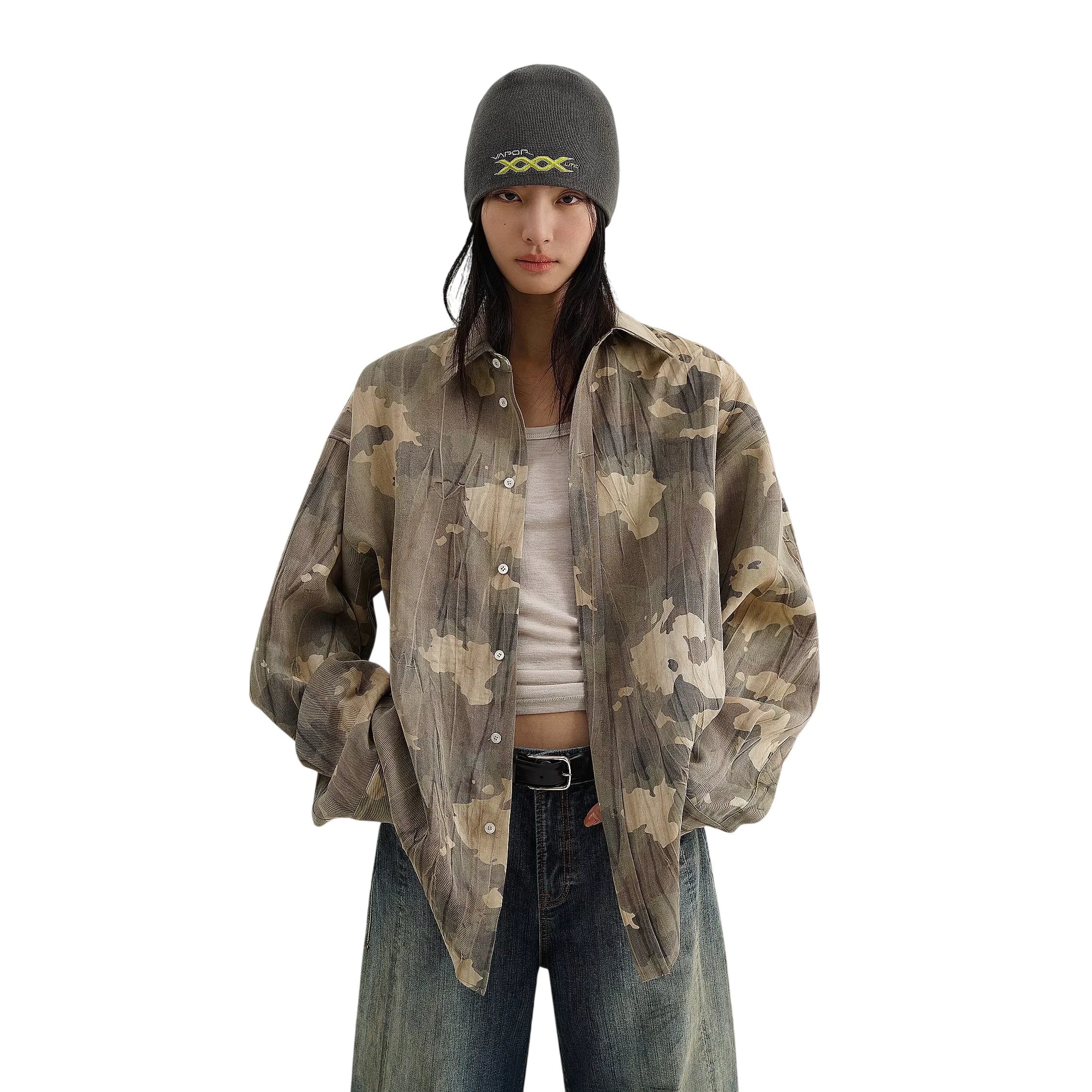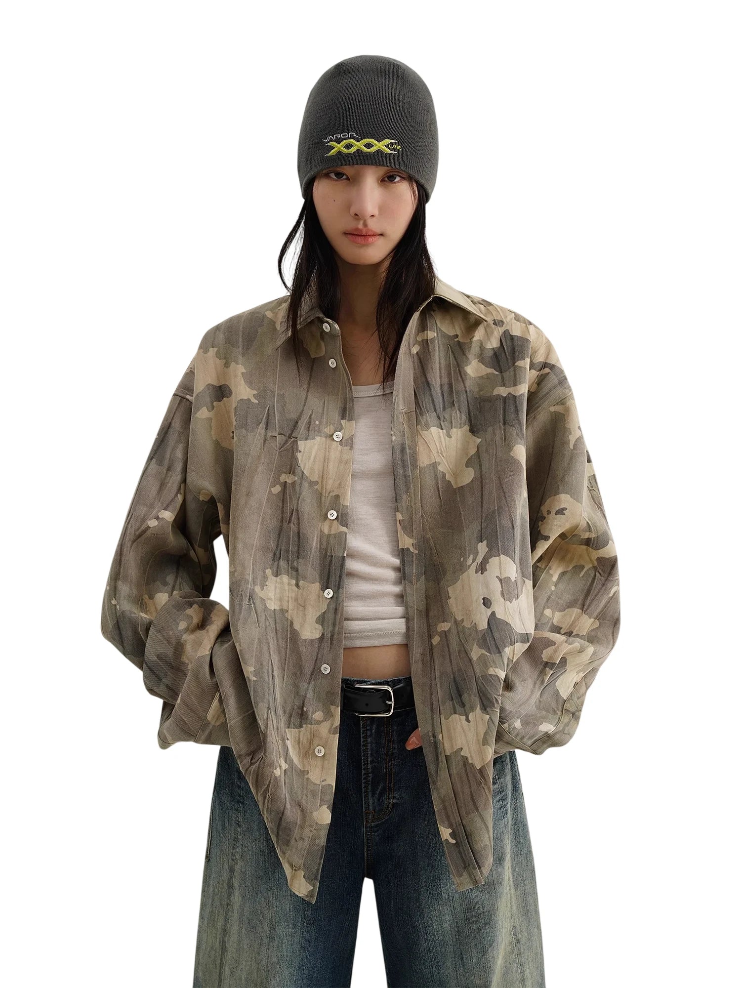 This gender-neutral shirt features a relaxed, oversized silhouette with a naturally crinkled texture made from soft Tencel fabric. Showcasing a muted camouflage print in earthy tones of brown, beige, and grey, it includes a classic pointed collar and long sleeves. Layered effortlessly over a ribbed tank top and styled with high-waisted jeans, this piece captures a laid-back, streetwear-inspired aesthetic.