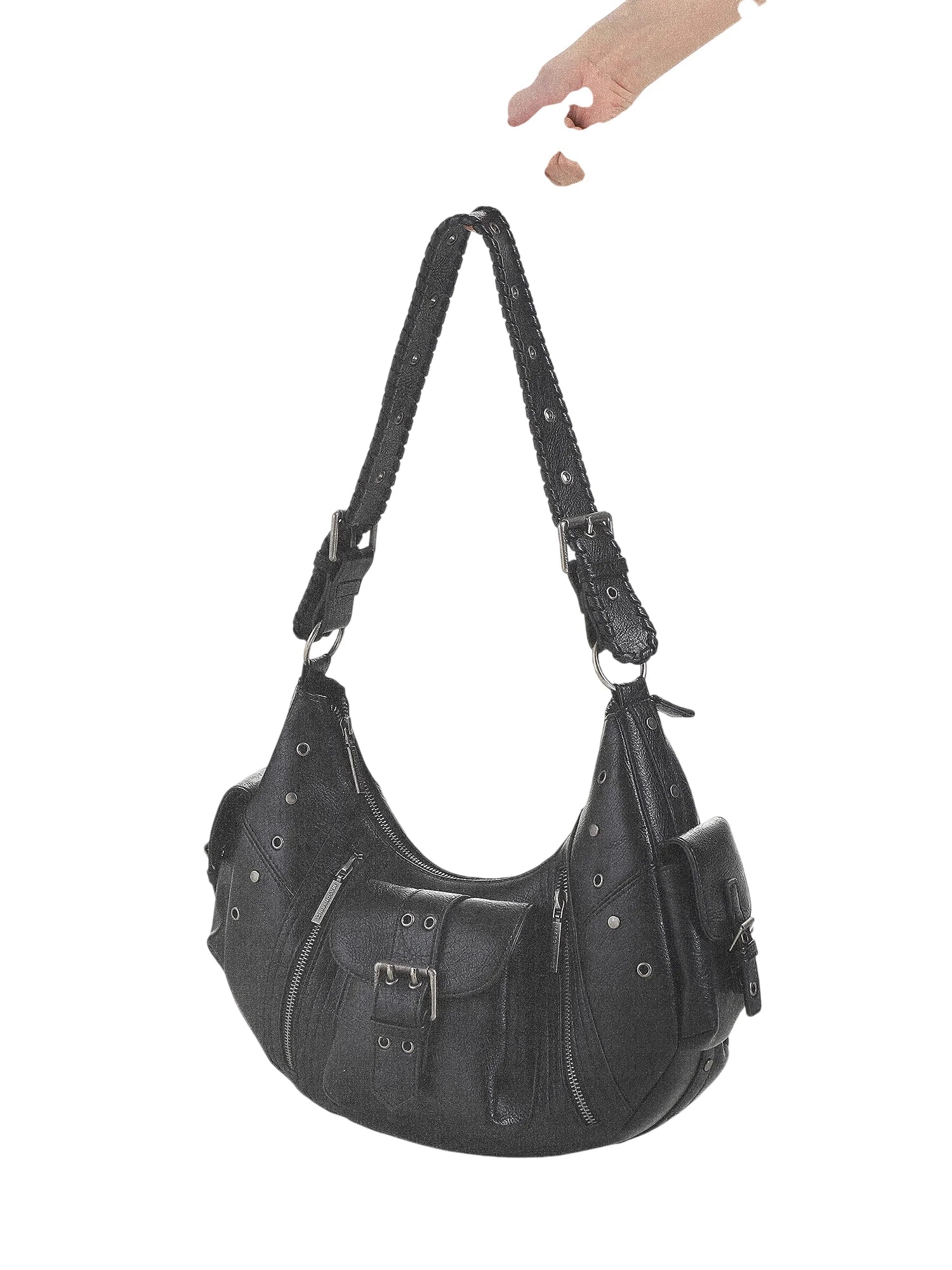 This women's crossbody motorcycle bag features a sleek crescent-shaped silhouette crafted from high-quality glossy faux leather. Designed for both style and function, it showcases multiple metallic zippered compartments, a central flap pocket with a decorative buckle, and studded detailing for an edgy urban look. The braided shoulder strap adds a unique touch, while side pockets enhance practicality. Perfect for casual or streetwear outfits, this fashion-forward bag combines utility with contemporary appeal.