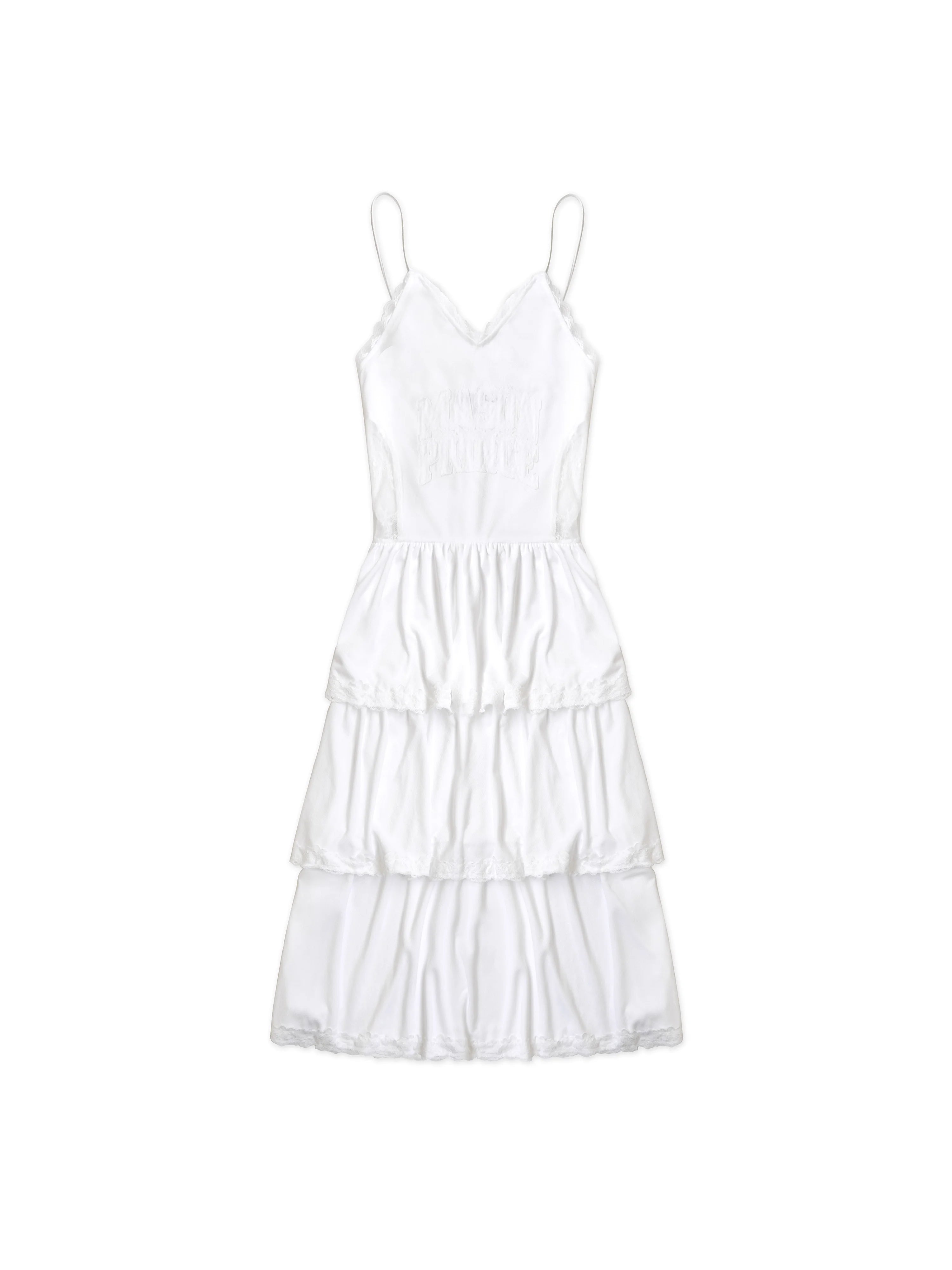 This women's long white dress features delicate lace mesh detailing and thin spaghetti straps, offering a light and romantic design. The fitted bodice flows into a tiered, multi-layered skirt, creating a soft, airy silhouette perfect for casual or semi-formal occasions. The subtle lace accents along the neckline and tiers enhance the dress's feminine charm.