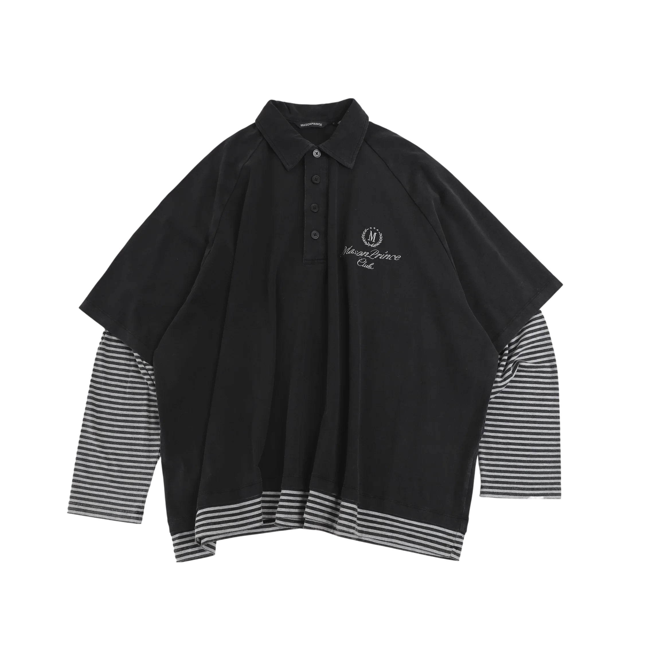 MASONPRINCE Layered Black Knit Polo Shirt with Striped Long Sleeves