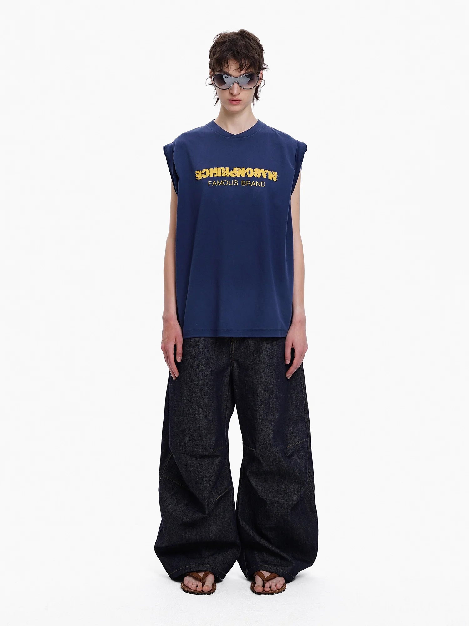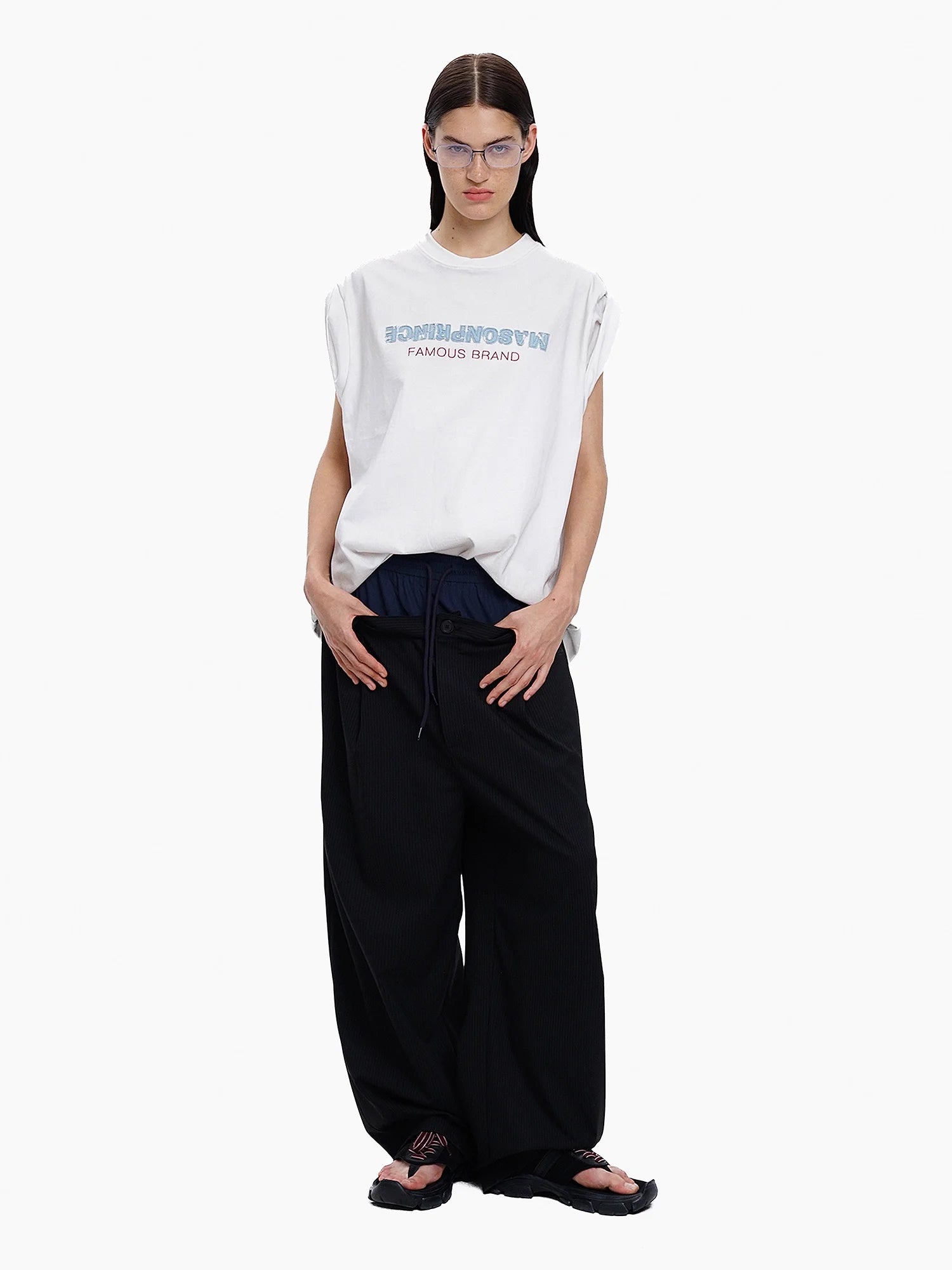 This women's sleeveless tee delivers a bold, street-inspired aesthetic with a relaxed fit and urban edge. Featuring a layered collar detail and reversible styling, it showcases embroidered appliqué text in a mirrored format reading "FAMOUS BRAND" across the front. The rolled sleeves enhance its laid-back appeal, making it perfect for pairing with high-waisted bottoms for a versatile, contemporary look.